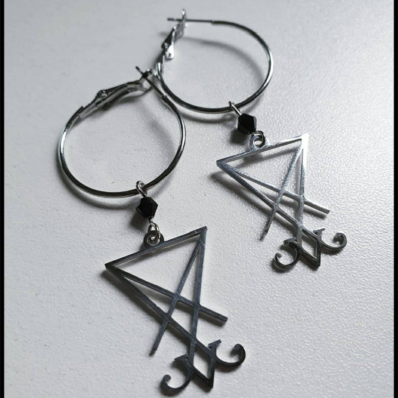 Пару античное серебро цветные серьги-кольца выполнены с черное стекло хрустальные бусины и нержавеющая сталь sigil of Lucifer подвески. Они очень легкие и удобные.