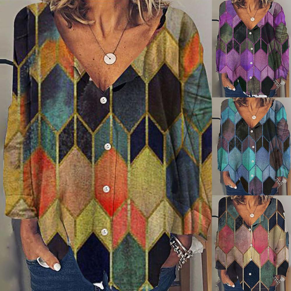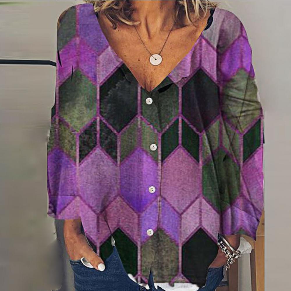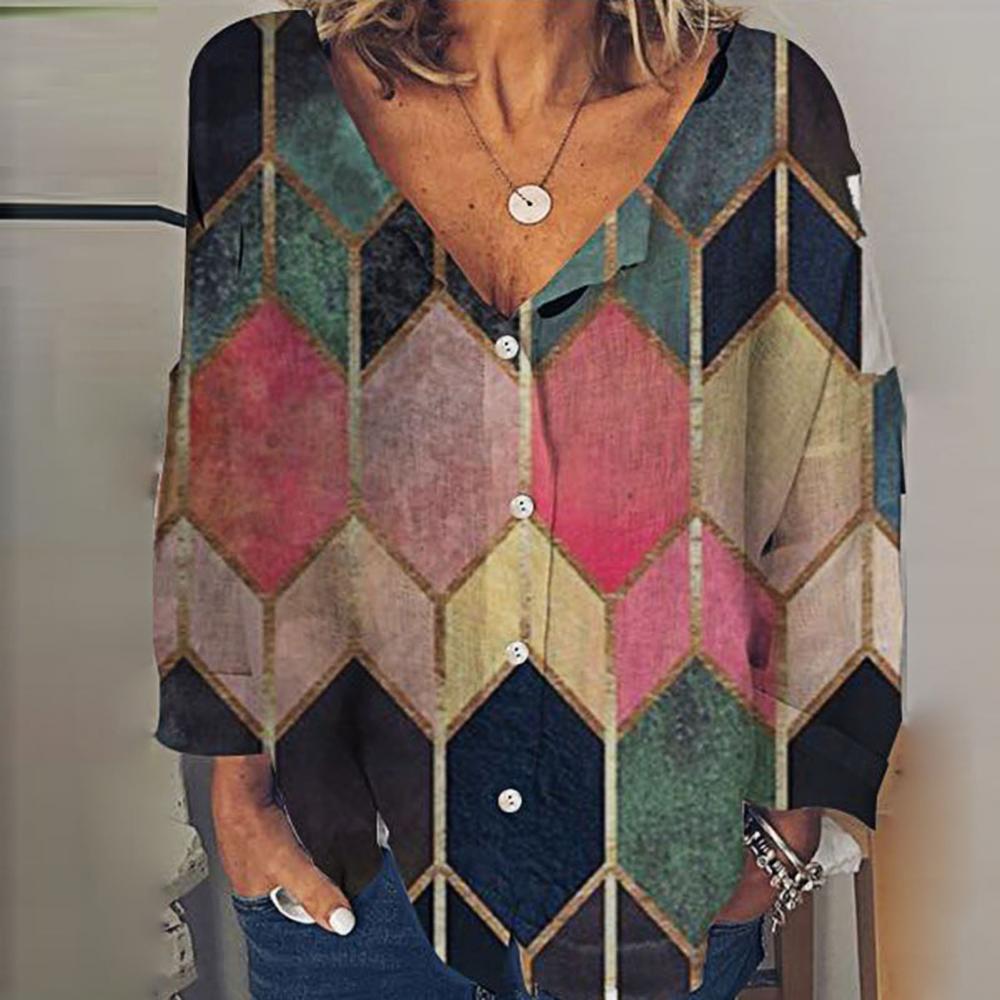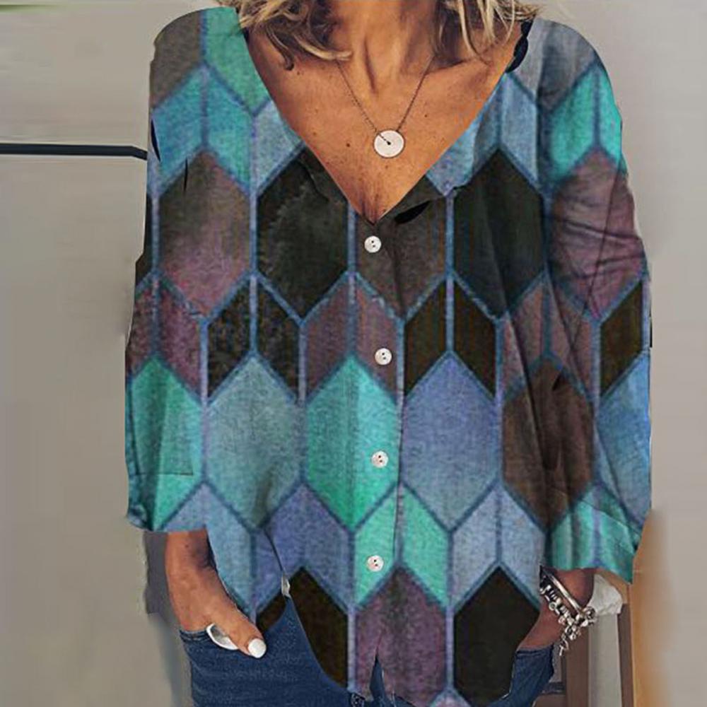 Женская рубашка с геометрическим шестигранным принтом, Свободный Топ с глубоким V-образным вырезом и пуговицами, Повседневная Блузка с длинными рукавами на лето-осень6,88-8,67 долларов США/штука