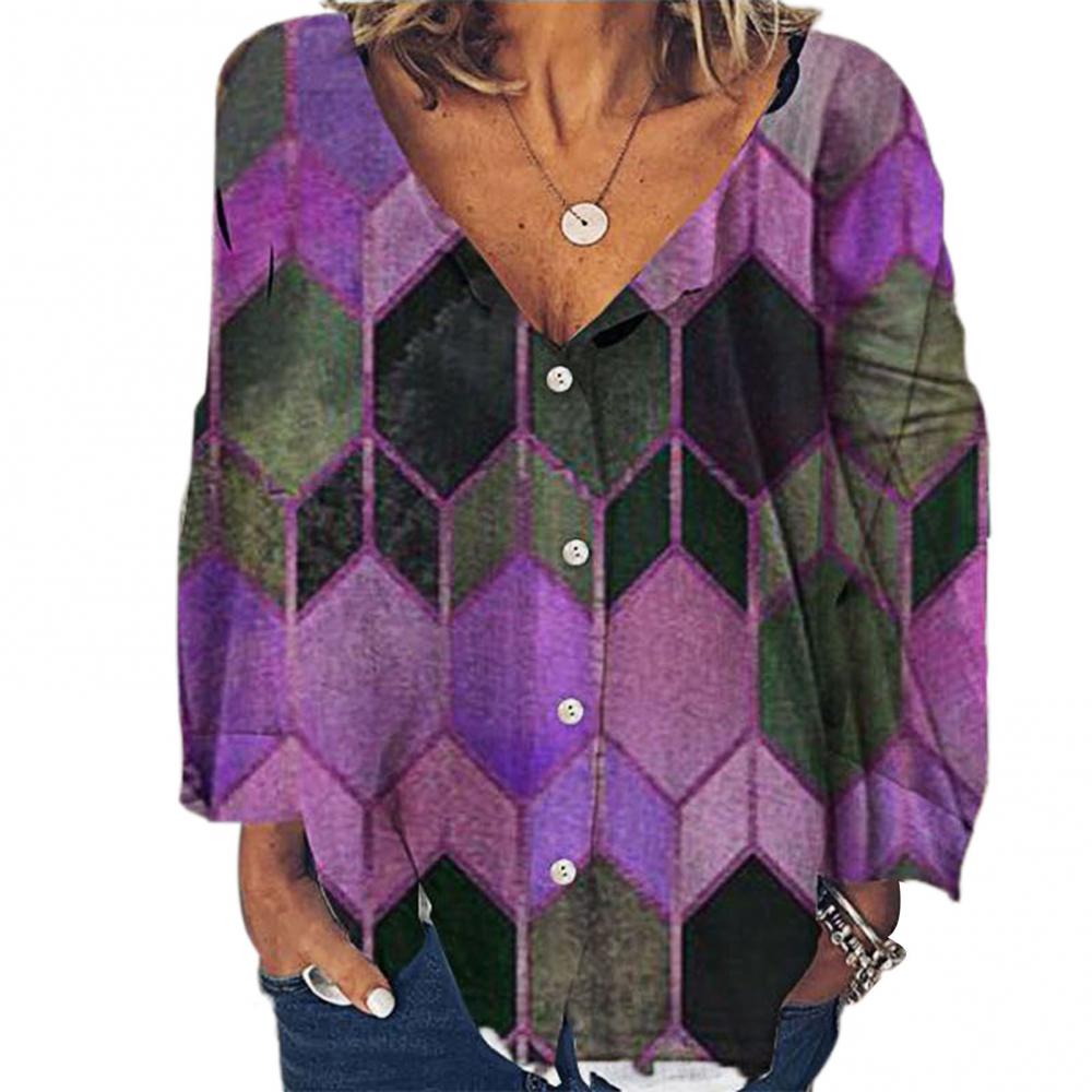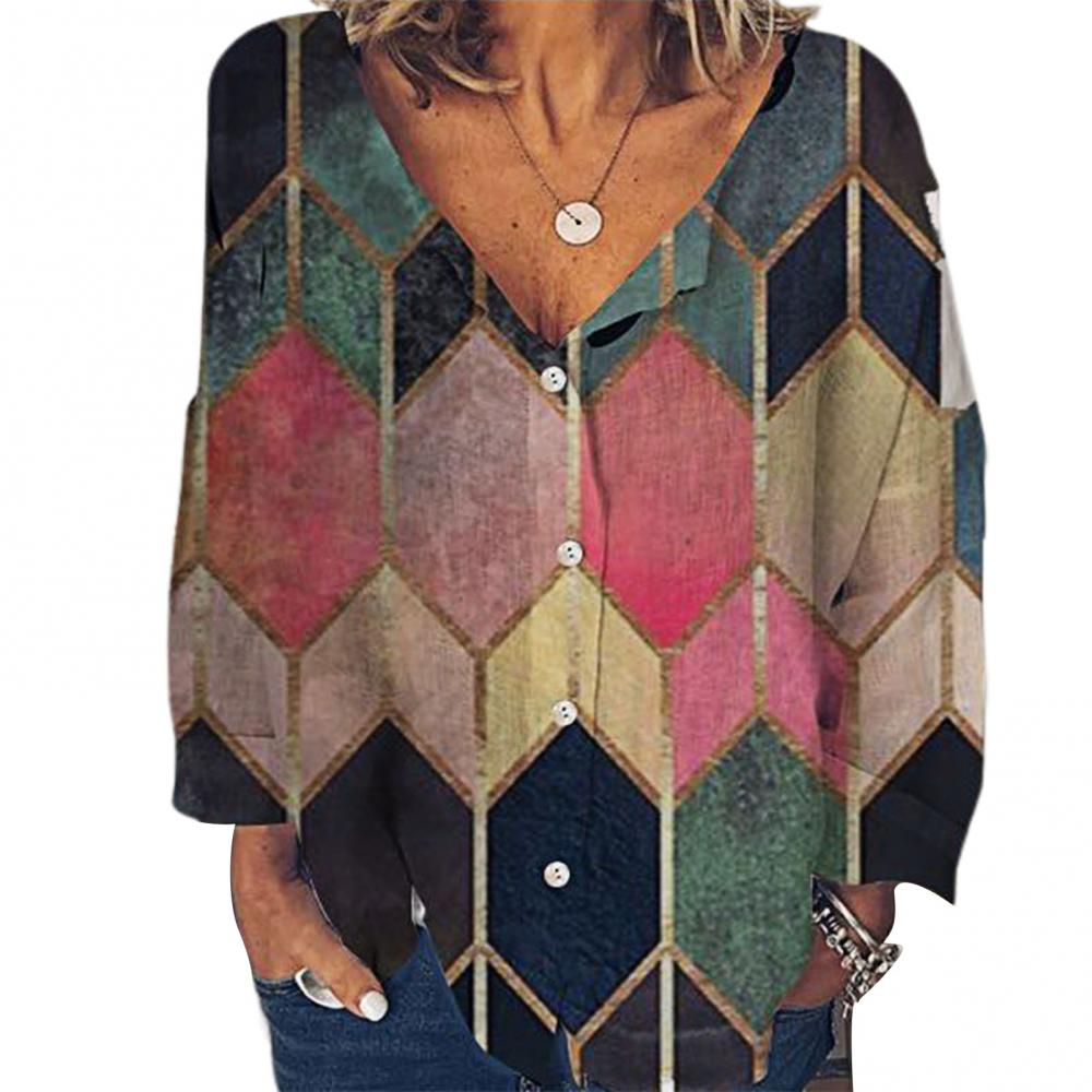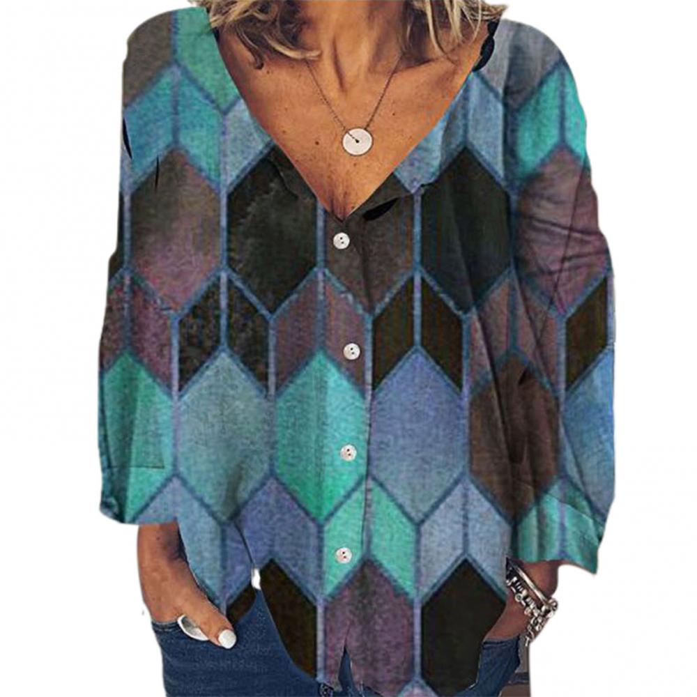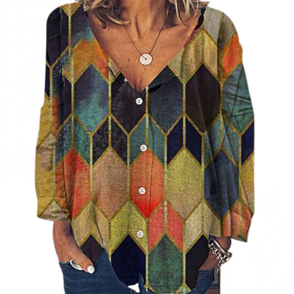 Женская рубашка с геометрическим шестигранным принтом, Свободный Топ с глубоким V-образным вырезом и пуговицами, Повседневная Блузка с длинными рукавами на лето-осень6,88-8,67 долларов США/штука