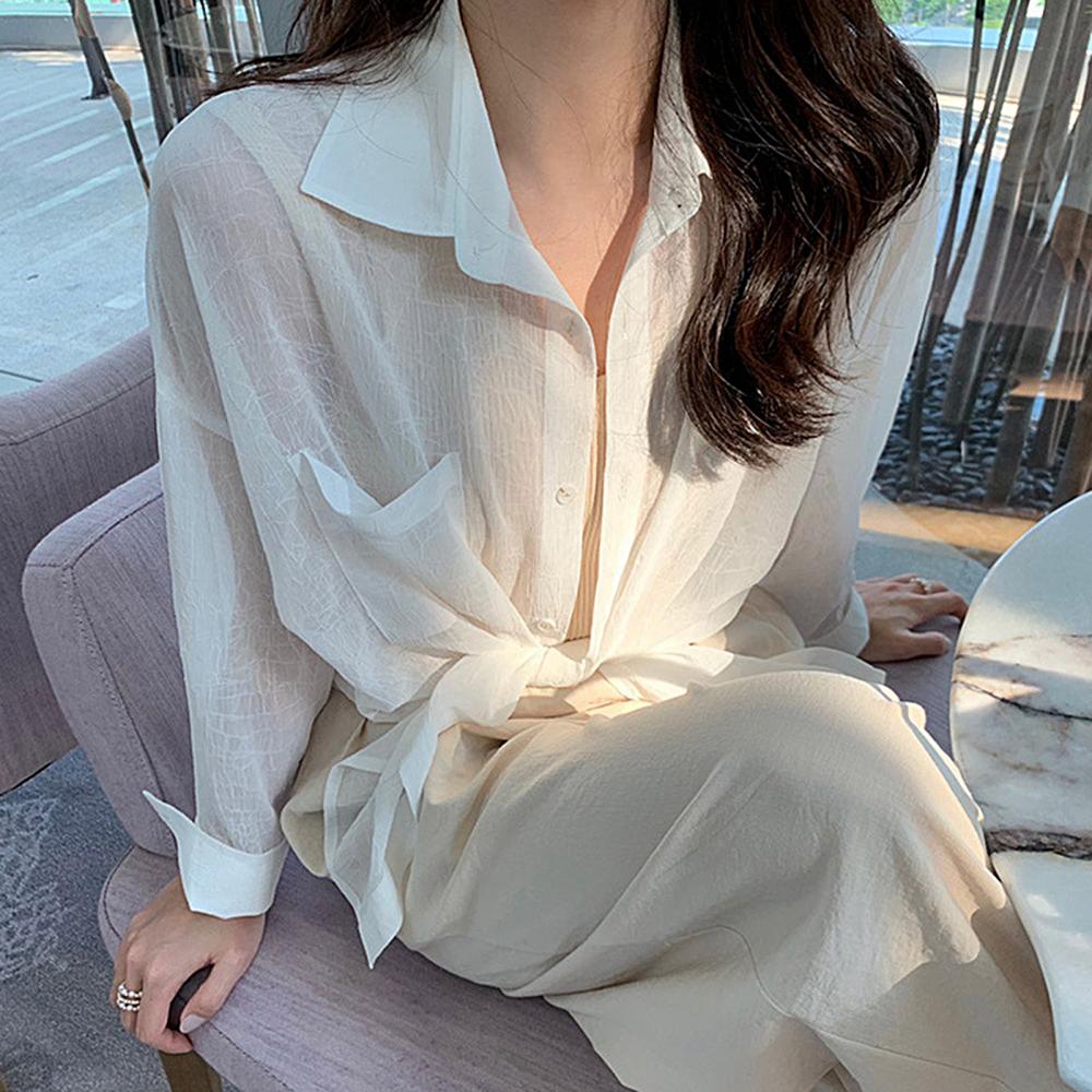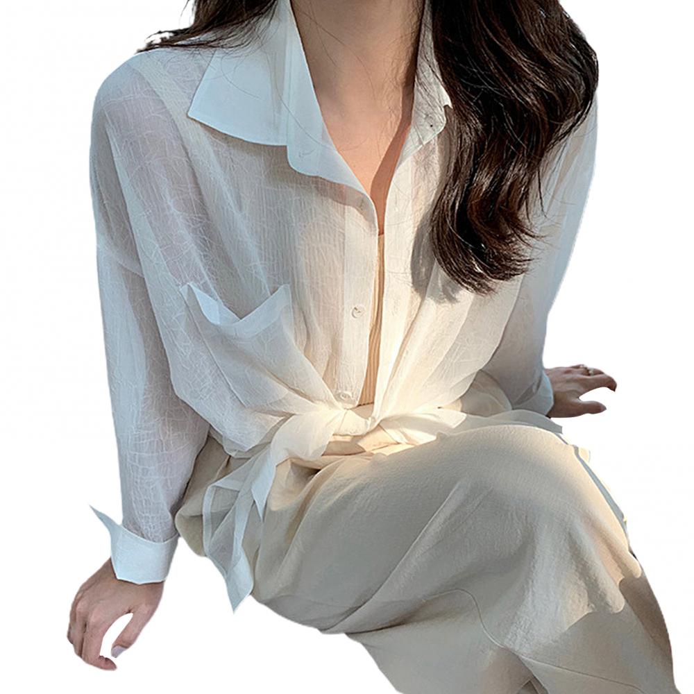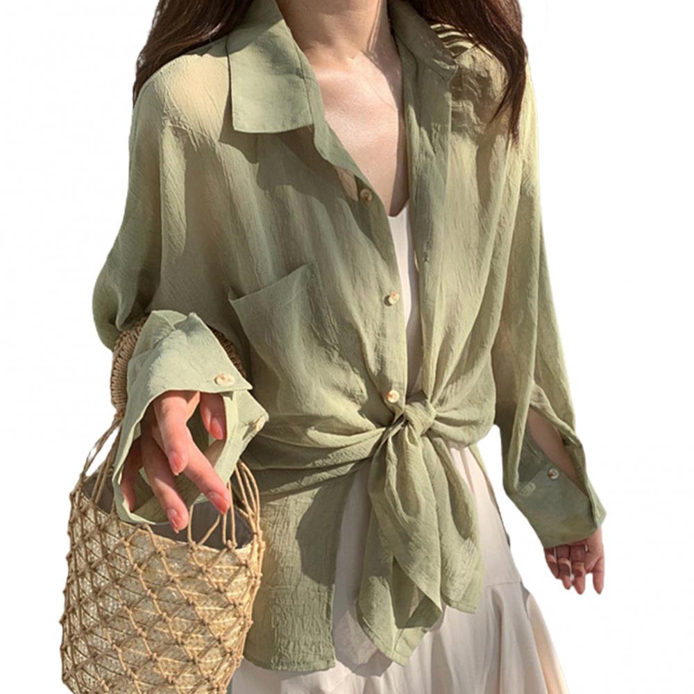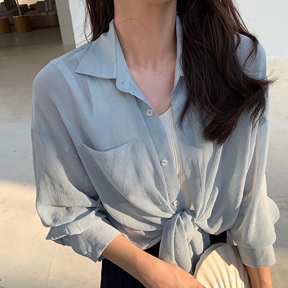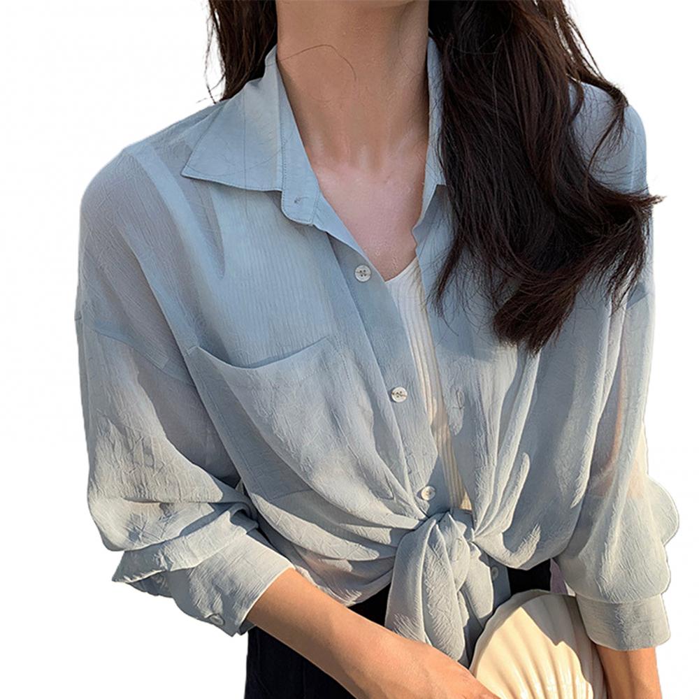 Женская Тонкая блузка с длинными рукавами и отложным воротником и карманами