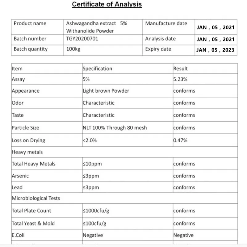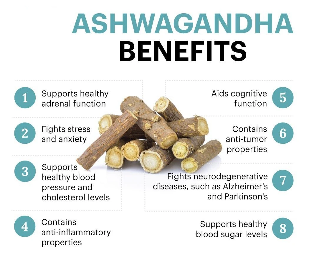 Ashwagandha называется «индийский женьшень». Содержит алкалоиды, стероидальные лактоны, витамины и железо. Он имеет функцию анти-аллергии, анти-бактерий, анти-пиретик и обезболивания.