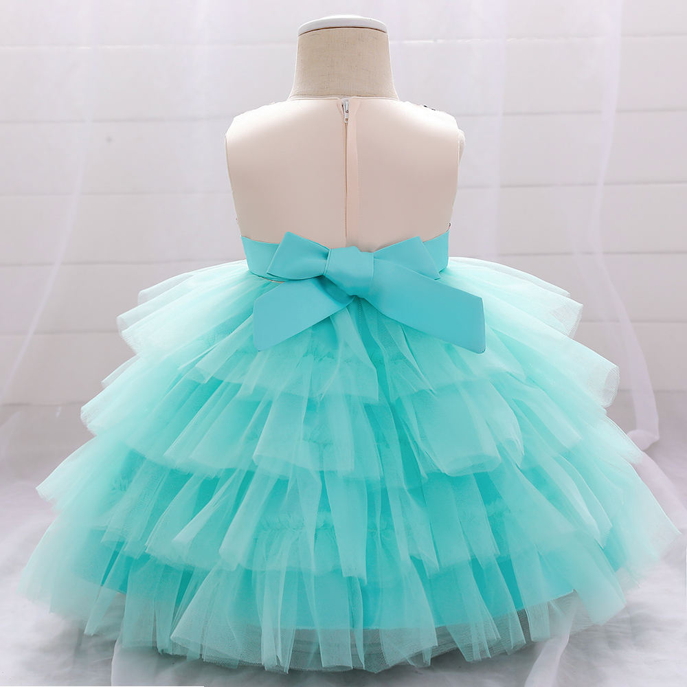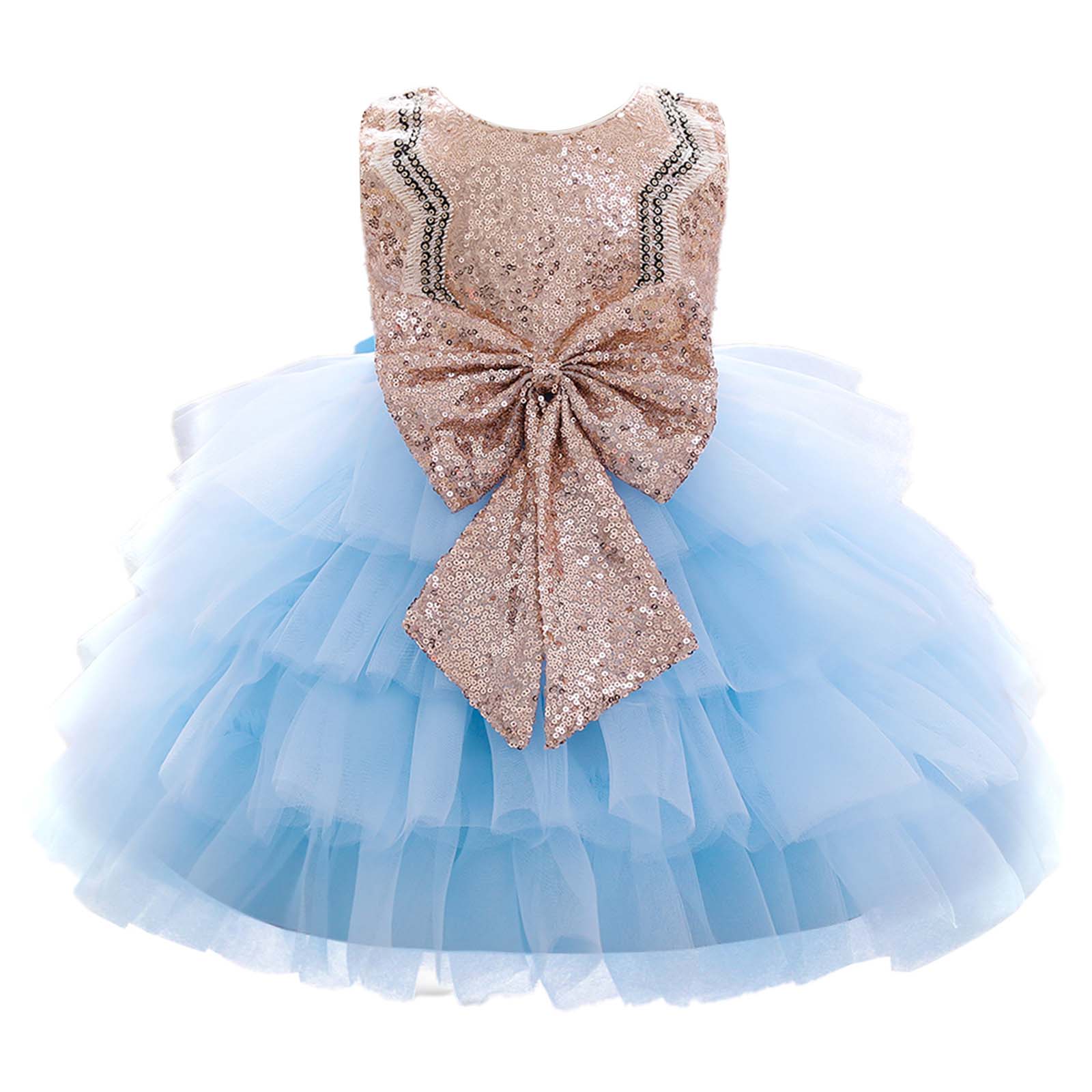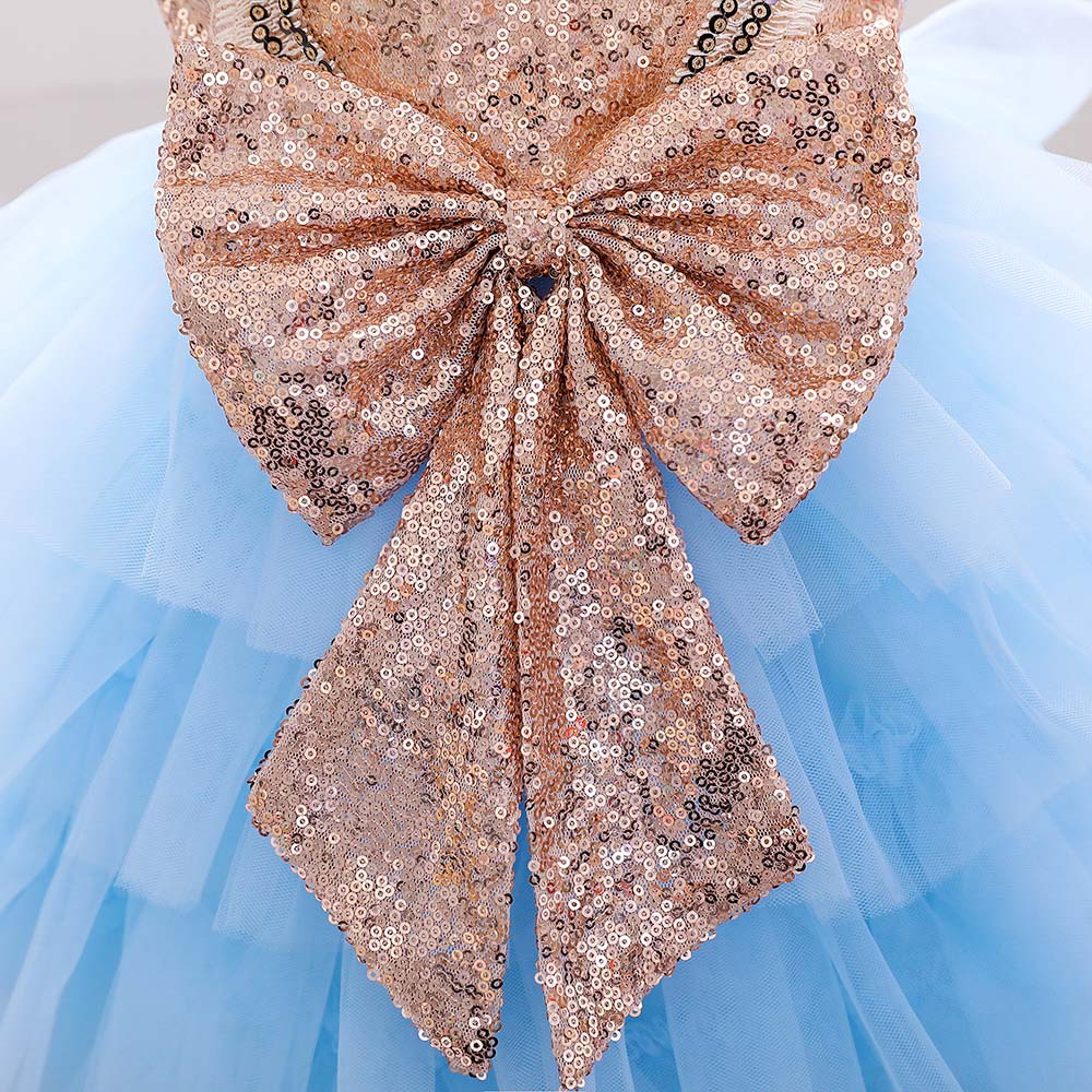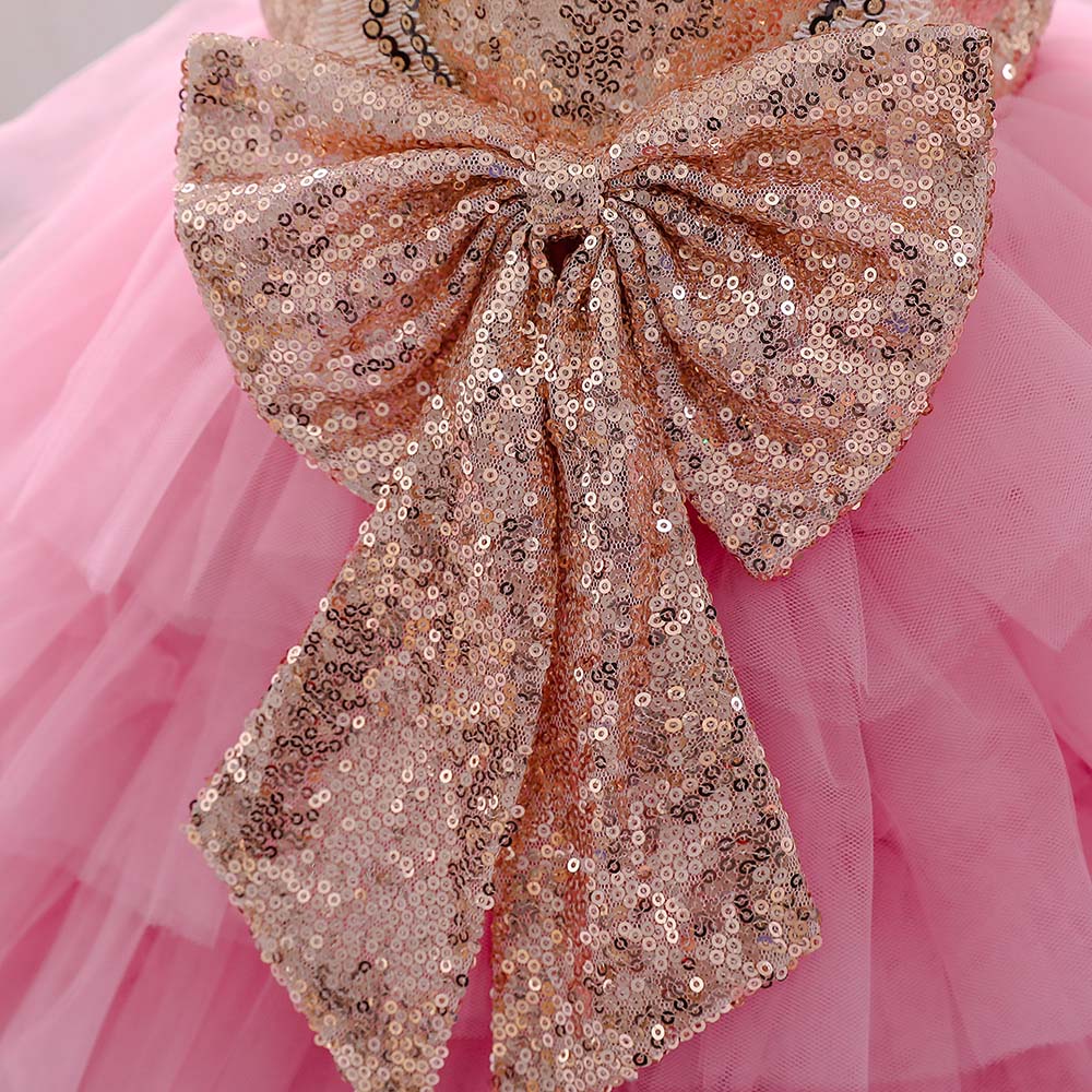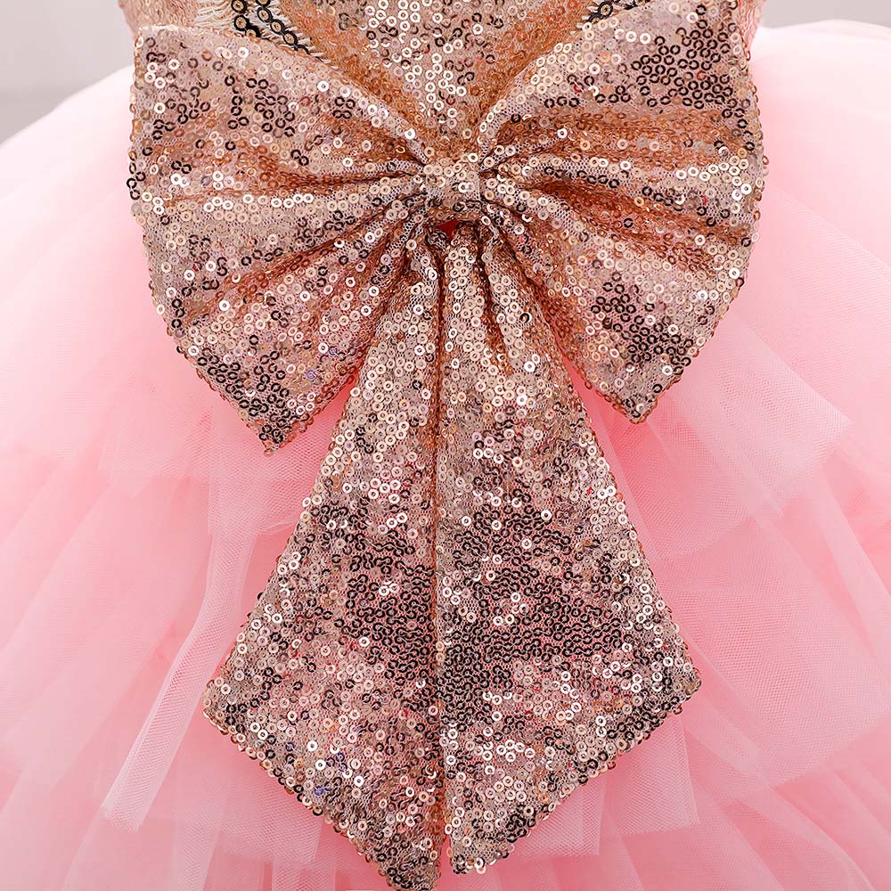 Платье с круглым вырезом, без рукавов, блестками сверху и большим бантом на талии спереди, многоуровневым подолом, застежкой-молнией и поясом сзади.