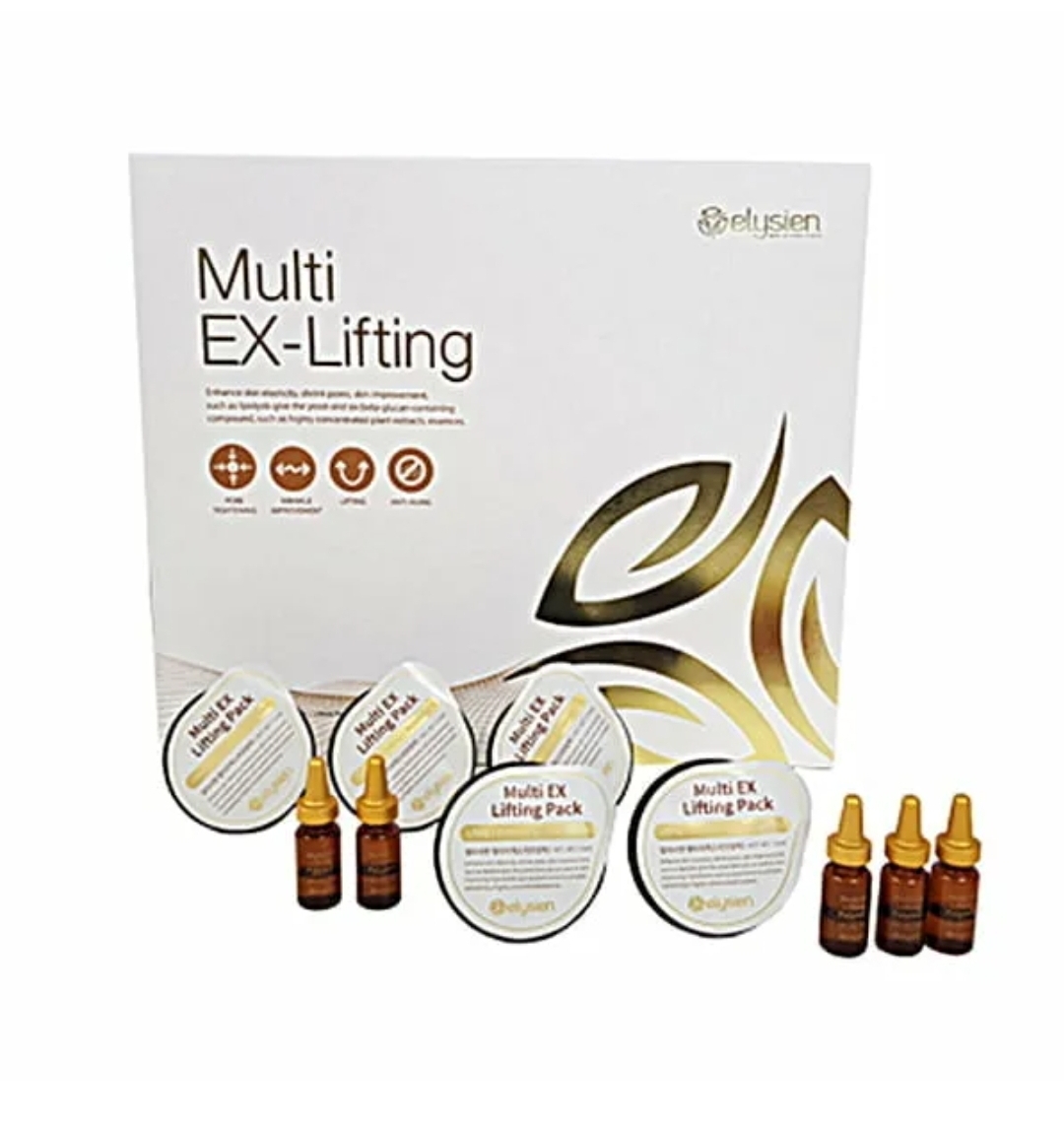 Elysien Multy EX-Lifting набор из пяти масок комплексного действия, содержащих сложно структурированный нейро-пептидный комплекс: Acetyl hexapeptide-8, rh-Oligopeptide-1, sh-Decapeptide-7, sh-Octapeptide-4, sh-Oligopeptide-9, sh-Pentapeptide-19, sh-Oligopeptide-1, sh-Oligopeptide-2, sh-Polypeptide-1, sh-Polypeptide-22, а также аденозин, бета-глюкан, центелы азиатской, шлемника байкальского, горца гребенчатого, экстракты семян и растений: иван-чая, розмарина, лакрицы, листьев зеленого чая, ромашки, горных цветов.