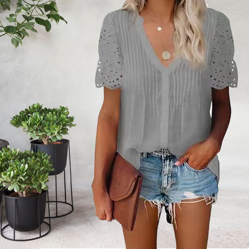 Летняя Удобная элегантная кружевная рубашка с рукавами-лепестками, однотонная Повседневная модная Свободная Женская рубашка с v-образным вырезом и короткими рукавами, 2021