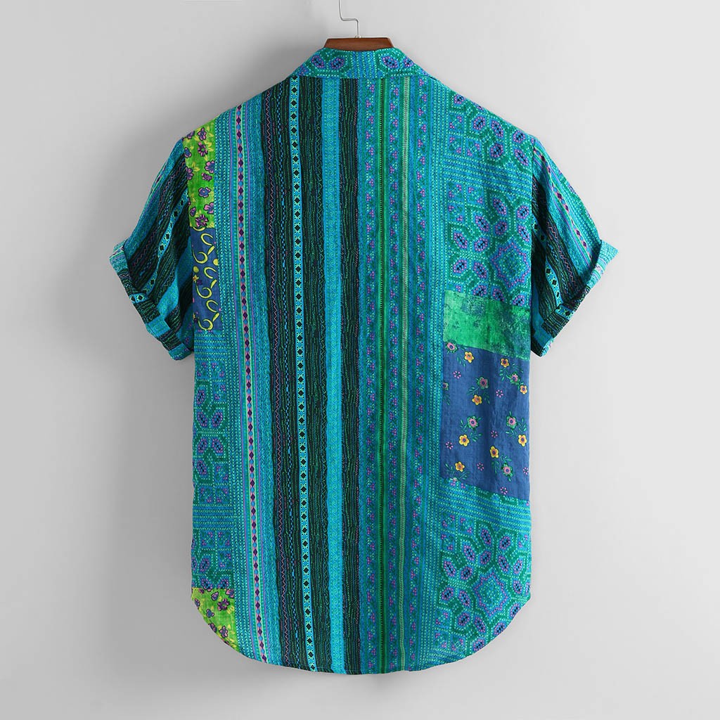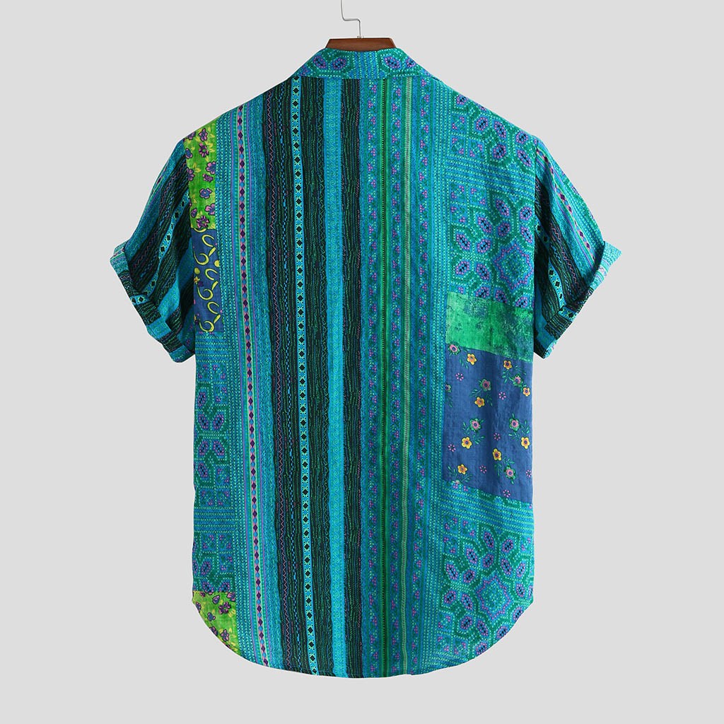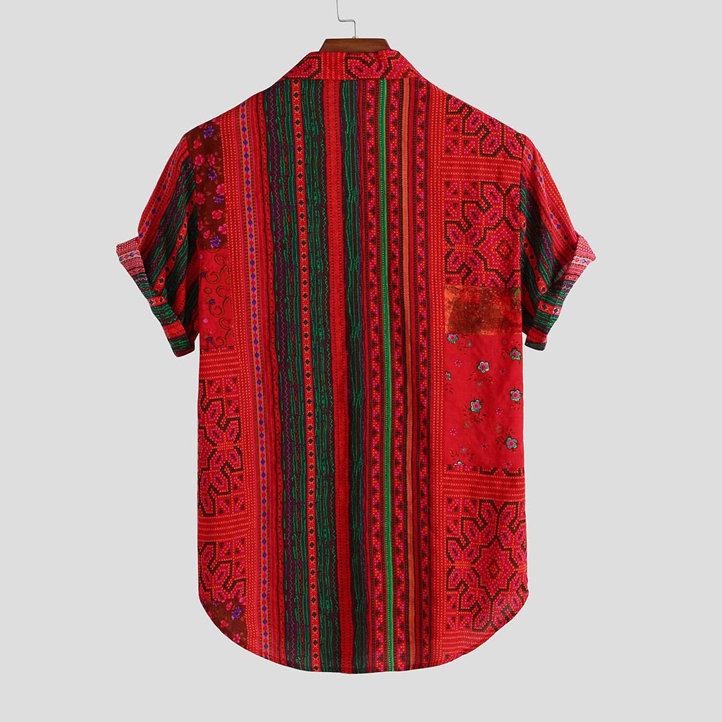 Mens Vintage Ethnic Printed Turn Down Collar Short Sleeve Loose Casual Shirts