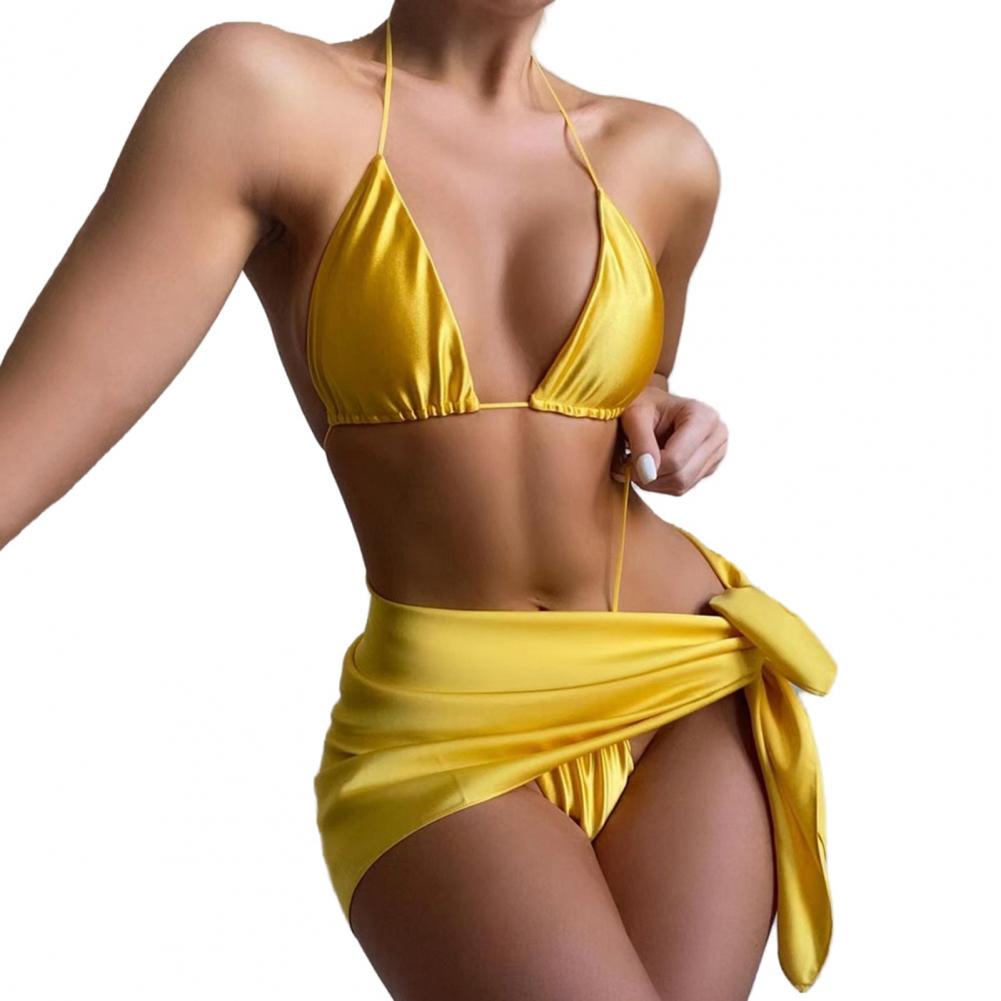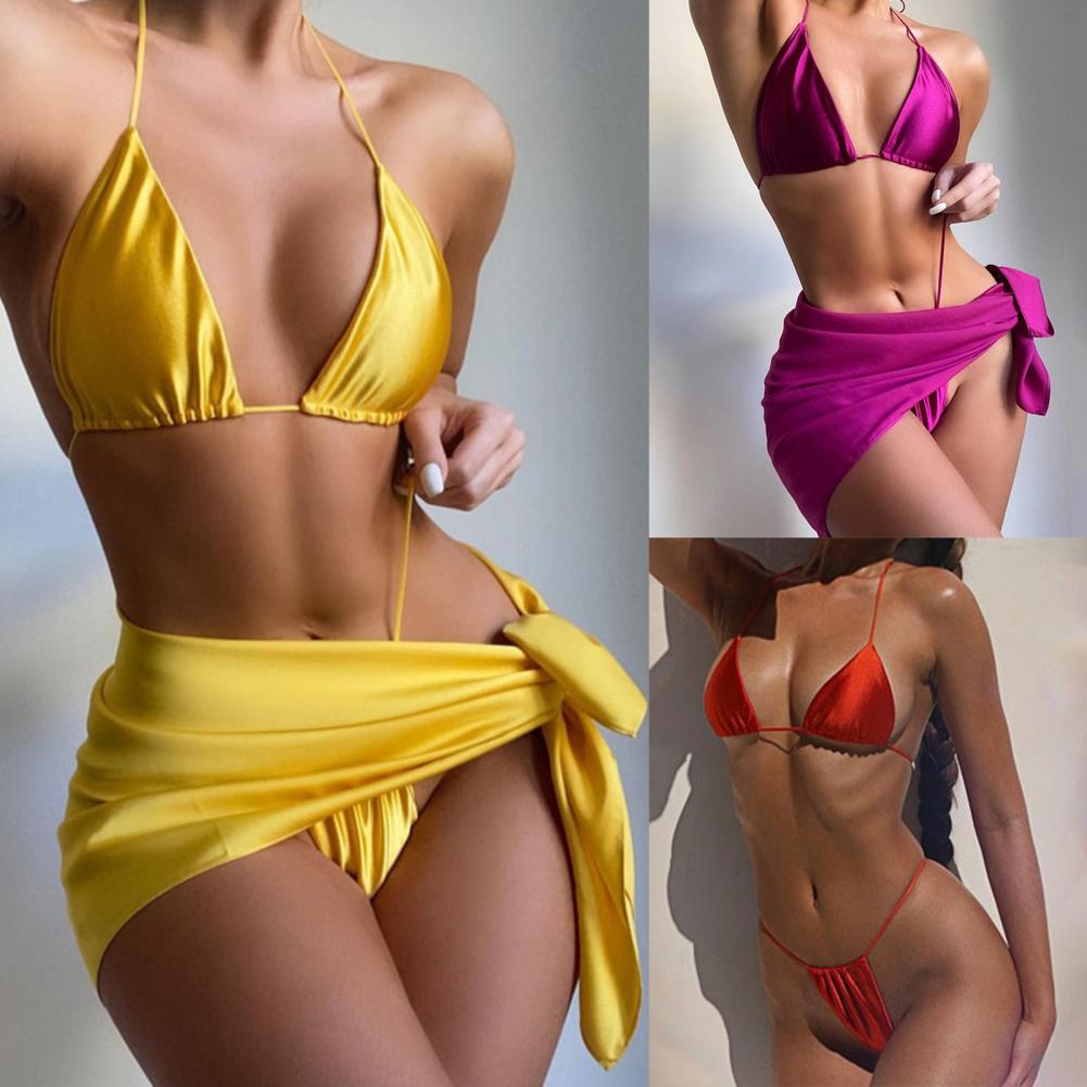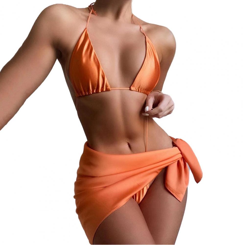 Женский купальник, бюстгальтер с лямкой на шее, с низкой посадкой, накидка на стринги, однотонный Комплект из трех предметов, бикини, купальник для плавания