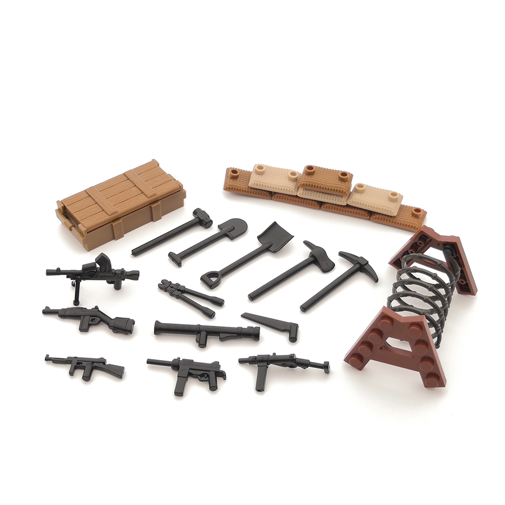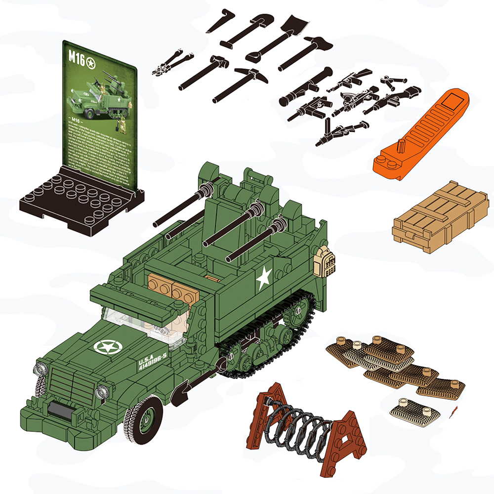 Продукт также включает в себя 3 солдата, различные инструменты и оружие, в общей сложности 518 шт блоков, 1 подробные инструкции
