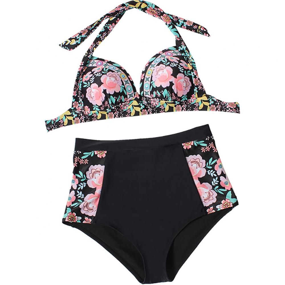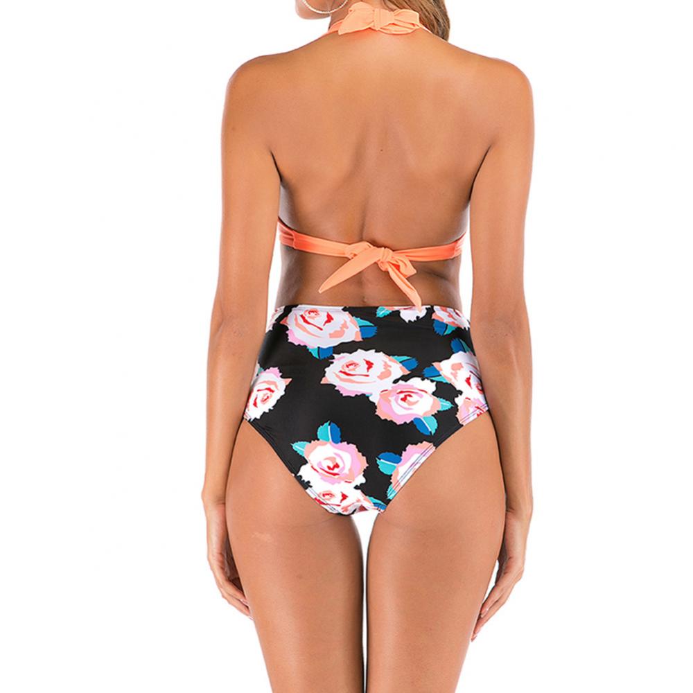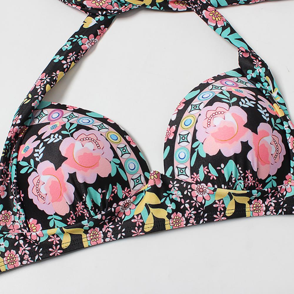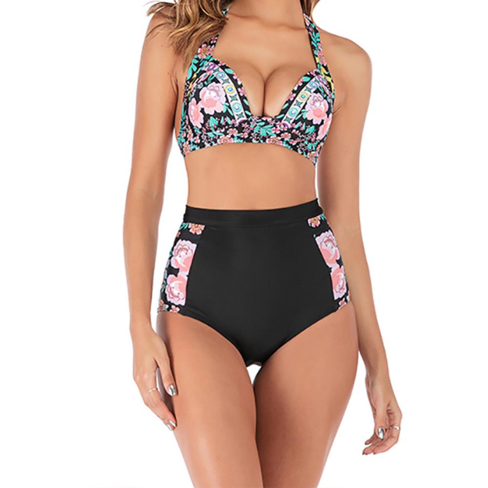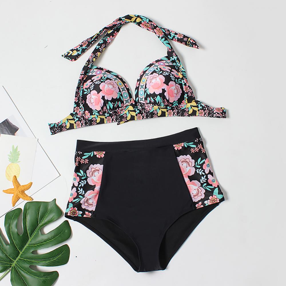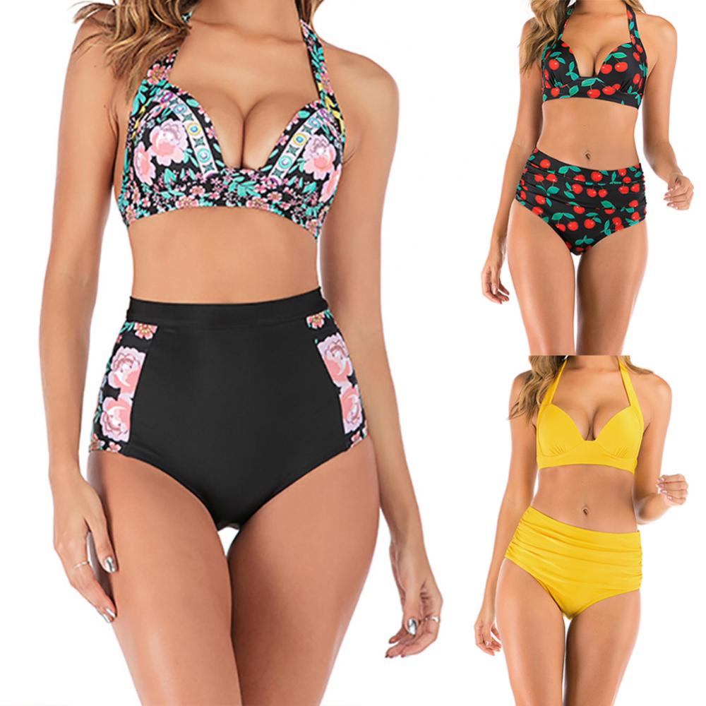 Женский сексуальный купальник с цветочным принтом, комплект бикини без подкладки, бюстгальтер с лямкой на шее, трусы с высокой талией