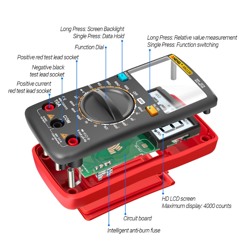 Измерьте напряжение переменного/постоянного тока, ток переменного/постоянного тока, сопротивление, емкость, диод, Непрерывное тестирование, частоту и т. д.