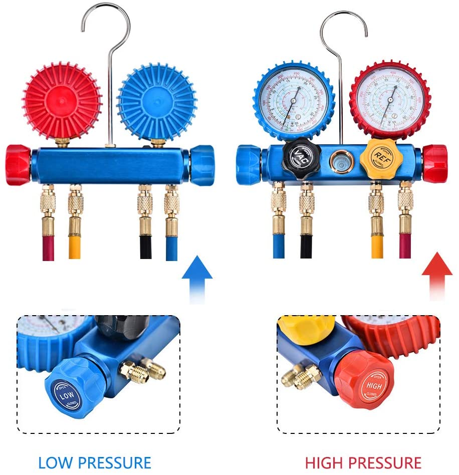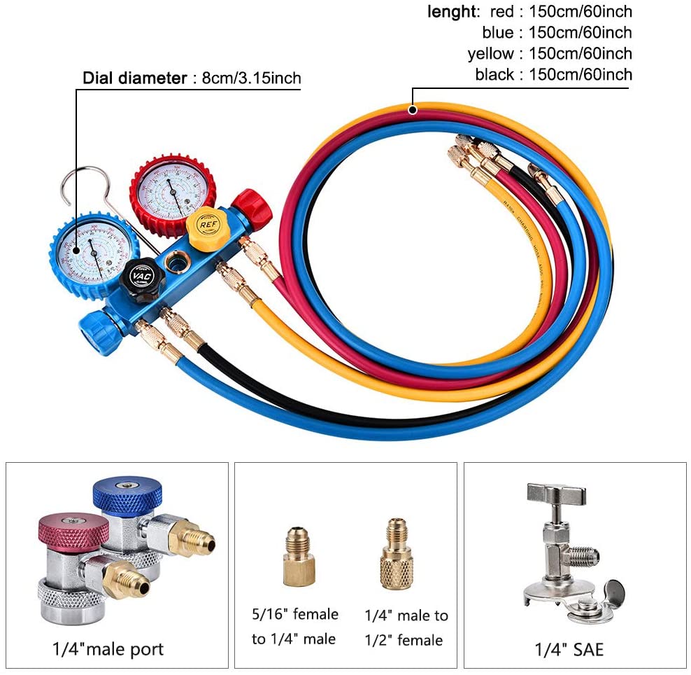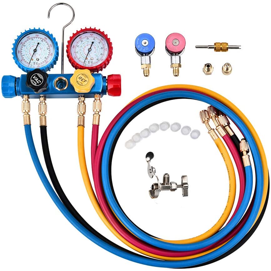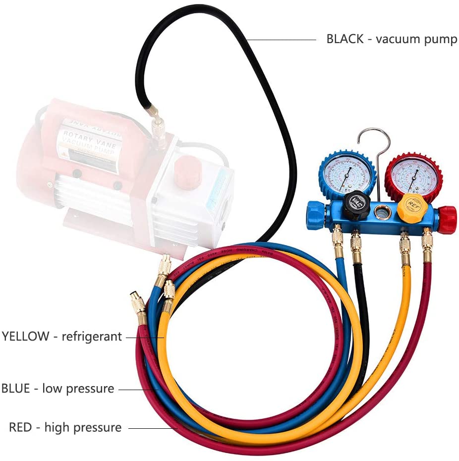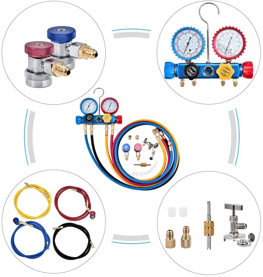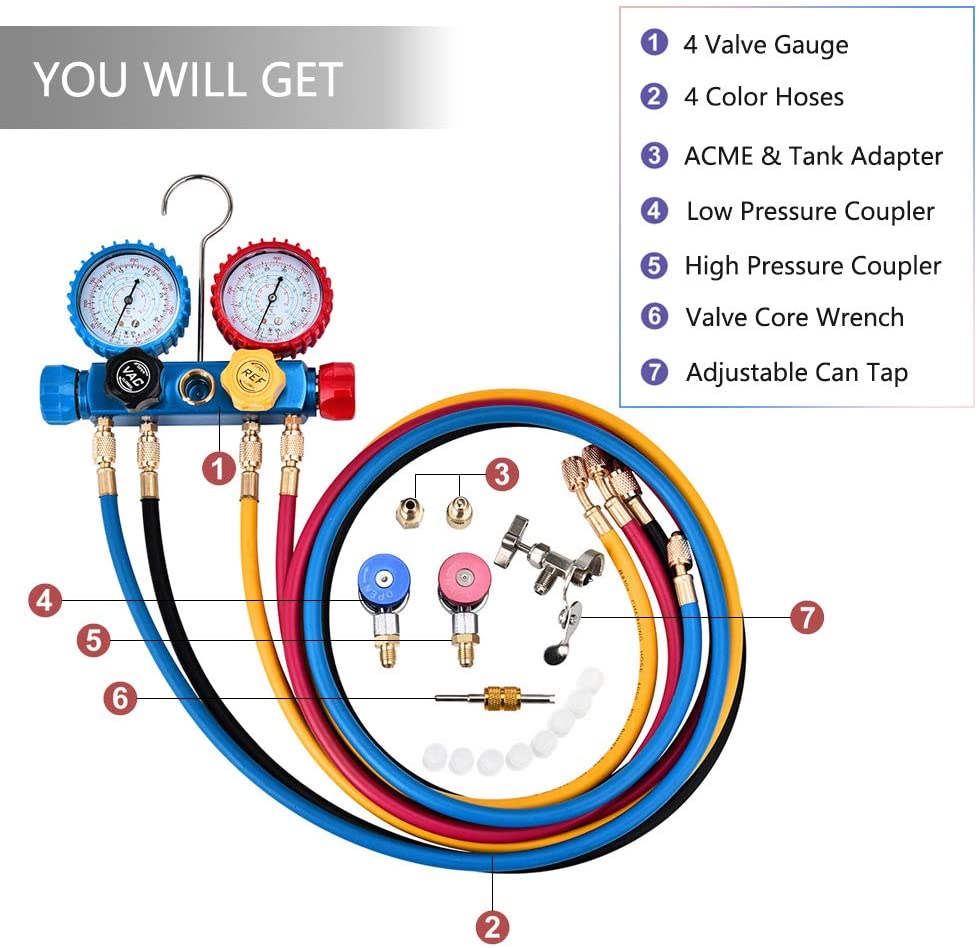 В комплект входят 4 штуки 5 футов сверхдлинный фреон для зарядки, 4 цвета для легкого распознавания, красный для высокого давления, синий для низкого давления, желтый для холодильной бутылки, черный для вакуумного насоса.