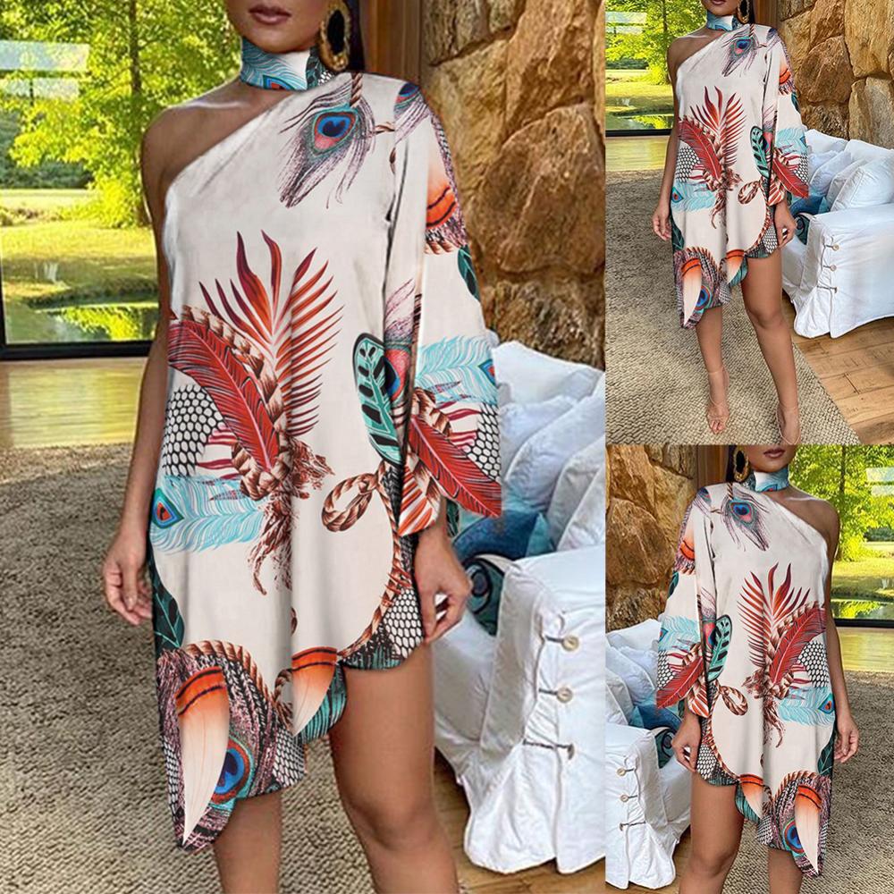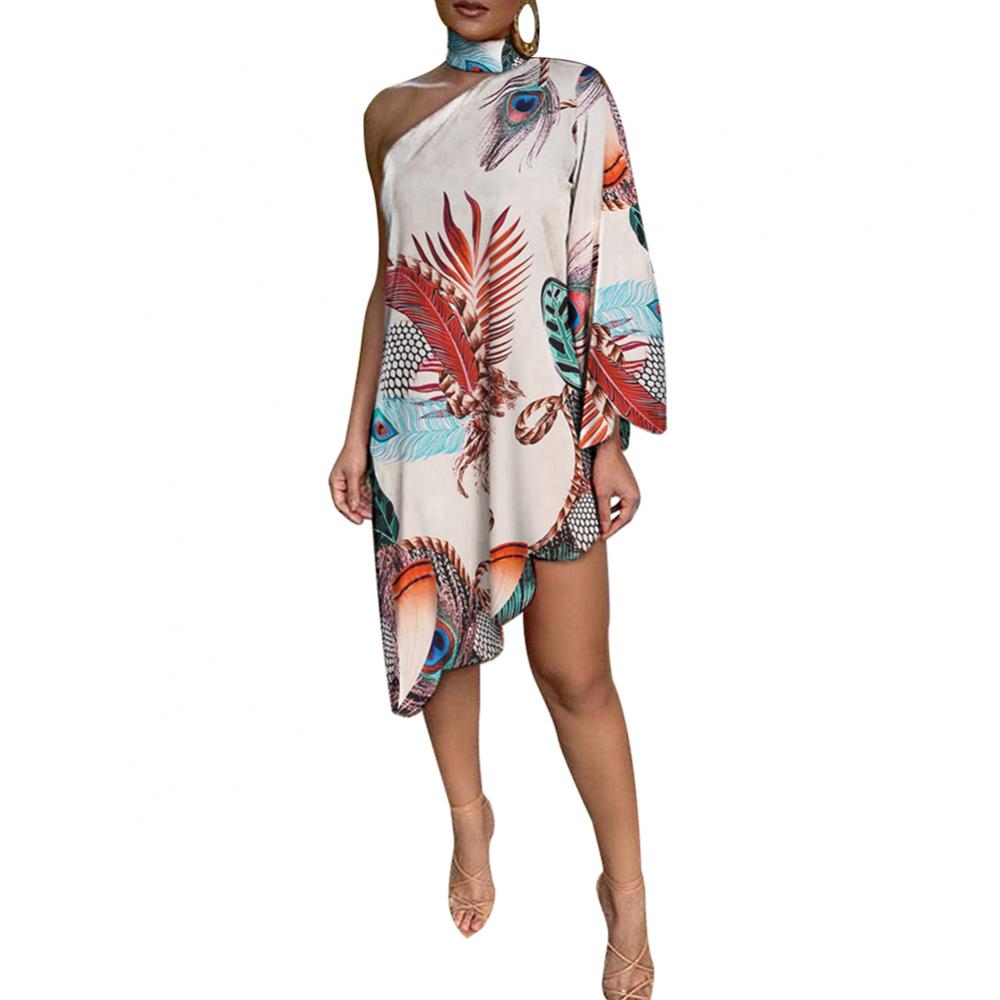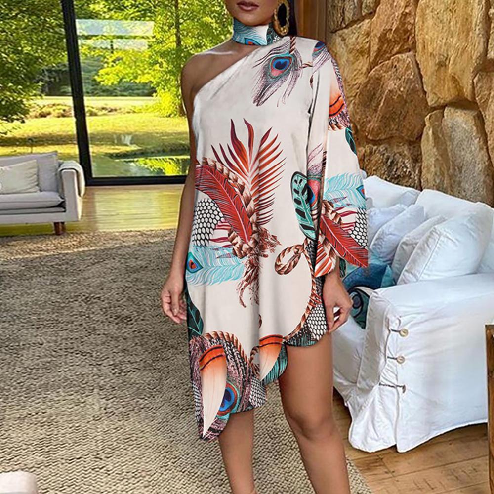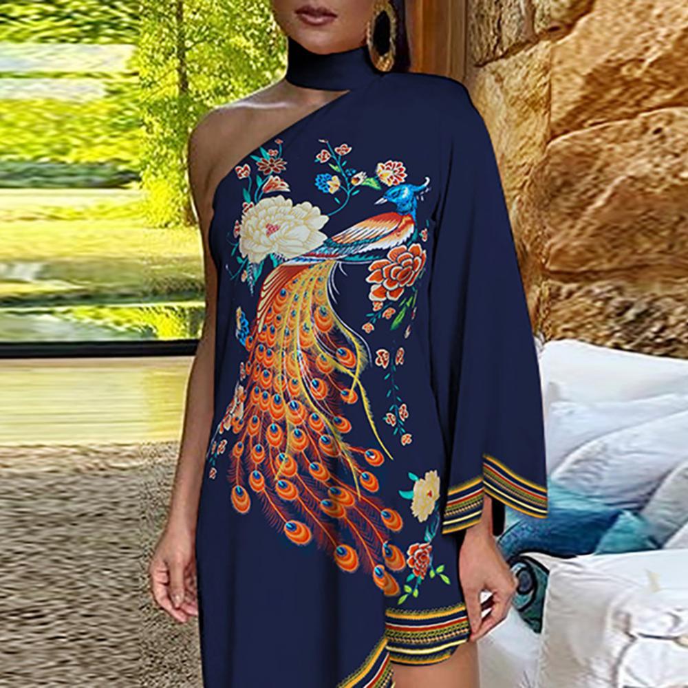 Платье на одно плечо с принтом яркого павлина придаст вам модный вид.