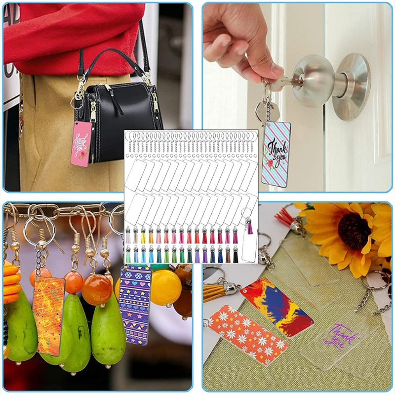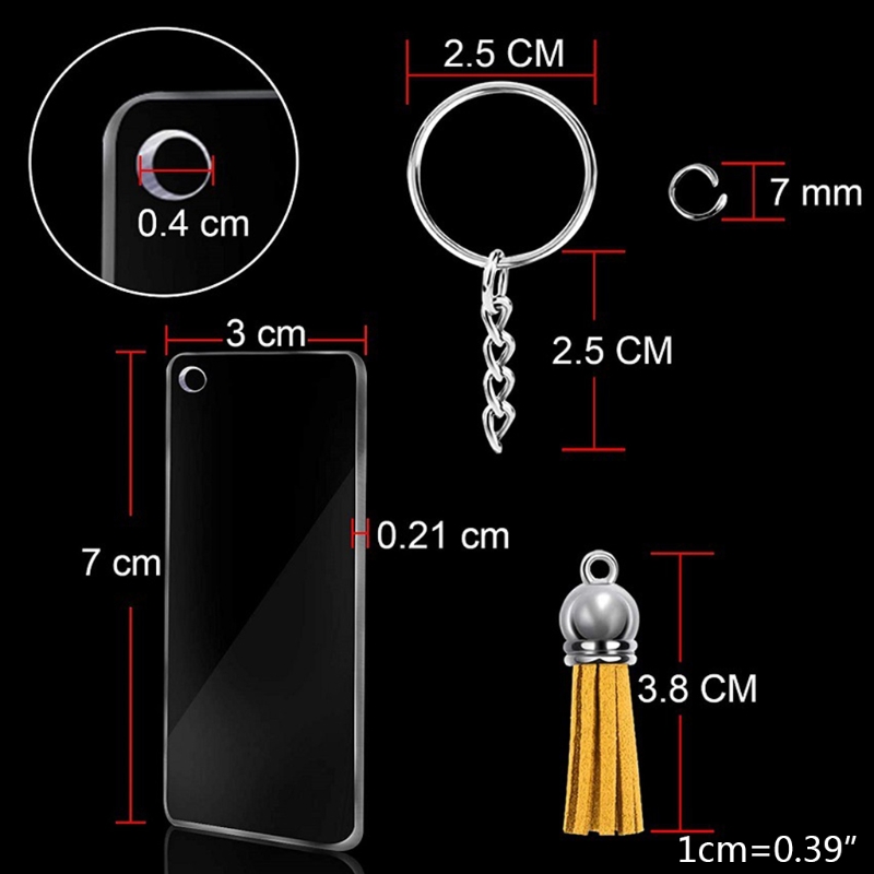 Характеристики: 【брелок kit】включает 30 прямоугольных акриловых заготовок, 30 кисточек для ключей разных цветов, 30 колец для ключей с удлинительной цепочкой, 30 колец для прыжков.