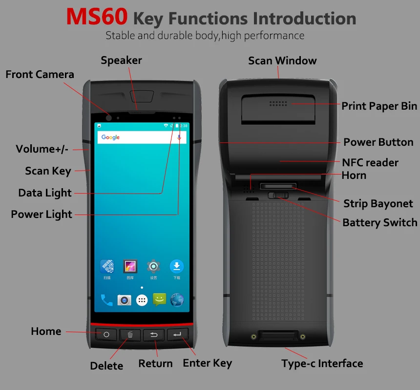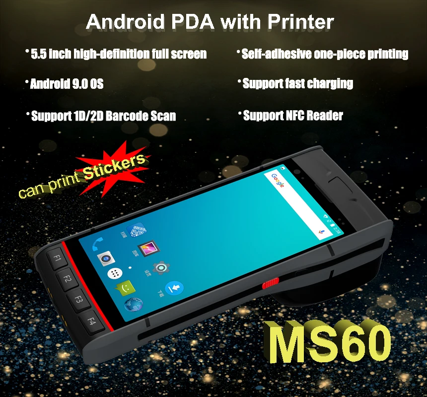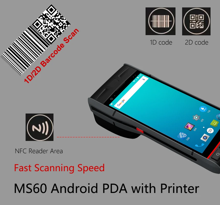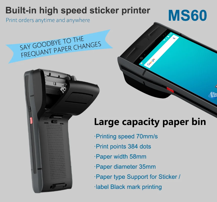 MS60С android 9,0/8,1 операционная система одинаковая верхняя одежда для мамы, 64 бит четырехъядерный процессор 2,0 ГГц высокоскоростной процессор с поддержкой префекта и вычислительной способностью, высокоскоростной Операционная эффективность Подходит для строгие требования к применению. Полностью поддерживает Сканирование штрих-кодов 1D и 2D, NFC (опционально); Поддержка печати наклеек/этикеток черного цвета