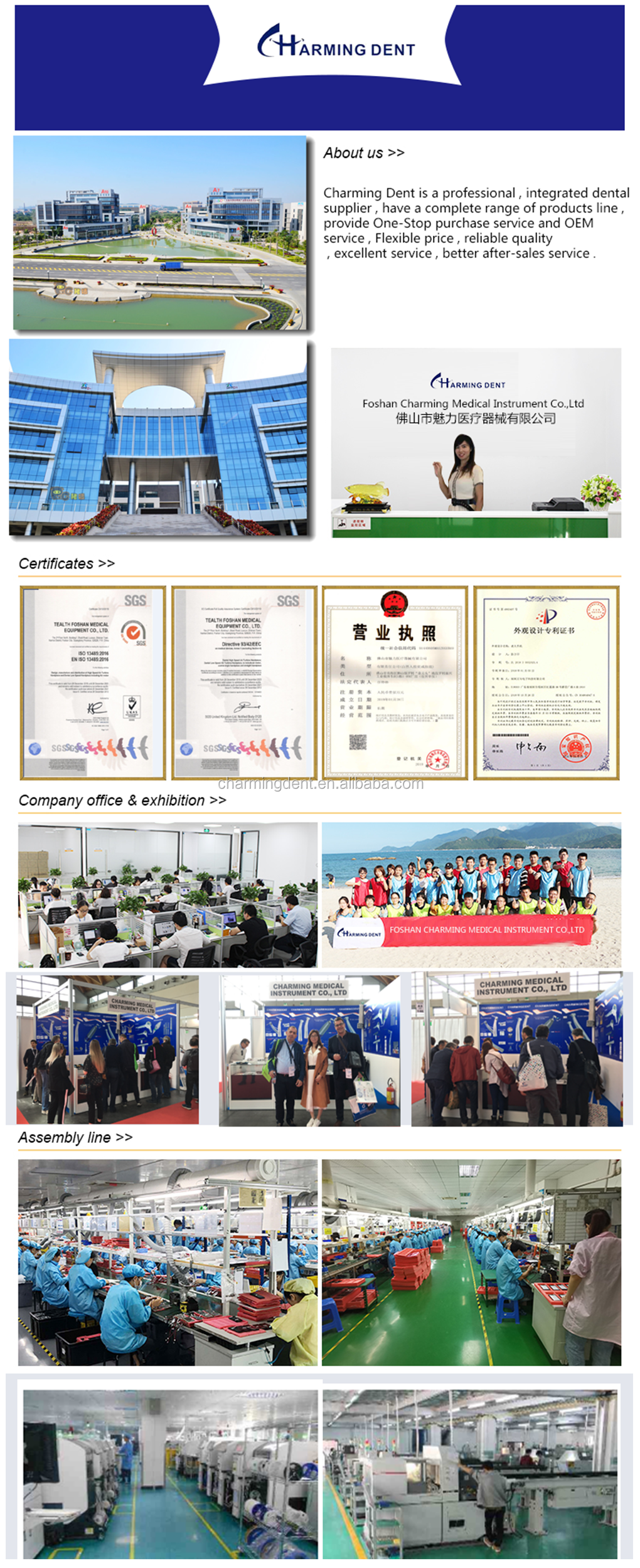 С ростом и развитием нашего очаровательного стоматологического бренда, мы получили сертификат CE и систему качества ISO 13485. В настоящее время наша продукция продается в 80 странах и пользуется большой известностью среди клиентов. Мои дорогие друзья, большое спасибо за вашу большую поддержку нашей очаровательной стоматологической, ваше сопровождение является мотивацией нашего упорного движения. Очаровательный стоматологический --- Ваш надежный деловой партнер.