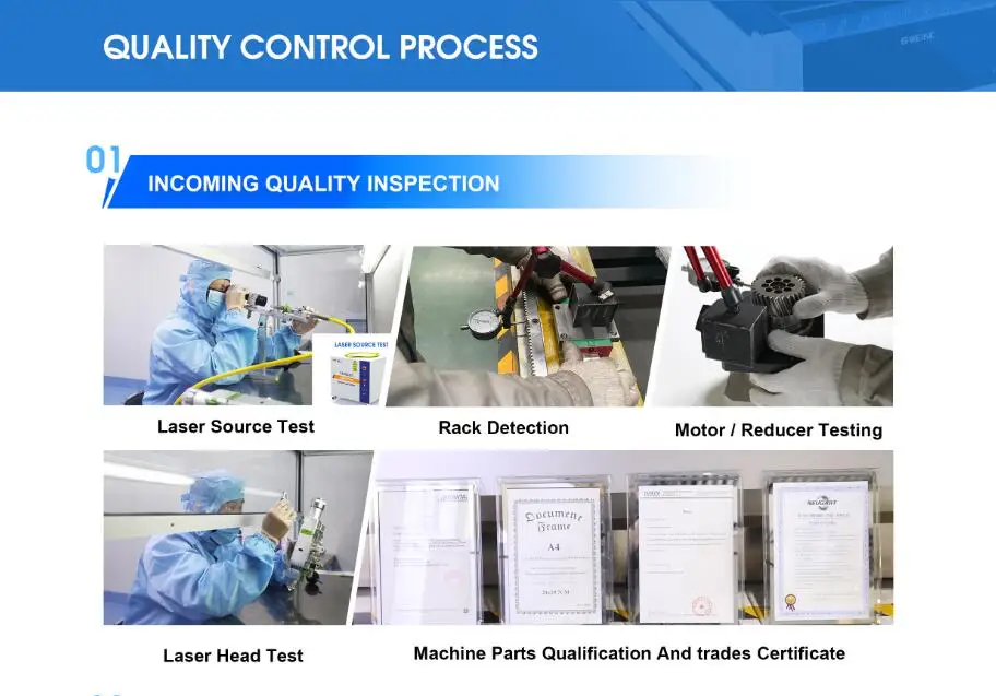 Качество iНаша главная миссия, лежащая в основе срока службы компании, и это самый важный фактор для поддержания долгосрочных деловых отношений с клиентами. Особое внимание уделяется качеству каждой единицыСтанок для лазерной резки волокна. Стандартная система контроля качества и команда отвечают за обеспечение качества продукции в каждом процессе с различными инструментами, такими как лазерный интерферометр и лазерный измеритель мощности. Лазерный интерферометр и Лазерный коллиматор используются в процессе механической сборки. В процессе лазерной сборки принимается лазерный измеритель мощности и оптический микроскоп.