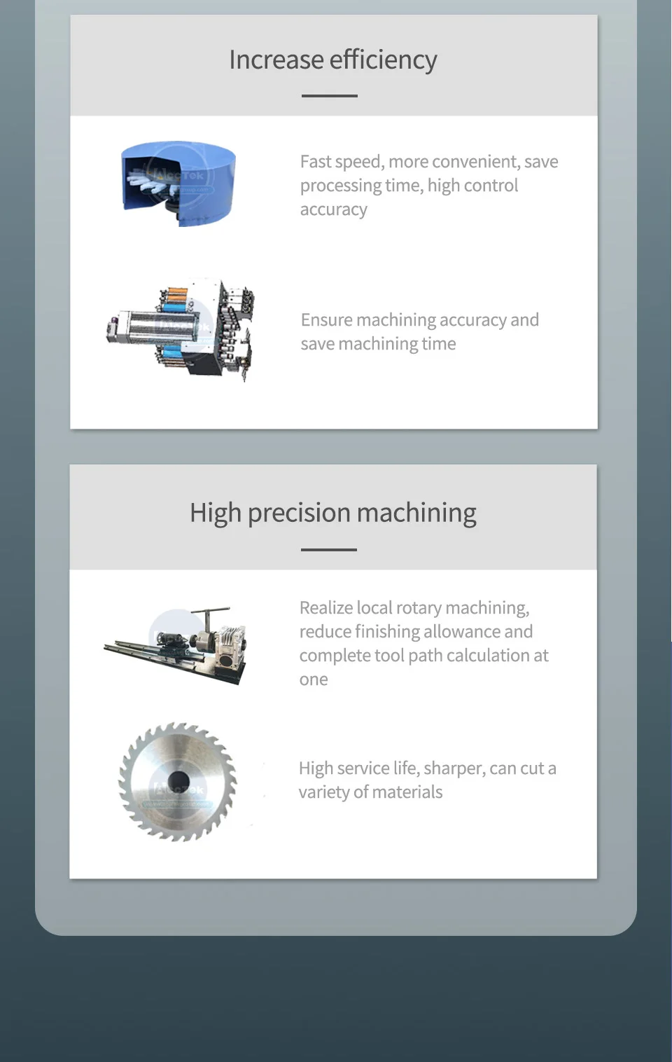 Наша основная продукция-станки с ЧПУ AccTek и лазерные гравировальные и режущие машины. Шток или пользовательские конфигурации являются нашей специализацией. Компоненты для наших машин получены от мировых поставщиков и новаторов в управлении машиной. Эти машины используются во многих отраслях промышленности, ремеслах и искусстве во всем мире. К ним относятся работы по дереву, металлические и каменные работы, Алюминиевое Производство, строительство лодок, штуцер магазина, изготовление пресс-форм, чтобы назвать несколько.
