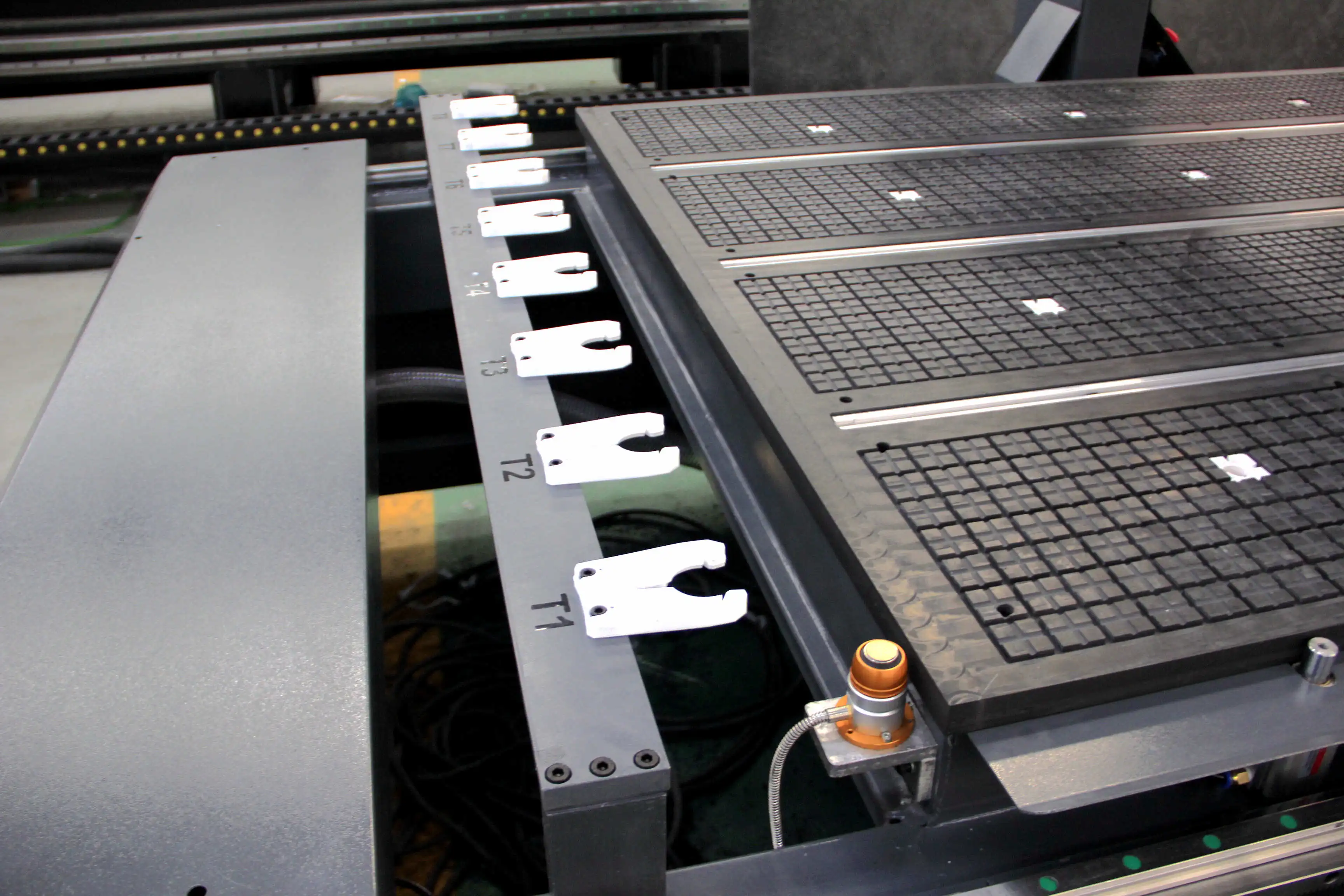 Расположение цилиндра pop pins.(2 на оси X, 3 на оси Y)Т-образное отверстие с зажимами, закрепите рабочие материалы к столу.