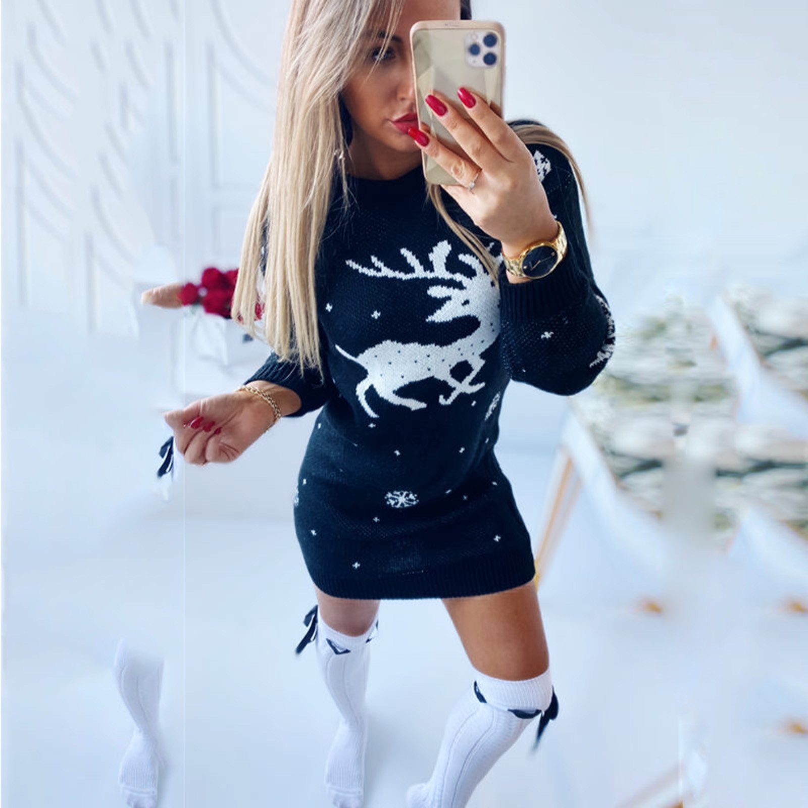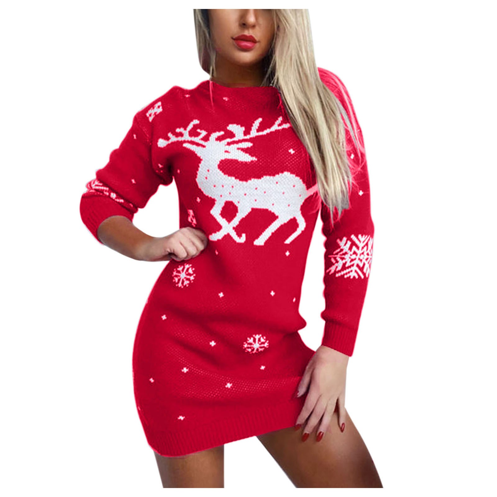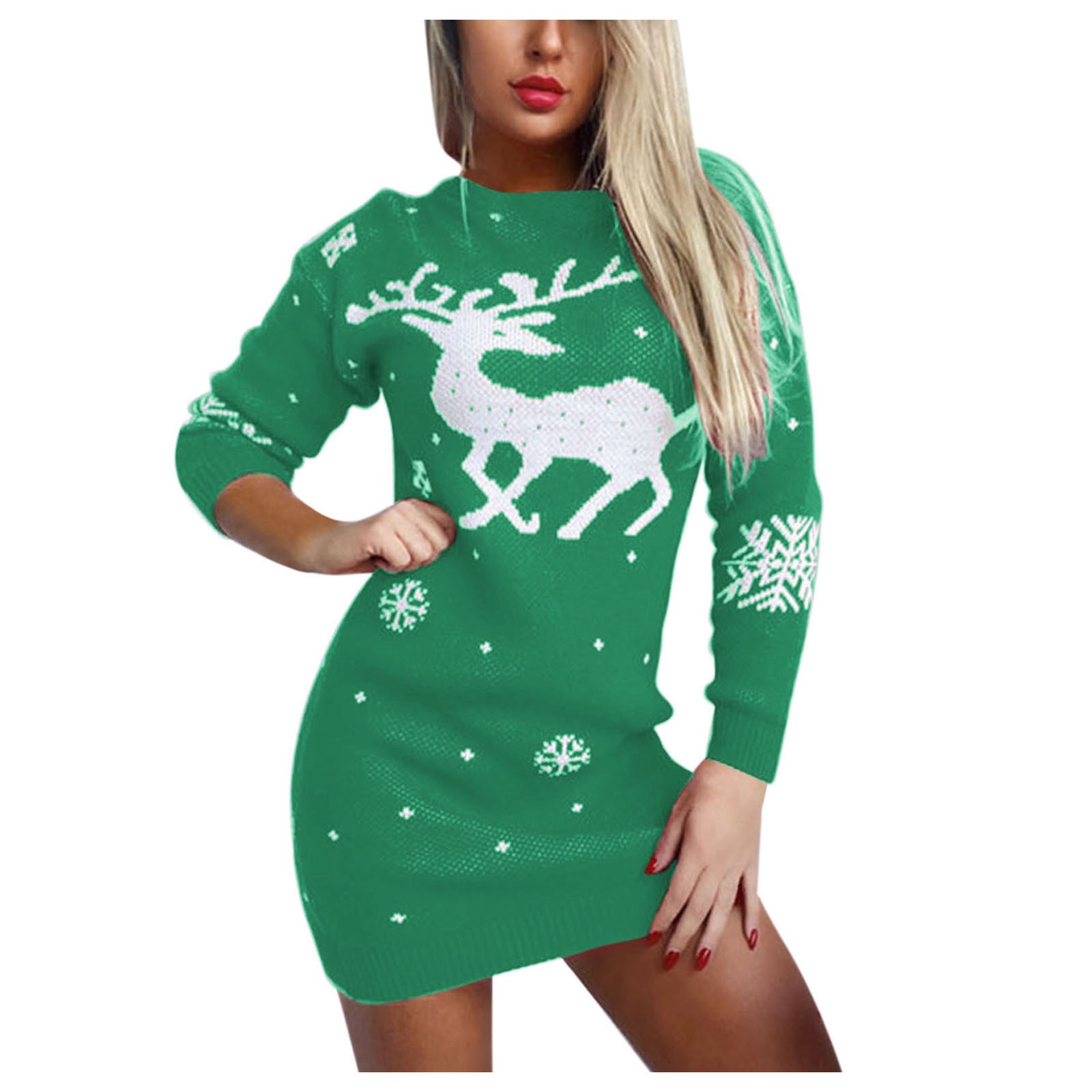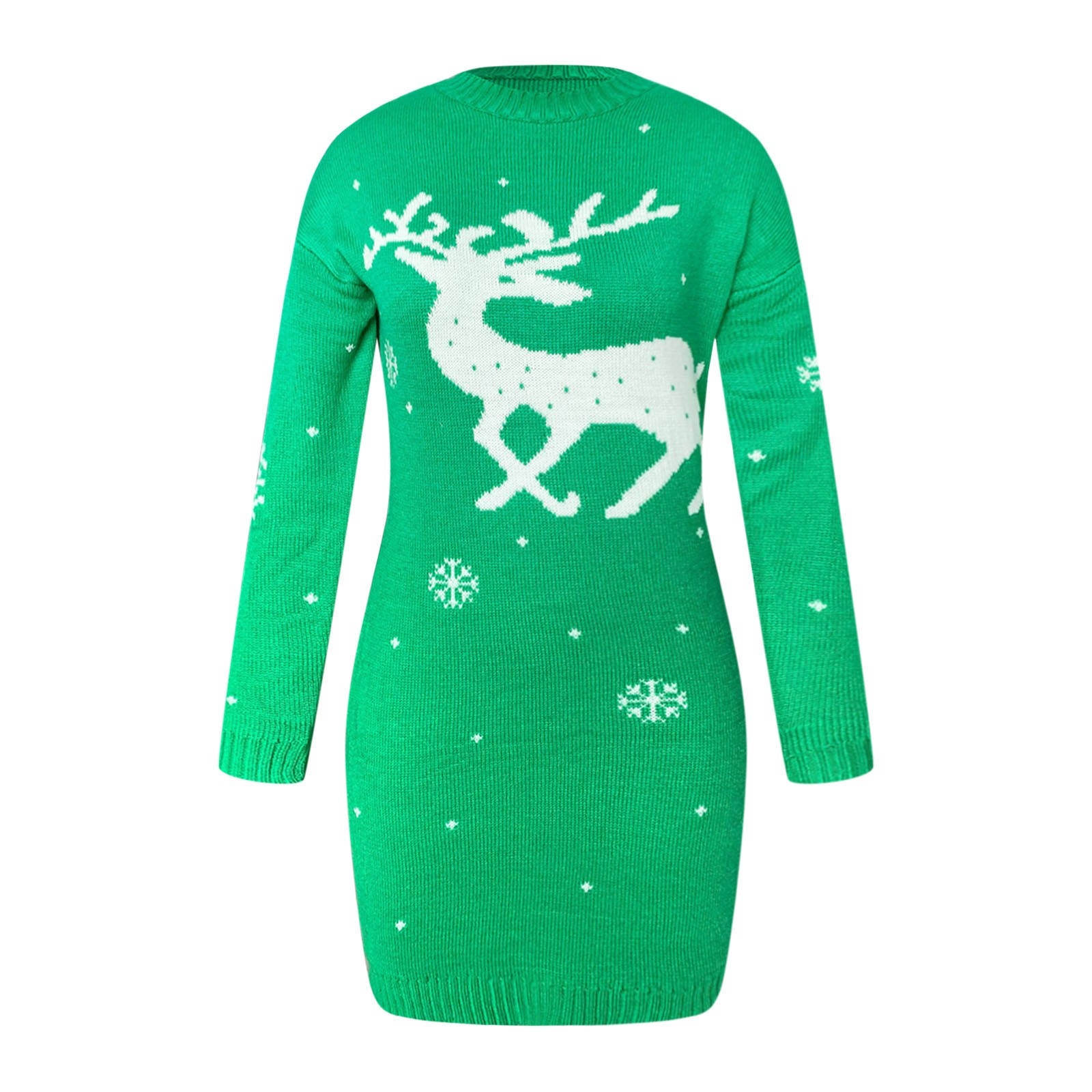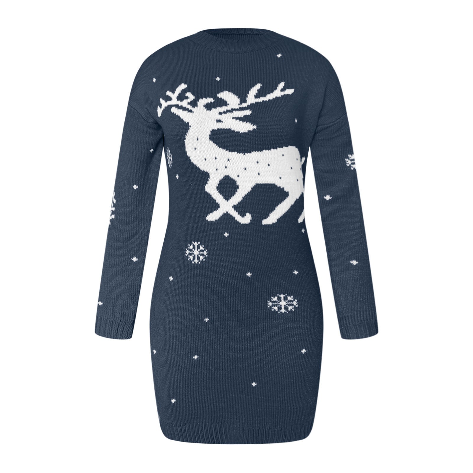 Женский Рождественский пуловер с круглым вырезом и изображением оленя снежинки, трикотажное мини-платье