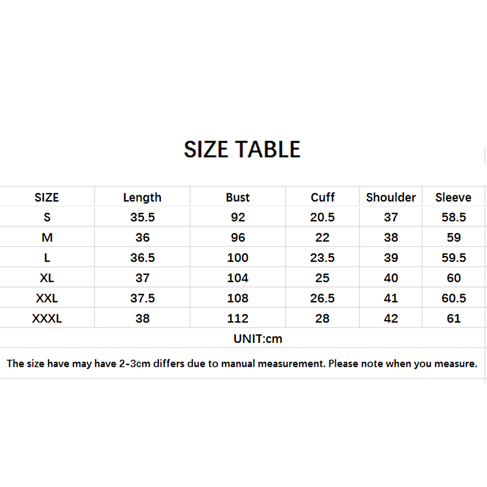 Таблица размеров только для справки; Может быть небольшая разница с тем, что вы получаете.