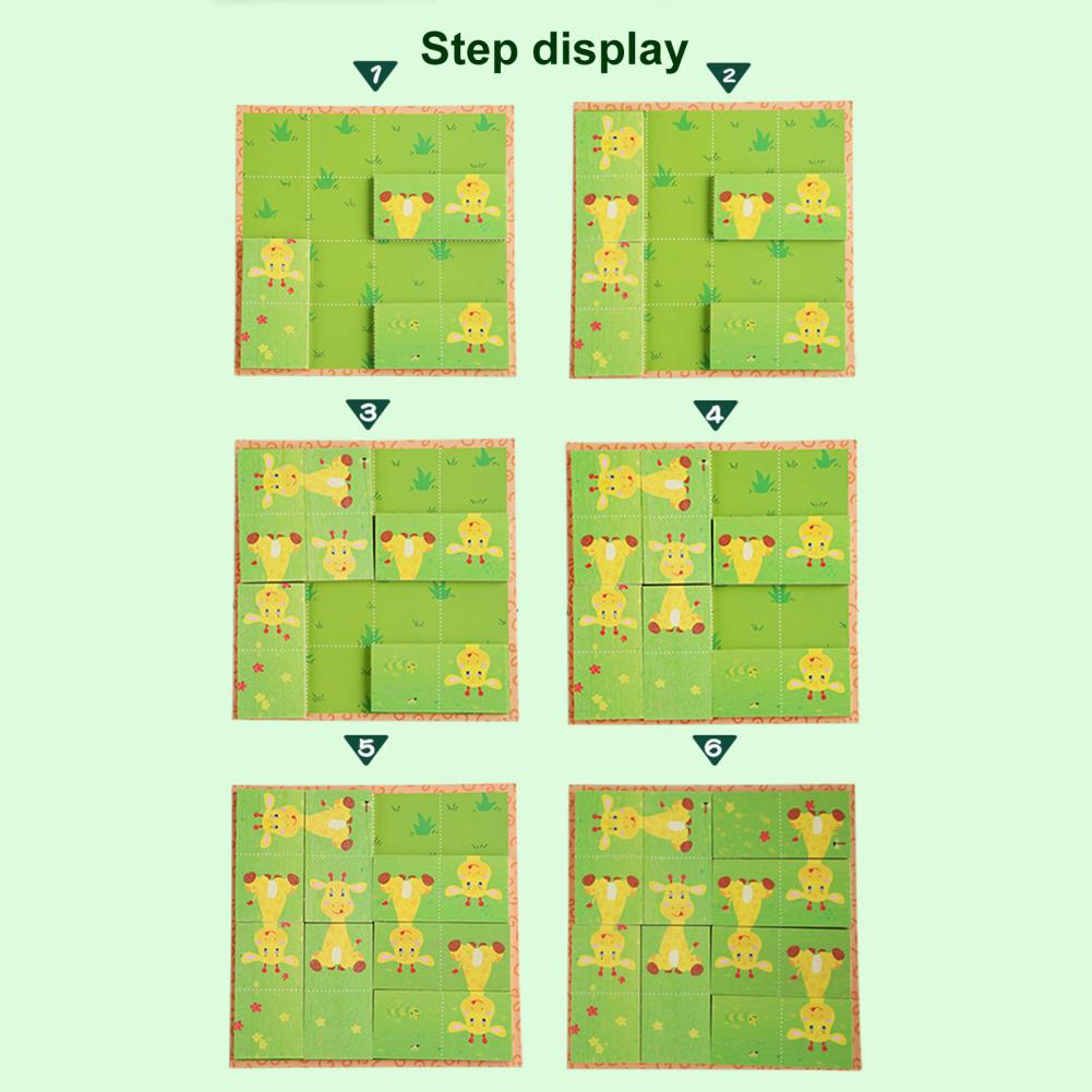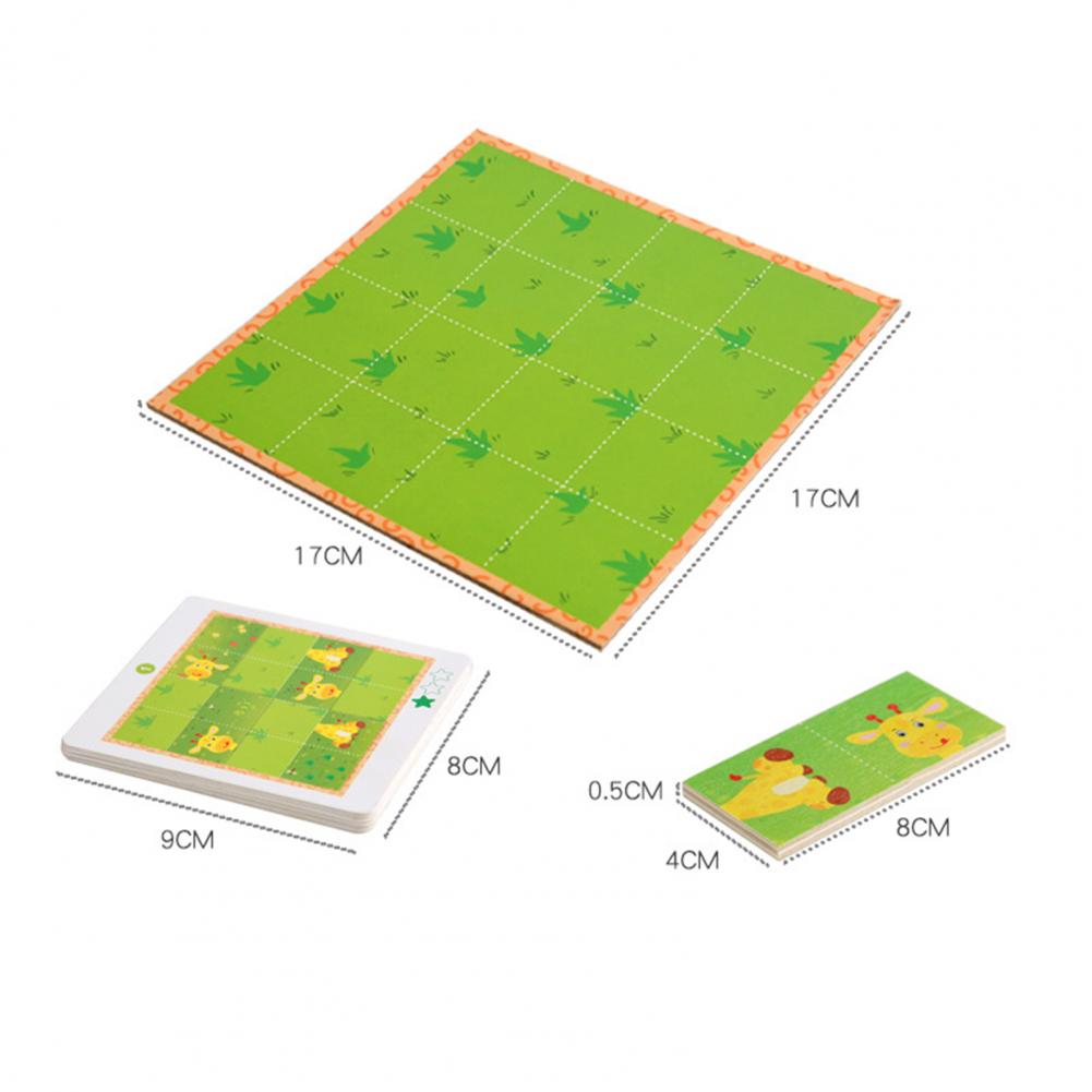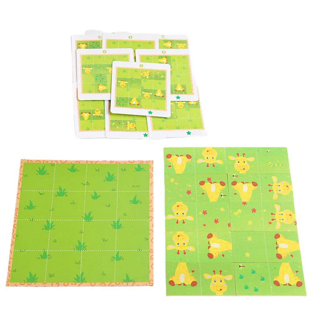 Он нуждается в плинтусе головоломки и 15 двухсторонних справочных карт. Положите 10 кусочков пазла и опорную доску на стол, положите кусочки пазла против проблемных карт, А затем поместите остальные карты в свободное место на доске для того, чтобы получить завершенного жирафа, после завершения размещения карты останется 2 карты.