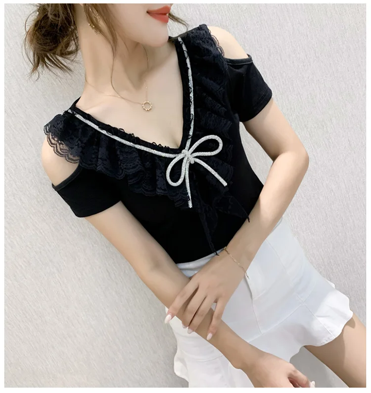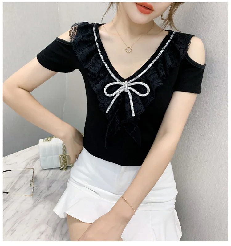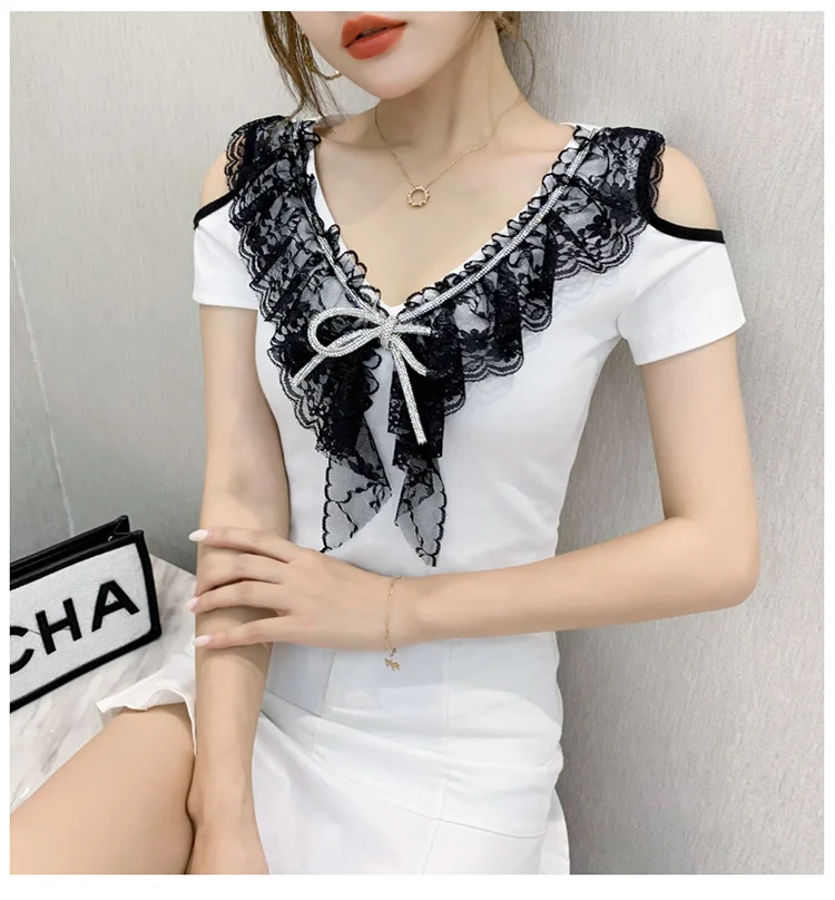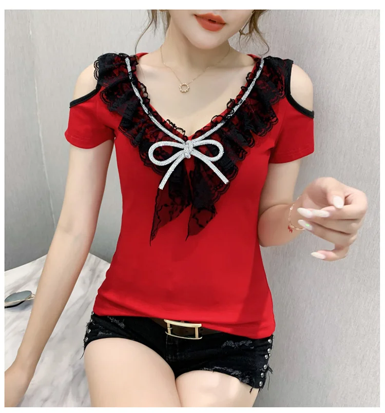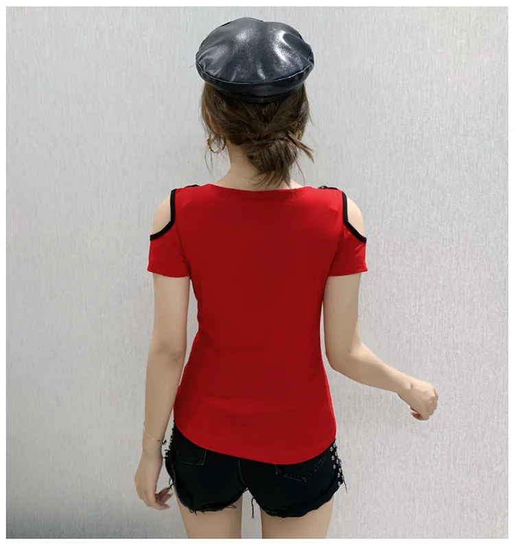 #6246 черные белые красные женские футболки с V-образным вырезом сращенный
