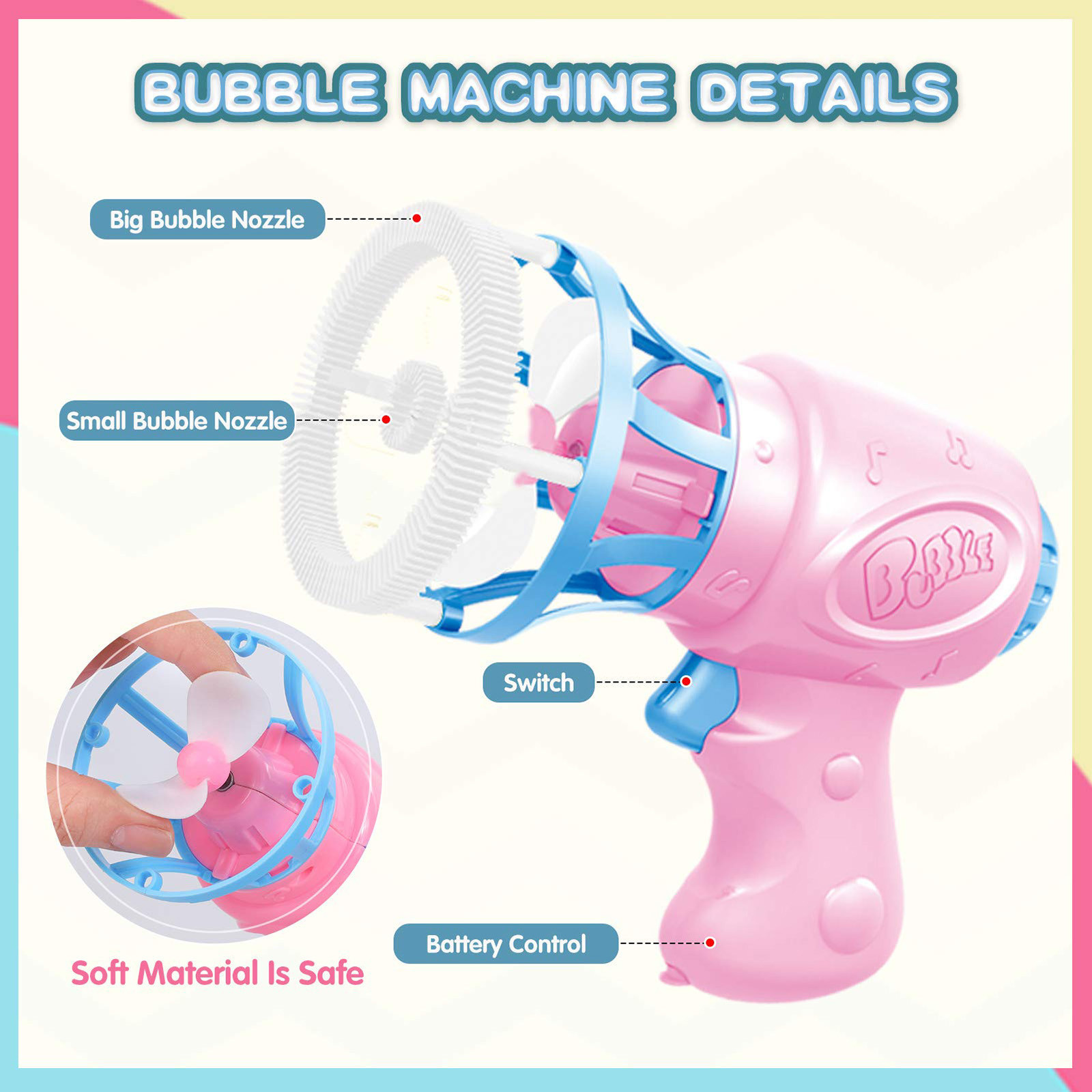 ✅Безопасность-Воздуходувка сделана из безвредного материала ABS, а лопасти вентилятора изготовлены из мягкого губчатого материала, который очень безопасен и специально разработан для детей. Вы даже можете удалить насадку пузыря и превратить ее в простой вентилятор для рассеивания тепла летом.
