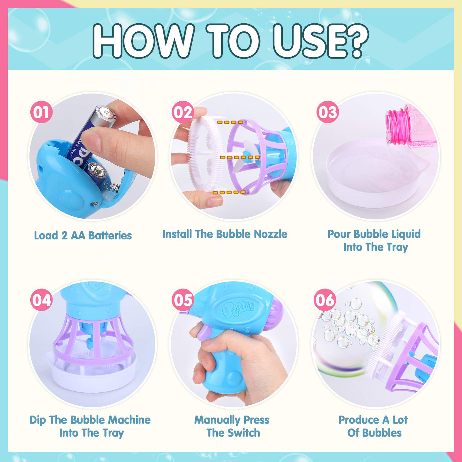 ✅Простота в использовании-просто установите Пузырьковые насадки на пузырчатую машину, окуните пузырчатую машину в лоток с пузырчатой жидкостью, а затем нажмите переключатель, чтобы произвести много пузырьков. Для производства пузырчатой жидкости просто добавьте мыльницу и воду в бутылку в соотношении 1:5, затем равномерно размешайте и дайте ей стоять, пока пузырьки не исчезнут.