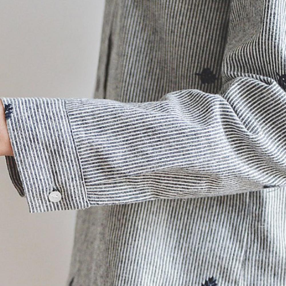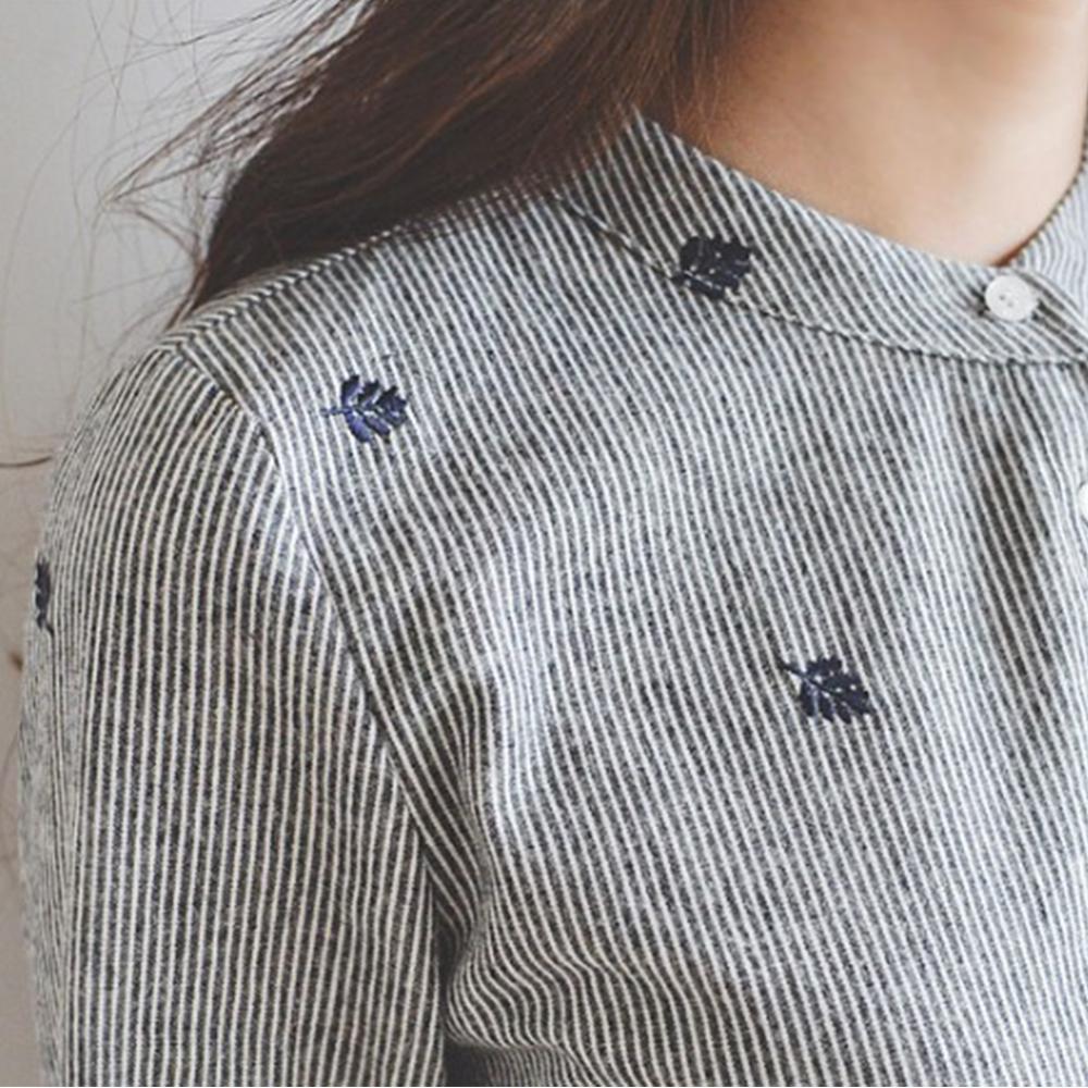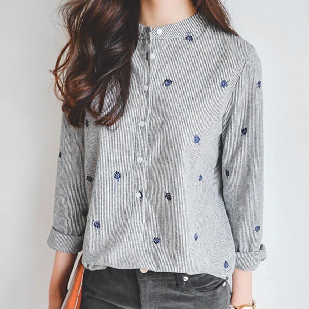 Женская блузка в полоску с вышивкой листьев, длинным рукавом и стоячим воротником, тонкая рубашка, Топ