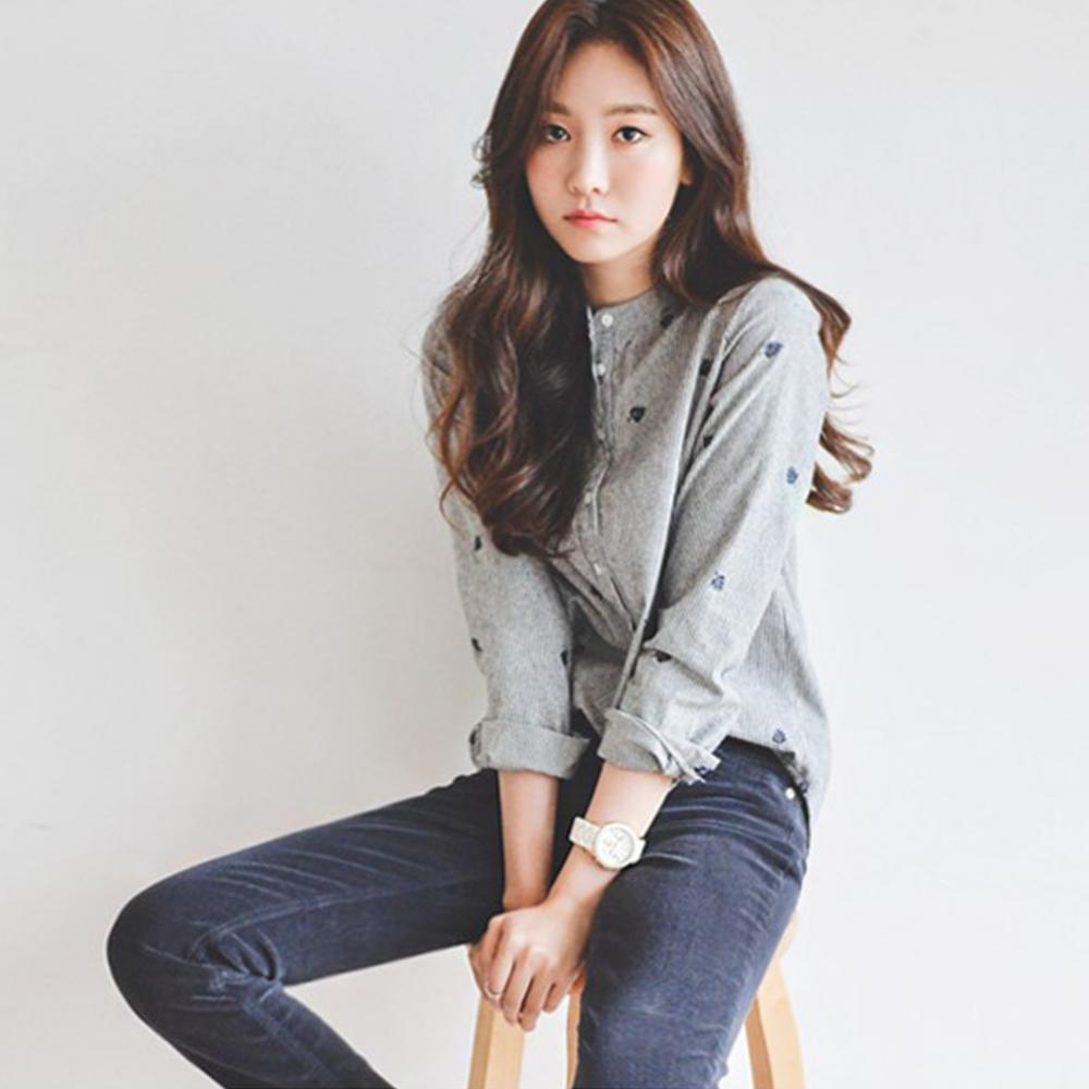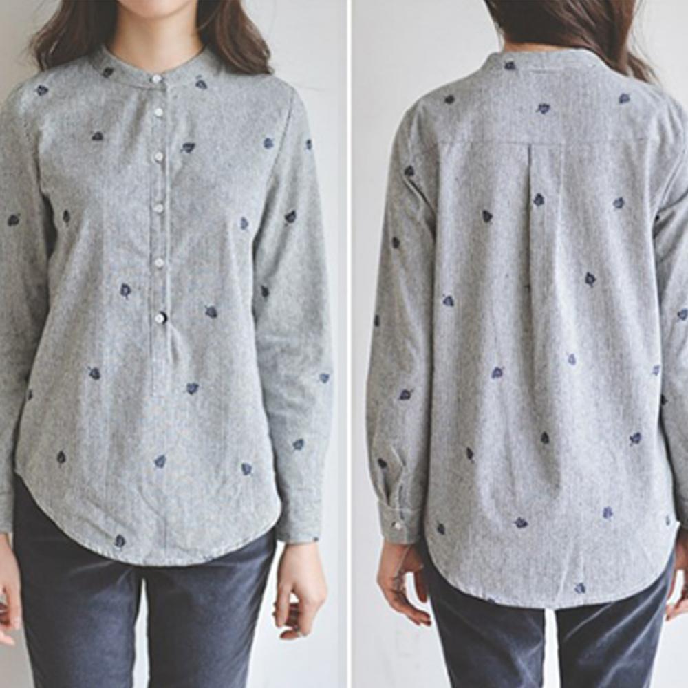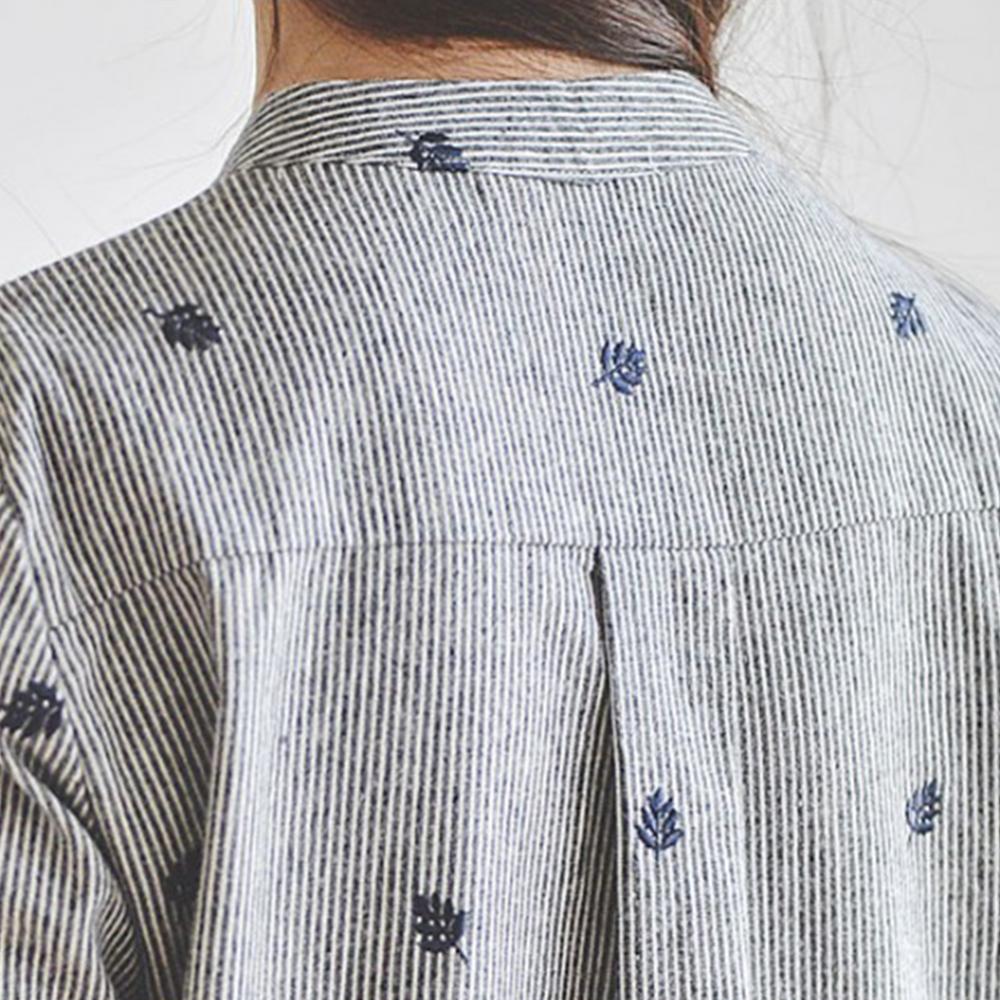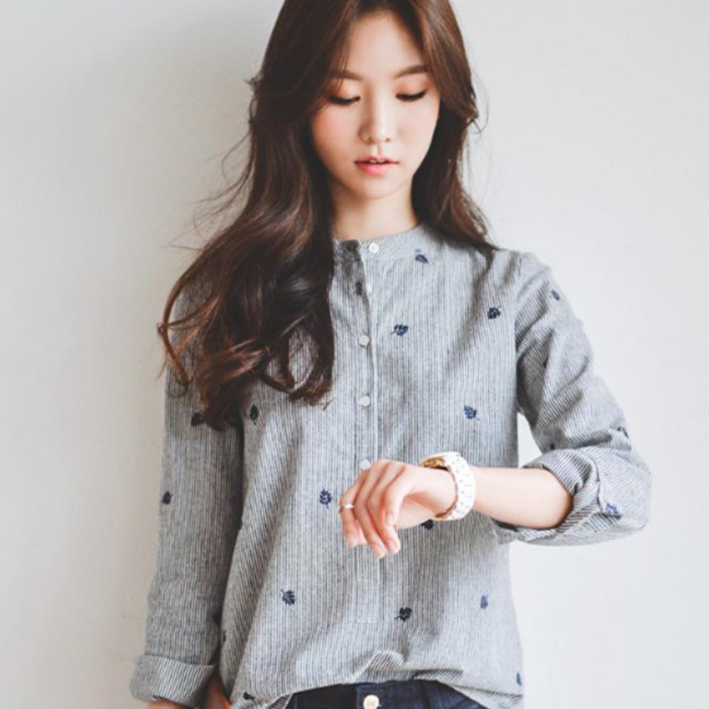 Женская блузка в полоску с вышивкой листьев, длинным рукавом и стоячим воротником, тонкая рубашка, Топ