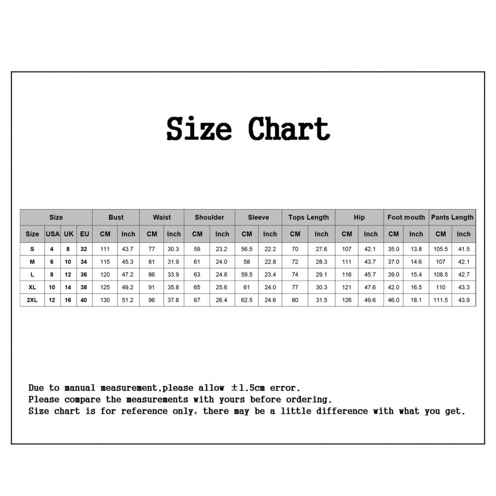 [Наш Размер XL] Обхват груди: 125 см/49,2 дюйма, обхват бедер: 121 см/47,6 дюйма, ширина плеч: 65 см/25,6 дюйма, длина рукава: 61 см/24 дюйма, длина топа: 77 см/30,3 ", обхват талии: 91 см/35,8", лапка для ног: 42 см/16,5 ", брюки Длина: 110 см/43,3", рукав: 61 см/24 дюйма (прибл.)
