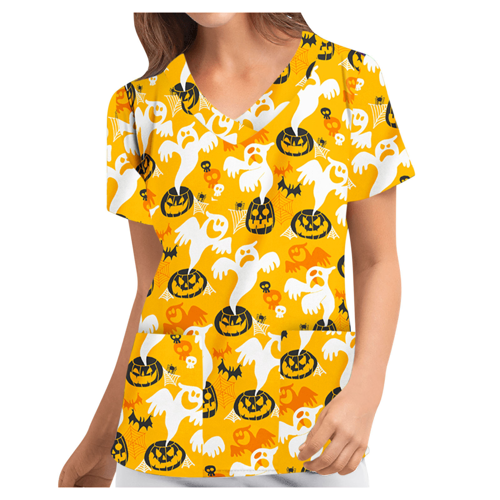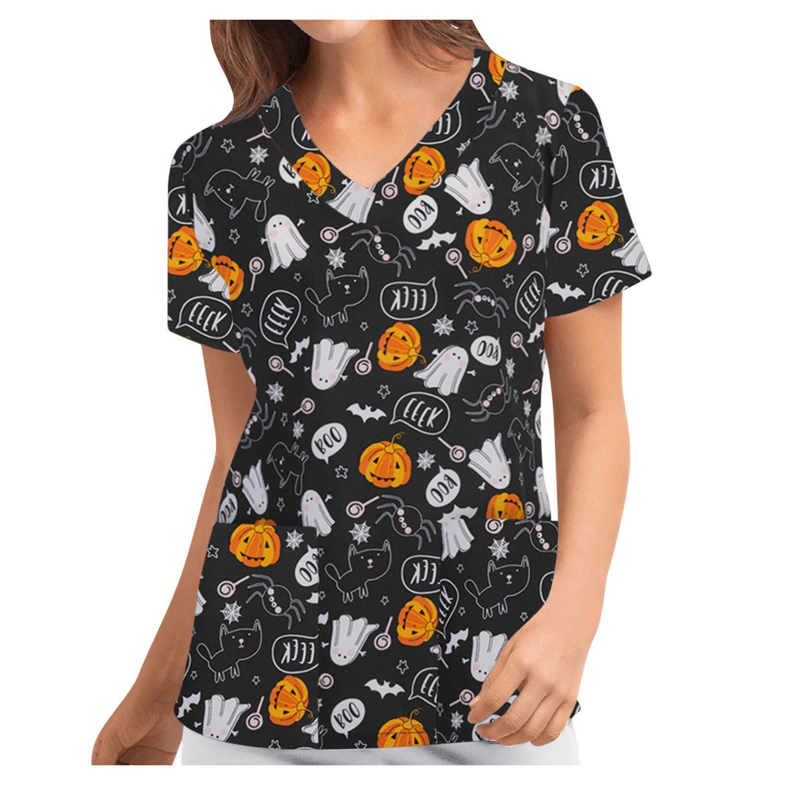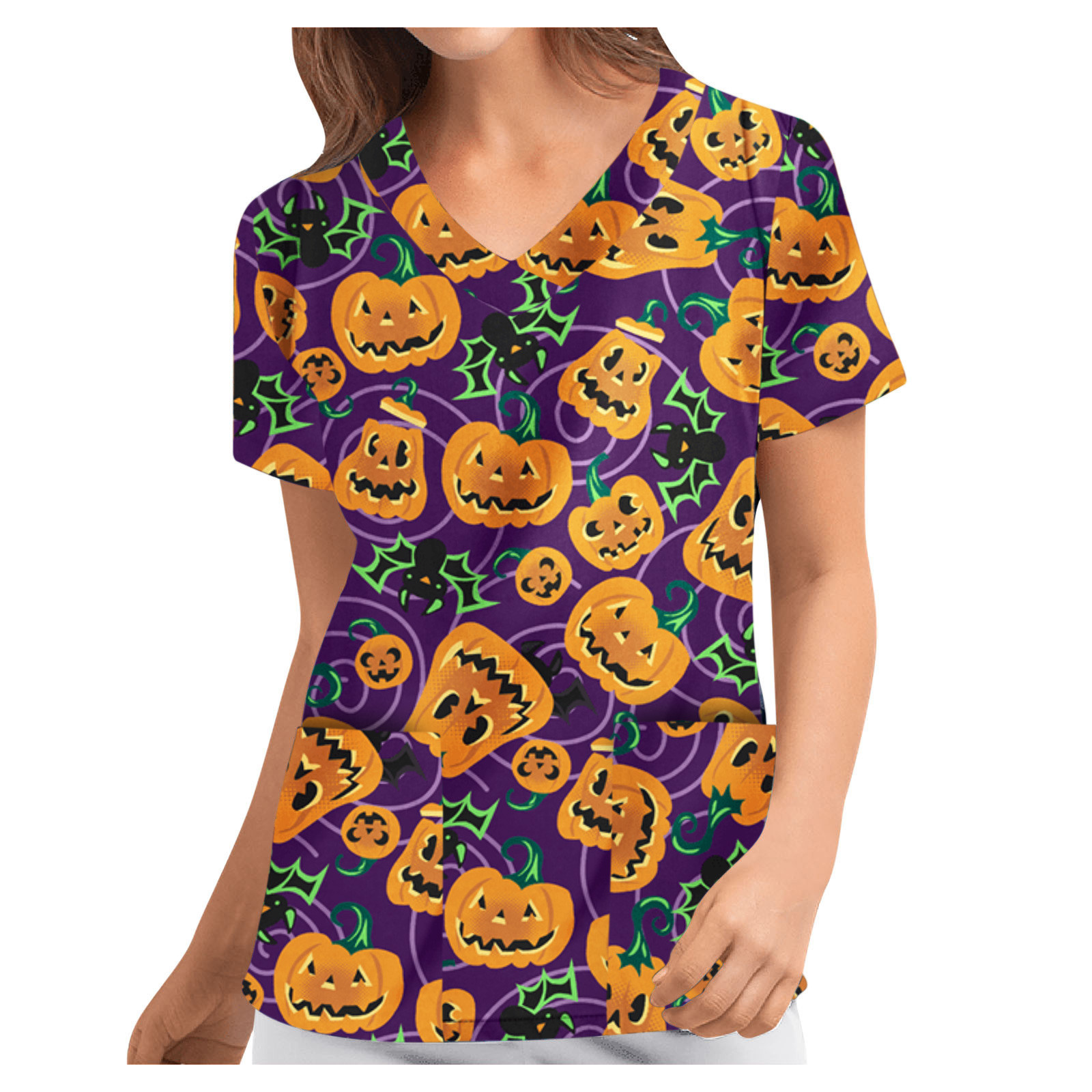 Особенности изделия: Пол: Для женщин повод: повседневный, рабочий Цвет: v-образный вырез Тип узора: принт с героями мультфильмов на Хэллоуин Упаковка включает в себя: 1 шт. женская блузка Топ Примечание: Пожалуйста, сравните детали размеров s с вашими перед покупкой! Таблица размеров: