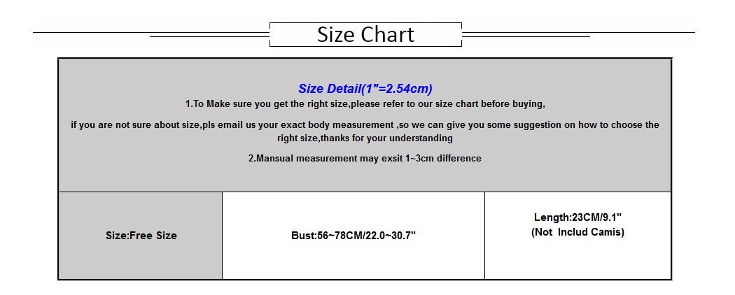 Размер: свободный размер | Бюст: 56 ~ 78 см/22,0 ~ 30,7" | Длина:23 см/9,1" (Не включает Camis) |