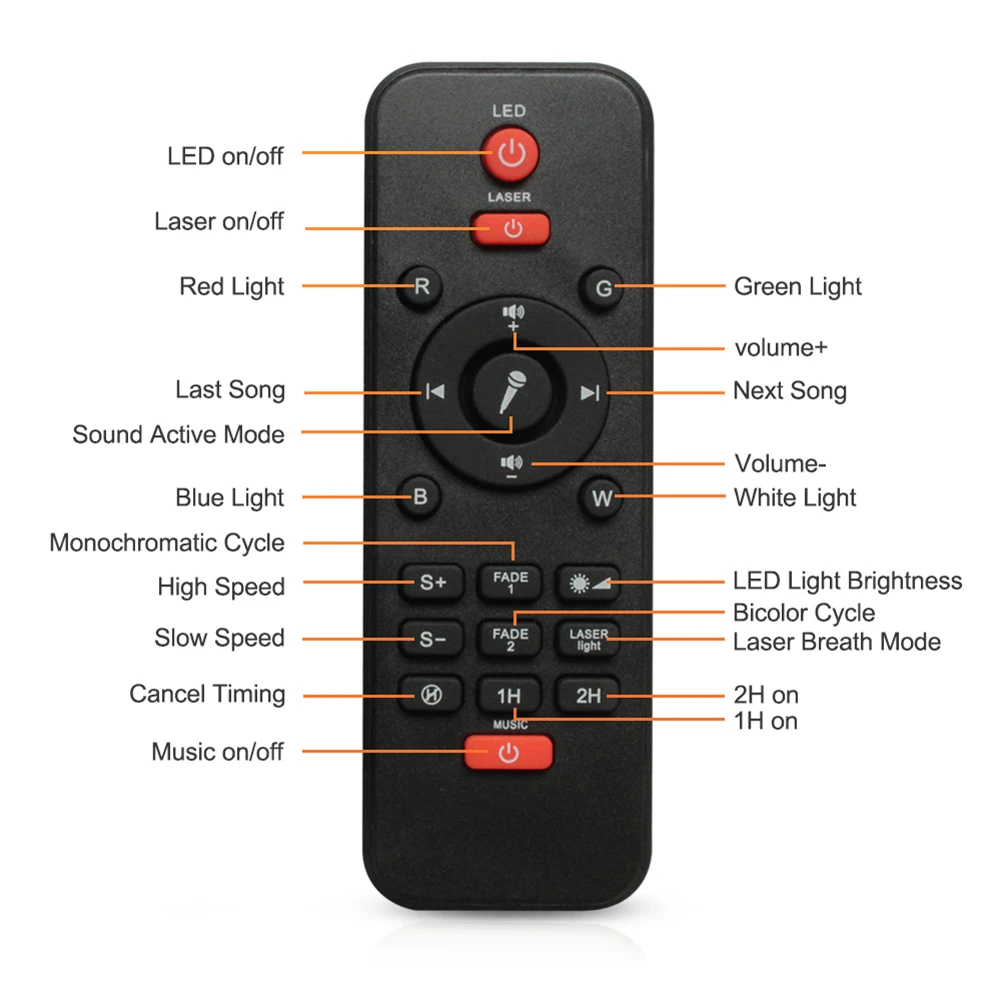 2. Пульт дистанционного управления может регулировать цвет водяного рисунка Авроры, скорость водяного рисунка Авроры, режим, совместимый с Bluetooth, одиночное управление водяным узором Авроры, одиночное лазерное управление, яркость, управление музыкой, управление звуком, режим выбора, Функция синхронизации, переключатель;