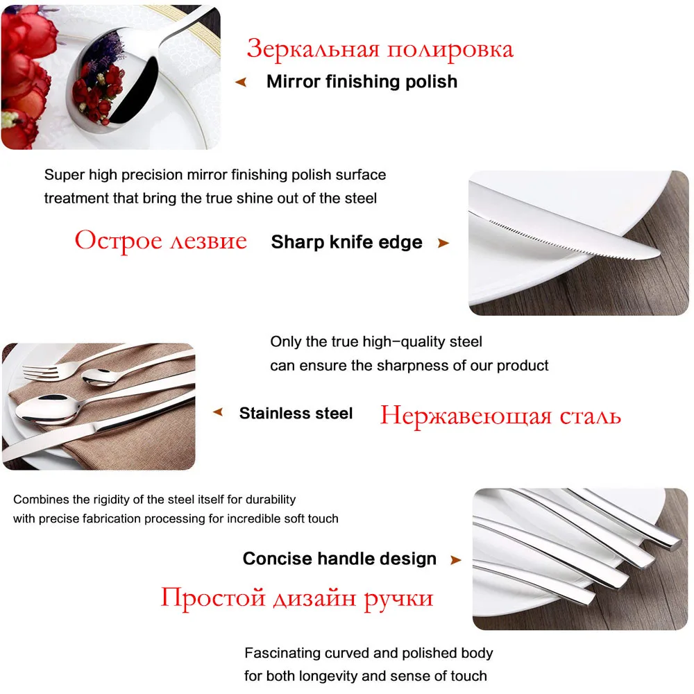 24 шт. столовые приборы из нержавеющей стали для 6 человек. Подходит для любого случая, например: домохозяйка, семейный сбор, свадьба, домашние вечерние, ресторан, вечерние Дни рождения. Поделитесь с нами каждым важным моментом!