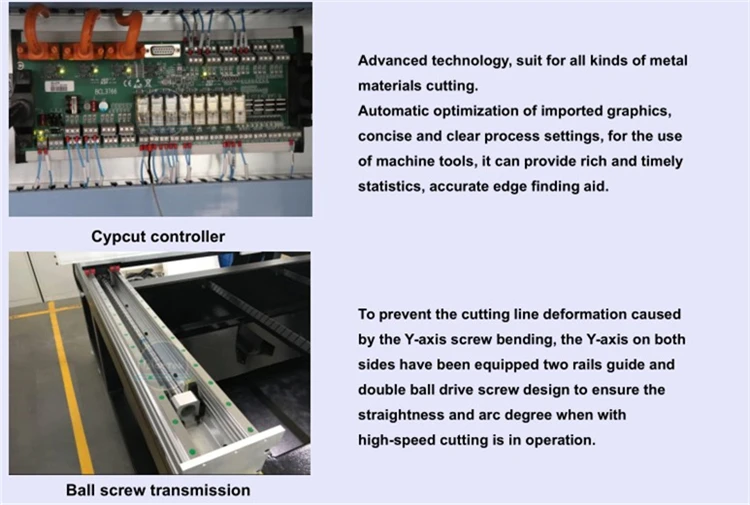 Основные характеристики1)Применение козловой структуры и интегрированного литого поперечного балки для достижения более высокой жесткости, стабильности, ударопрочности.2)Высокопроизводительный лазерный источник и стабильная операционная система Cypcut, которая делает лучший эффект резки.3)Машина имеет идеальную систему охлаждения, систему смазки и систему удаления пыли, чтобы гарантировать, что она может работать стабильно, эффективно и долговечно.4)Машина способна автоматически регулировать высоту для поддержания постоянного фокусного расстояния и стабильного качества резки.5)Специализированное программное обеспечение для автоматического программирования CAD / CAM и автоматическое программное обеспечение для вложения обеспечивают максимальную экономию сырья.