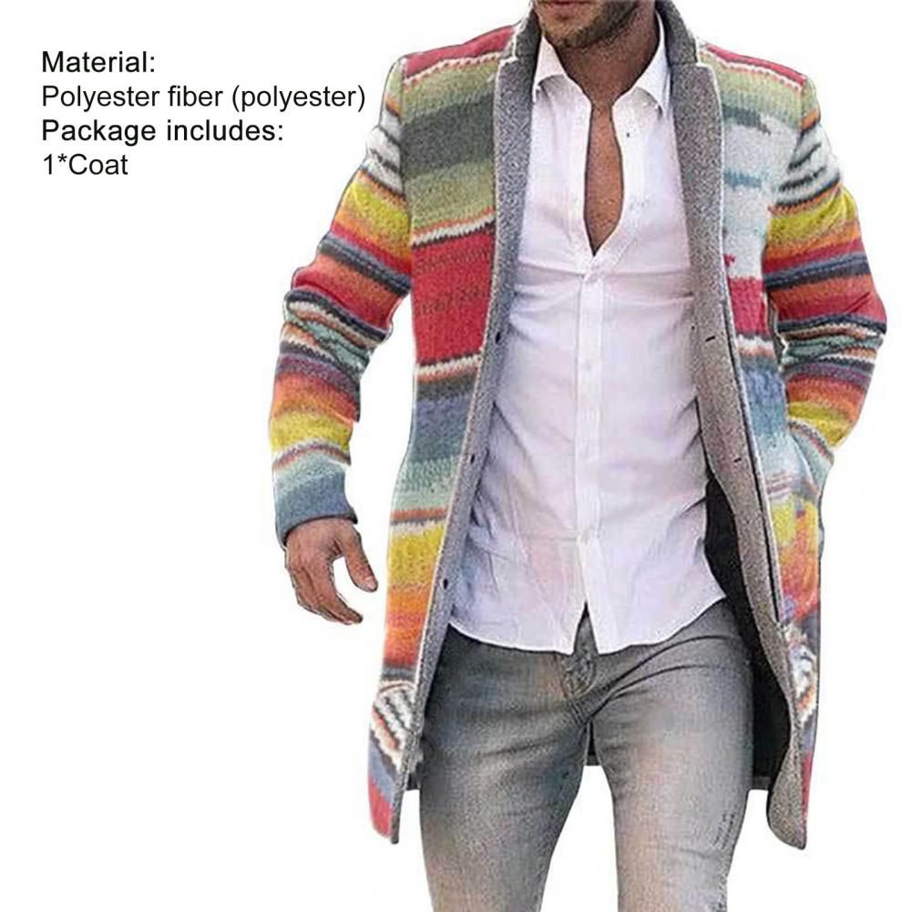 Особенности этой куртки включают в себя воротник с лацканами, однобортный, на пуговицах, разноцветный и радужный узор, все из которых делают его великолепным и потрясающим. И дизайн в цветную полоску делает его более стильным.