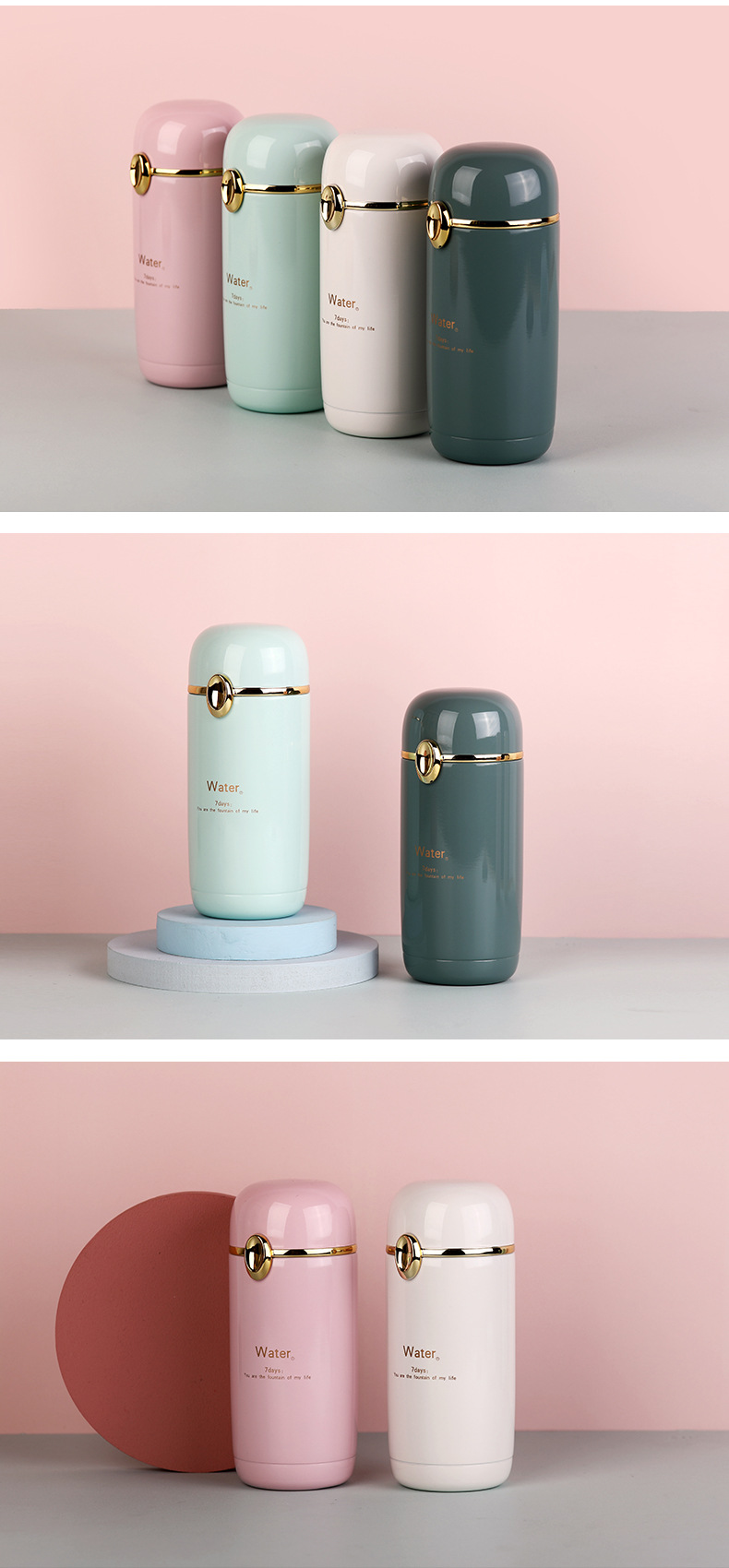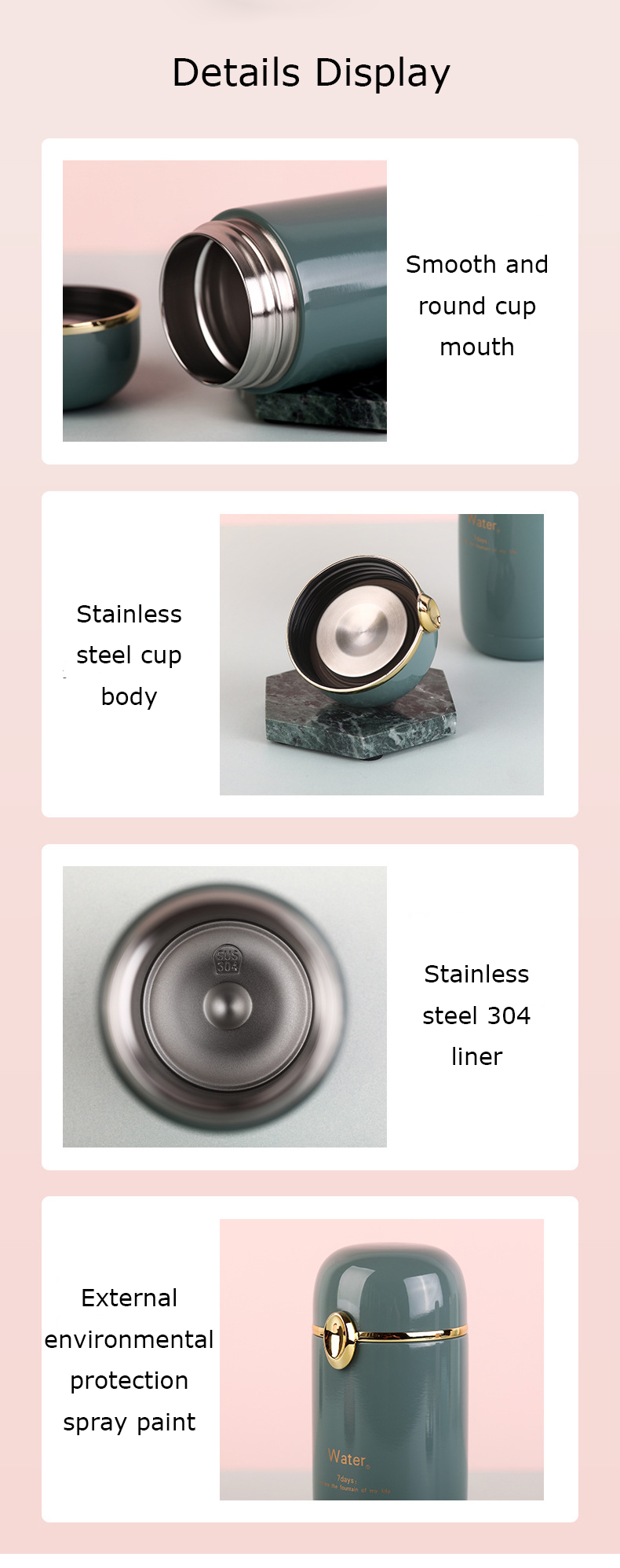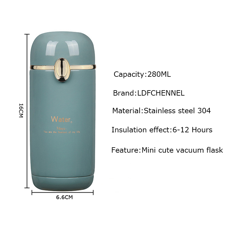 Емкость изделия: 280 мл Материал изделия: нержавеющая сталь 304 цвет изделия: синий/зеленый/белый/розовый время удержания: 6-12 часов Обратите внимание: цвет может немного отличаться из-за различных мониторов. Из-за ручного измерения размер может отличаться на 1-2 см.