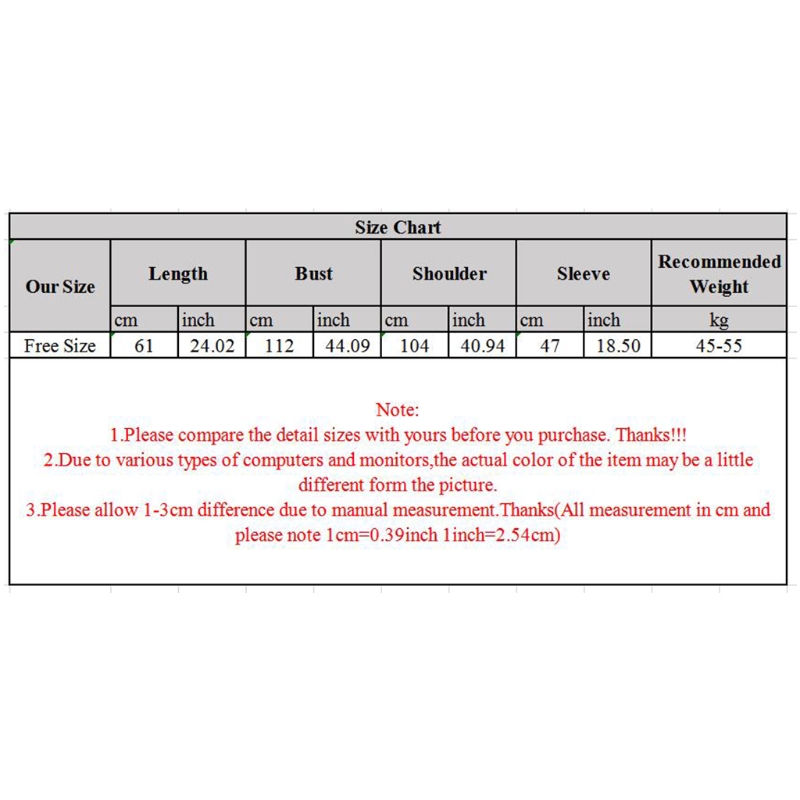 Размеры: один размер Размеры Длина: 61 см (24,01 дюймов); Обхват груди; Длина: 112 см (44,09 дюйма) ширина плеч: 104 см (40,94 дюйма); Длина рукава: 47 см (18,5 дюймов) рекомендуется Вес: 45 кг-55 кг