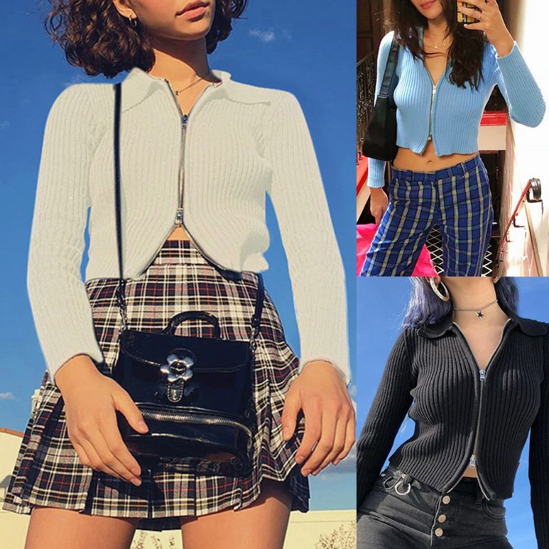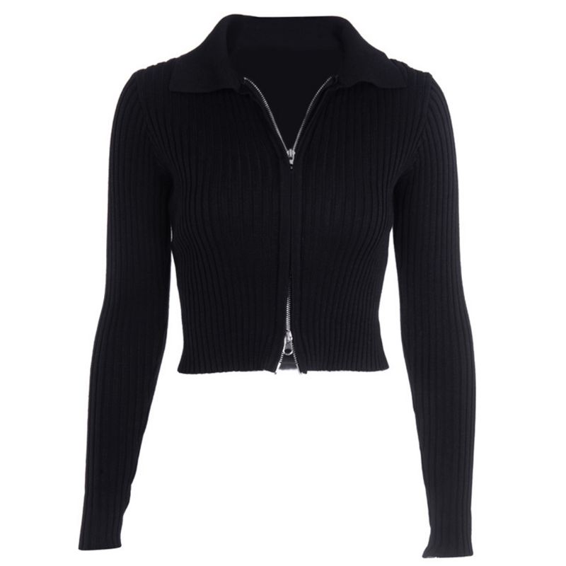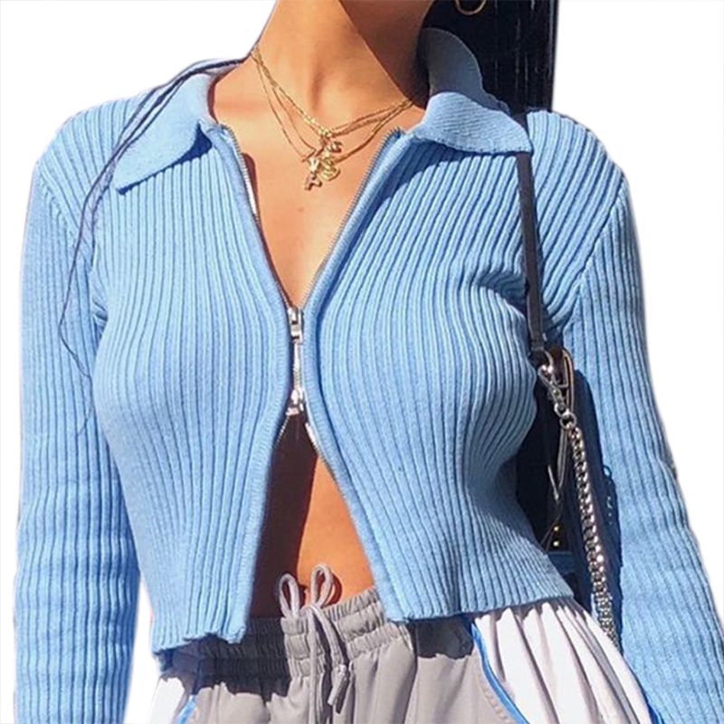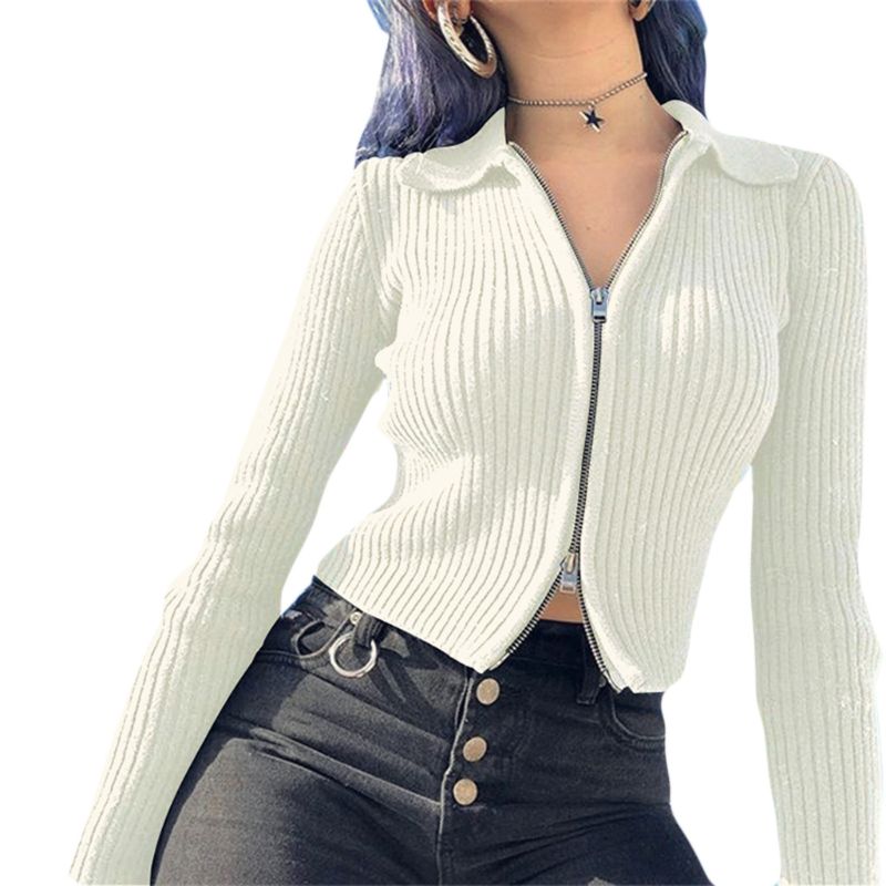 Женский Осенний вязаный свитер в рубчик с длинным рукавом, двусторонняя молния, сексуальный облегающий укороченный топ, однотонное пальто с воротником с лацканами