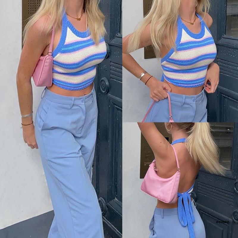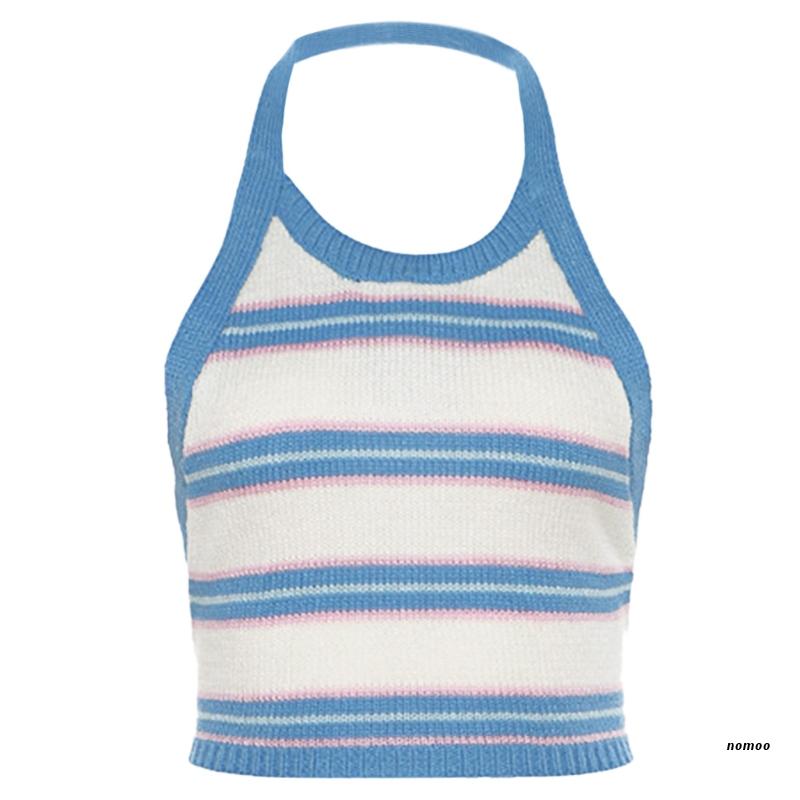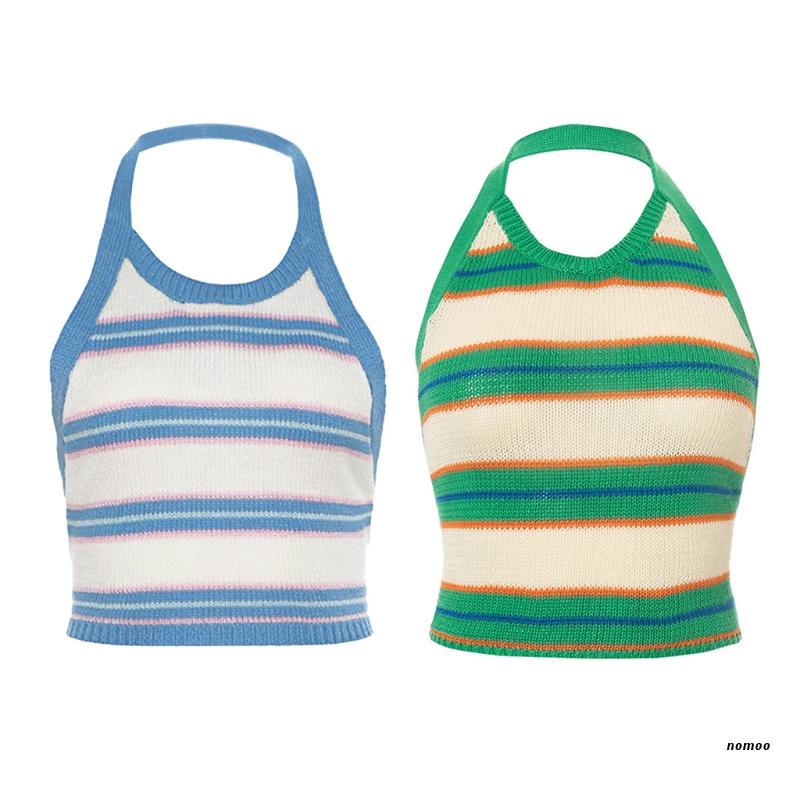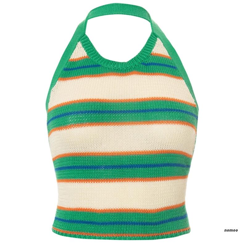Женский летний сексуальный укороченный топ на бретельках без спинки Harajuku разноцветная полосатая тонкая кофточка пляжная Повседневная вязанная вязаная мини майка