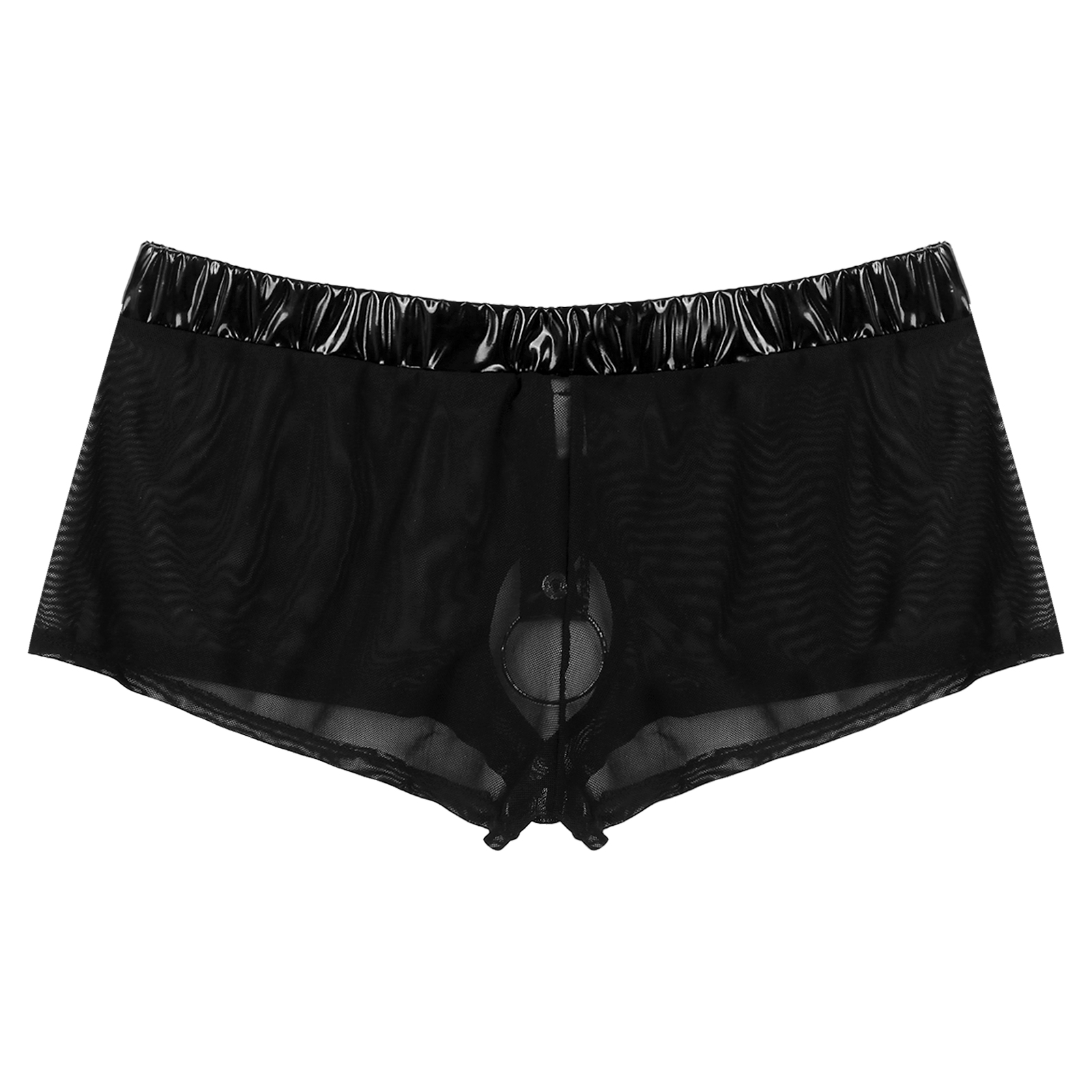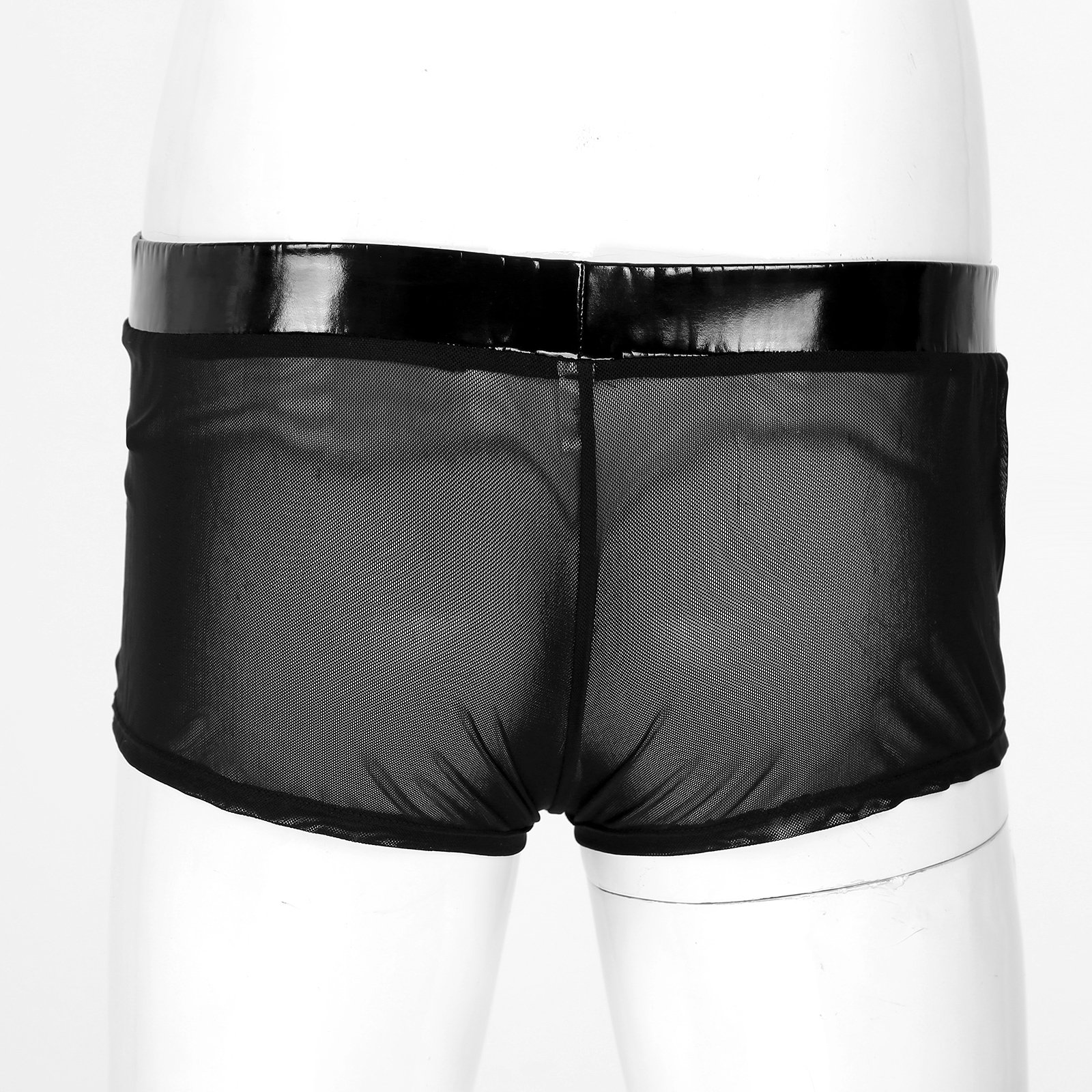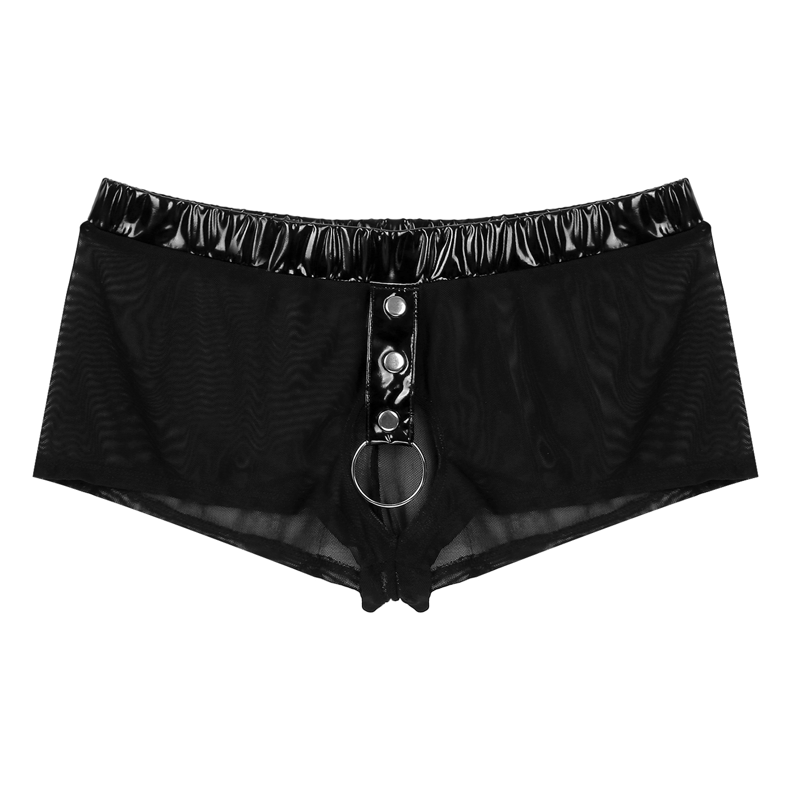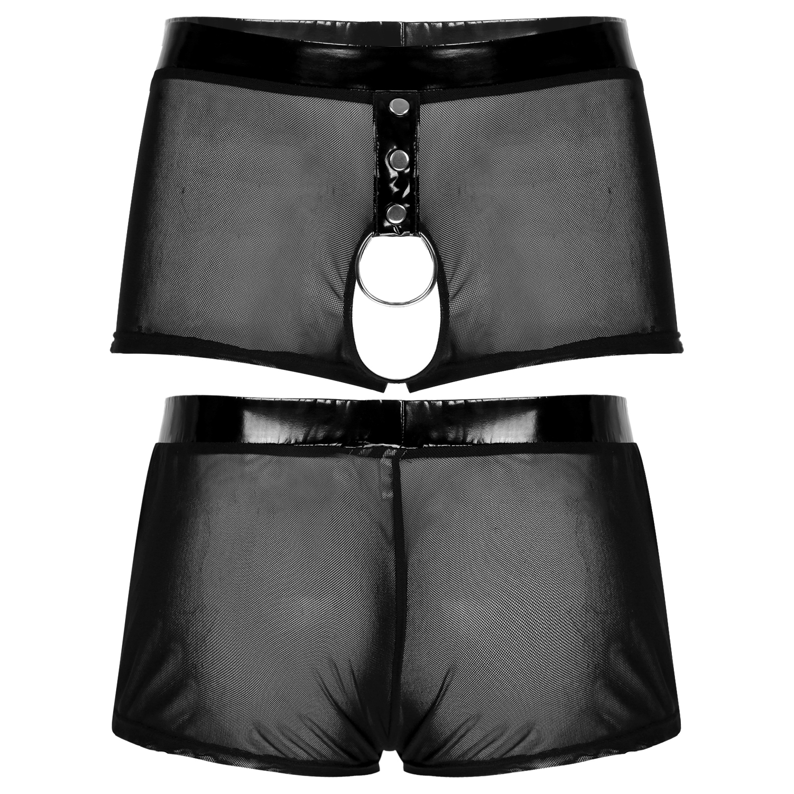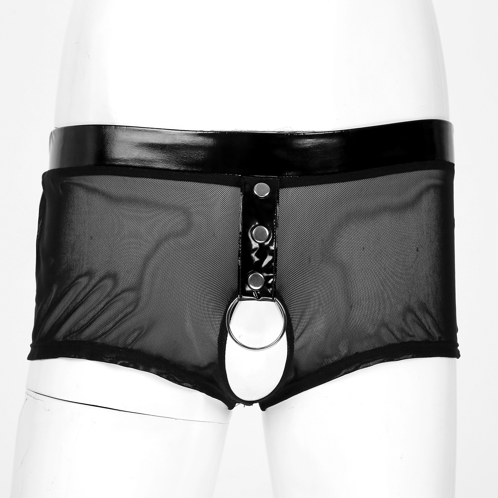 Мужские прозрачные сетчатые трусы-боксеры с О-образным кольцом; Трусы-боксеры из лакированной кожи с поясом без косточек.