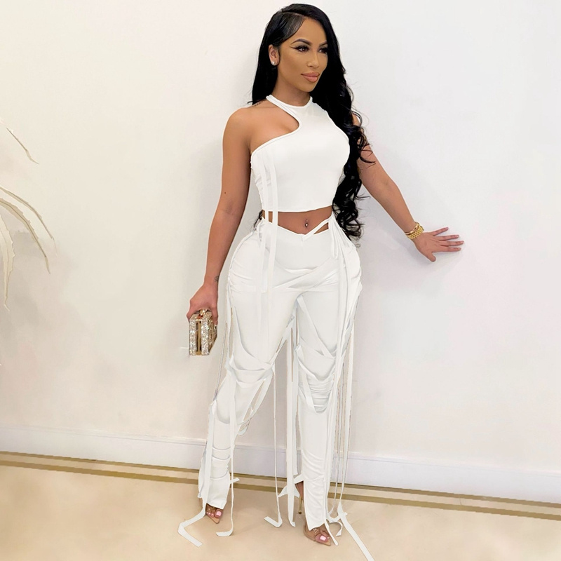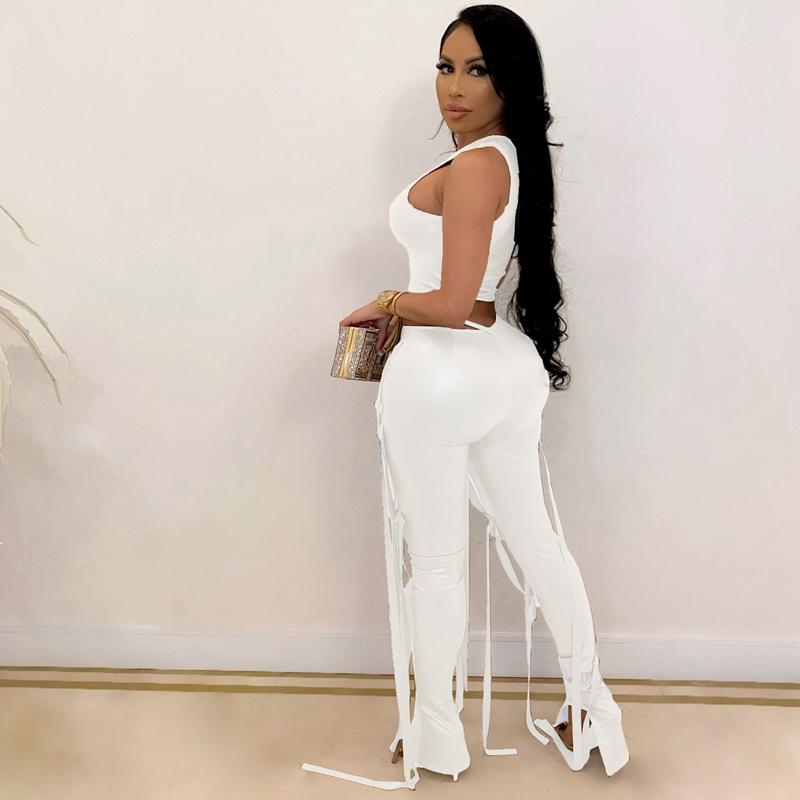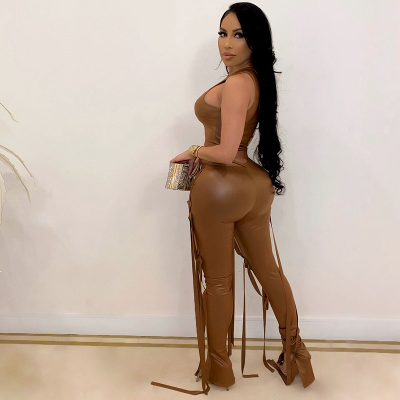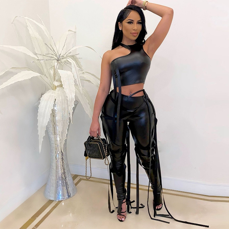 CHRONSTYLE Sexy PU Leather 2 Piece Set One Strap Tube Crop Top Women Suits Tassels Pants Sweatpants Summer Outfits Clubwear 2021