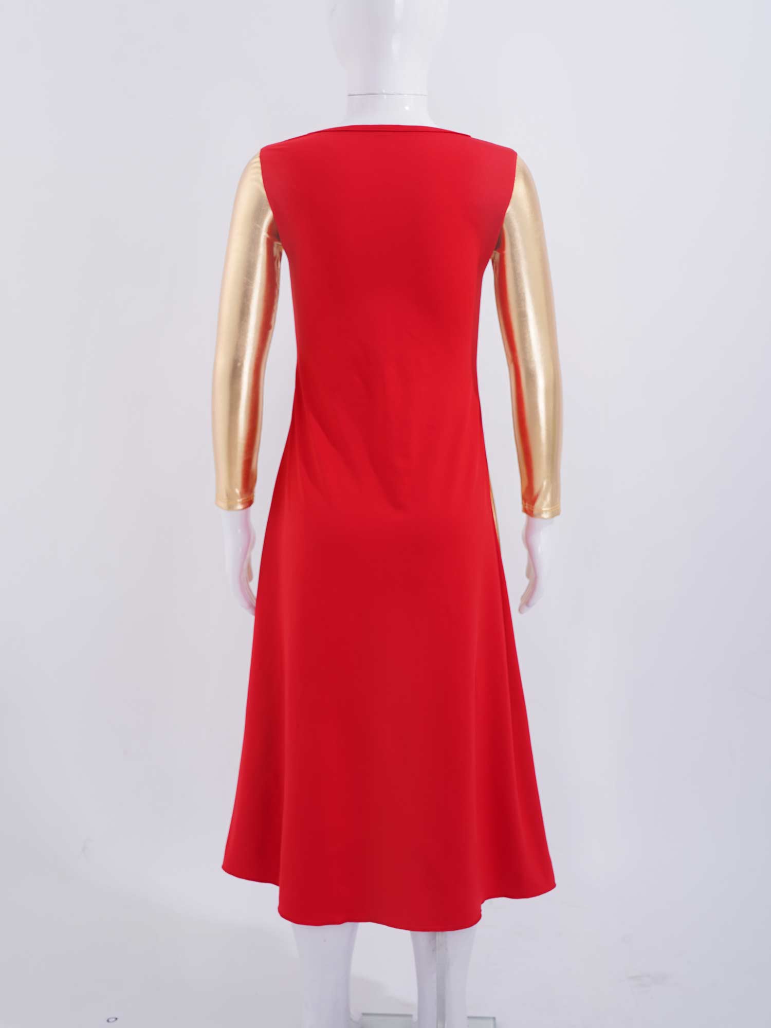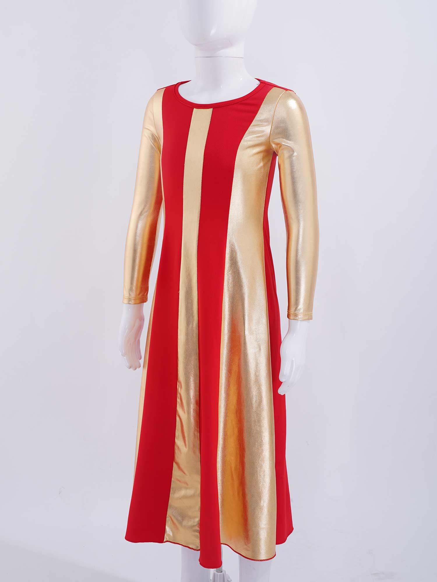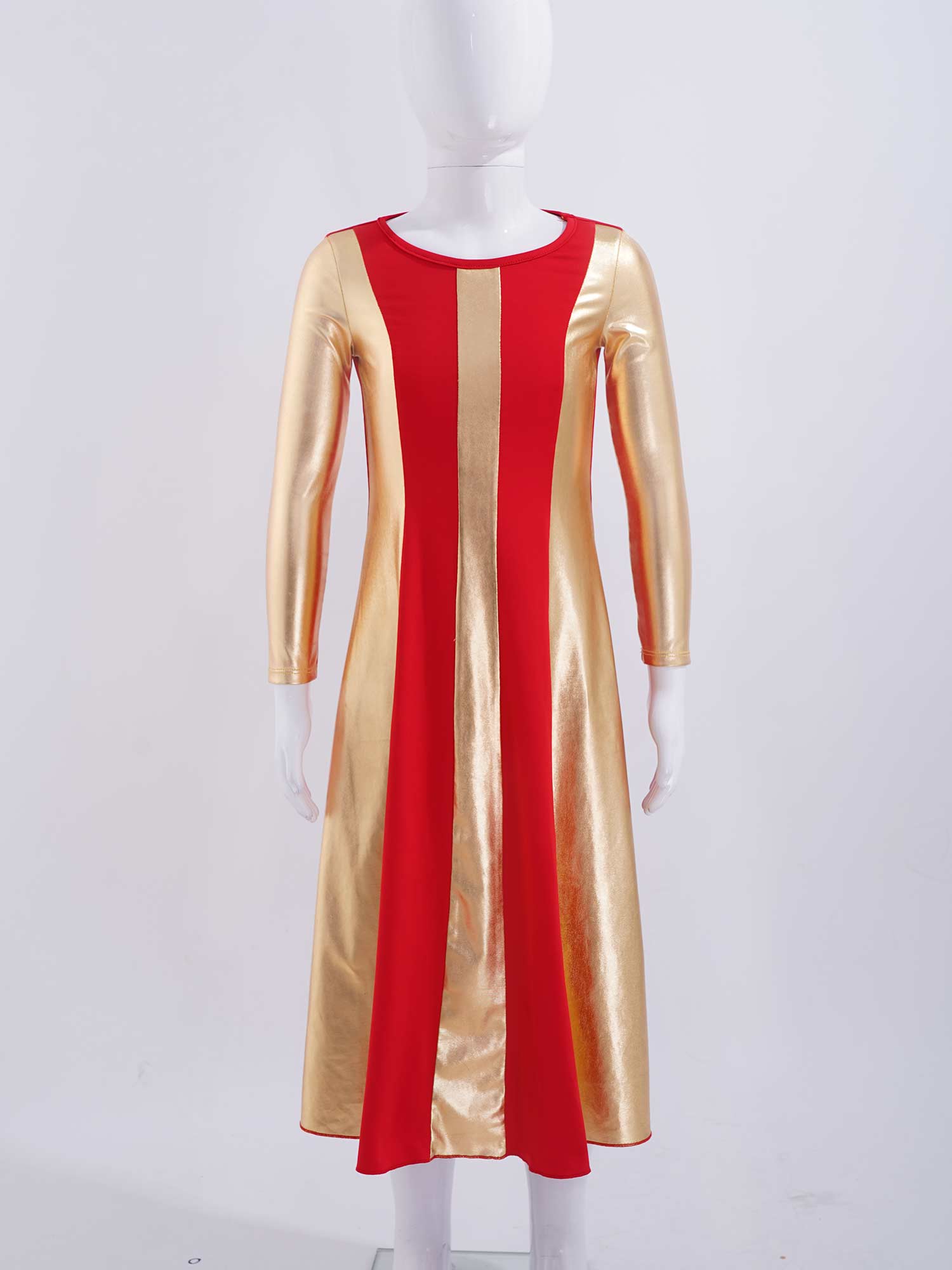 The dress features with long sleeve and regular round neckline, bronzing cloth patchwork style.