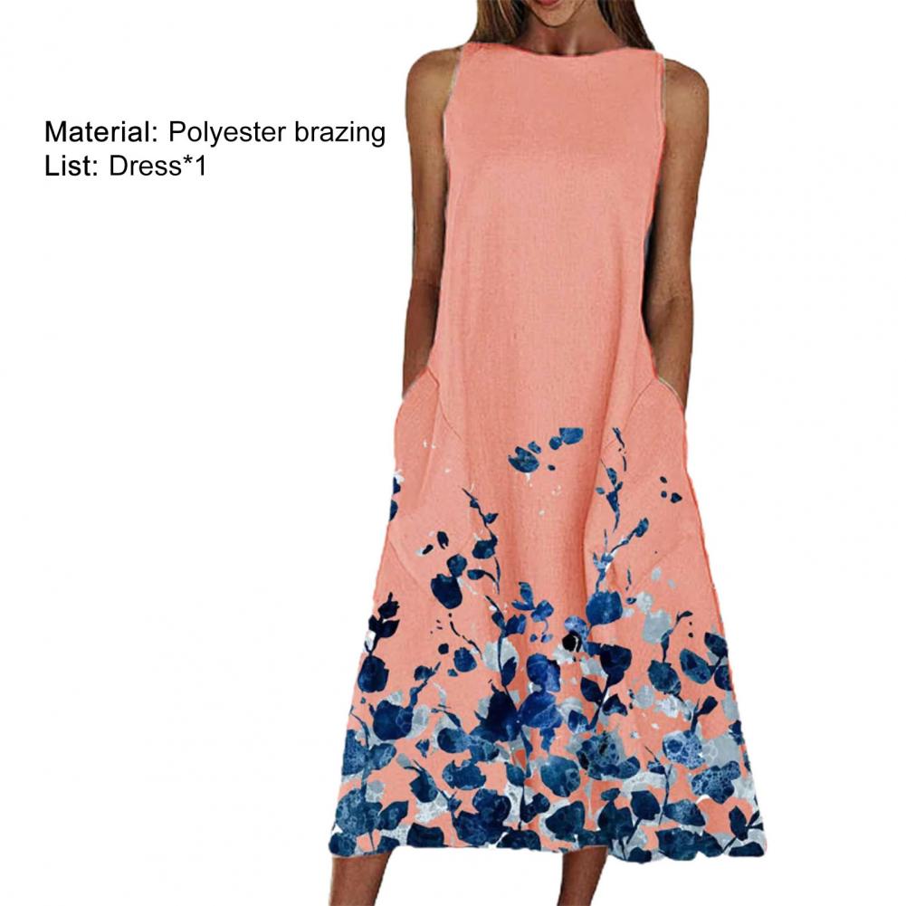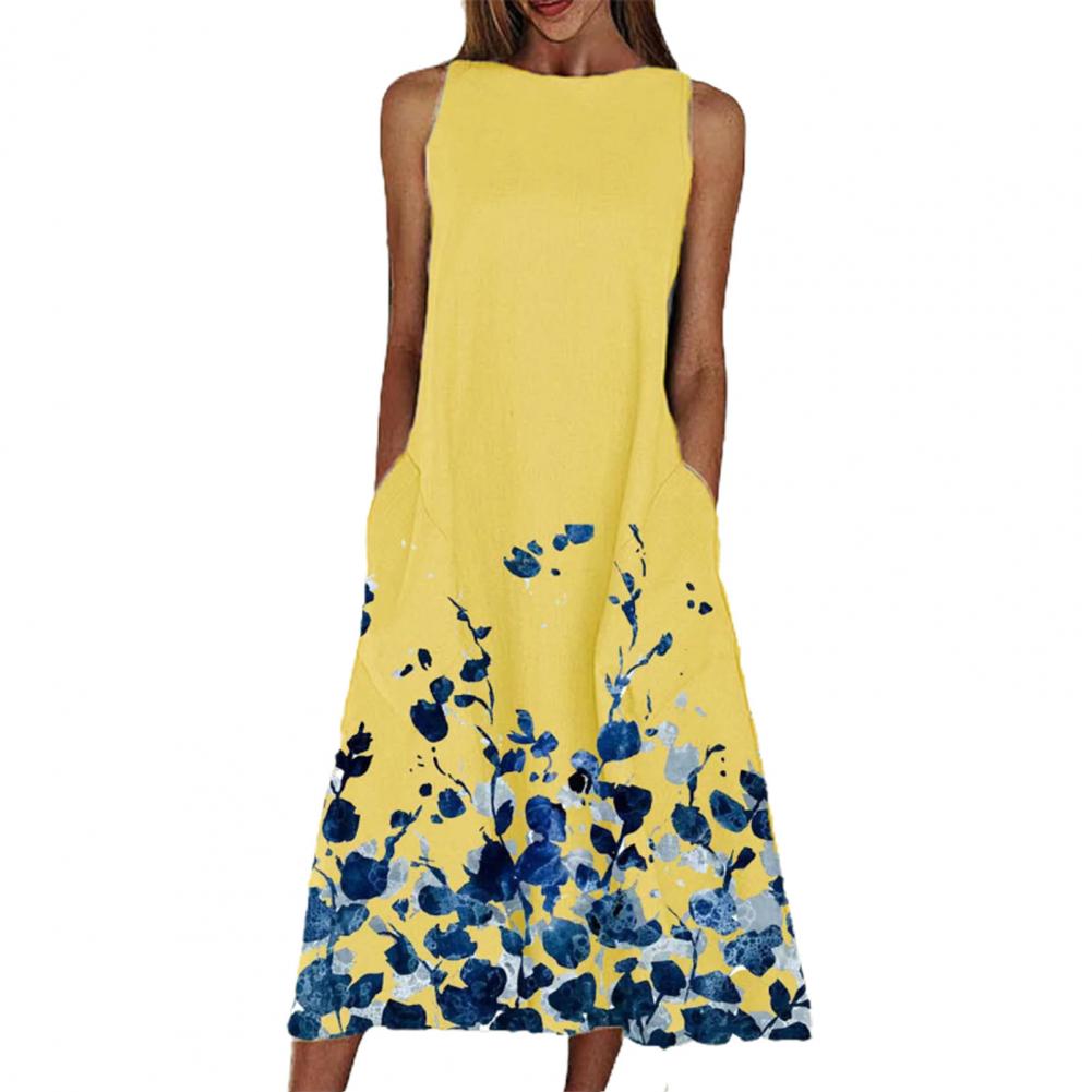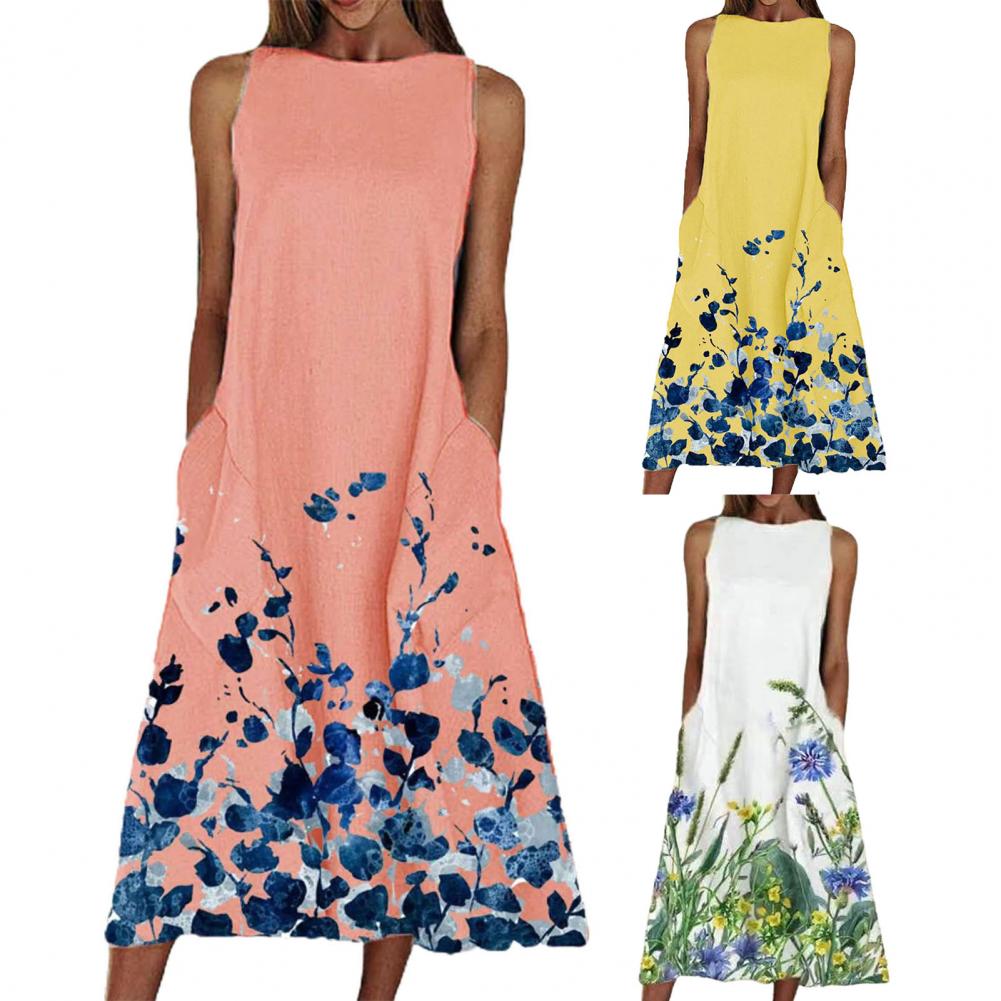 Новинка 2021, женское платье с цветочным принтом, без рукавов, ТРАПЕЦИЕВИДНОЕ длинное платье миди с круглым вырезом, сарафан для пляжа