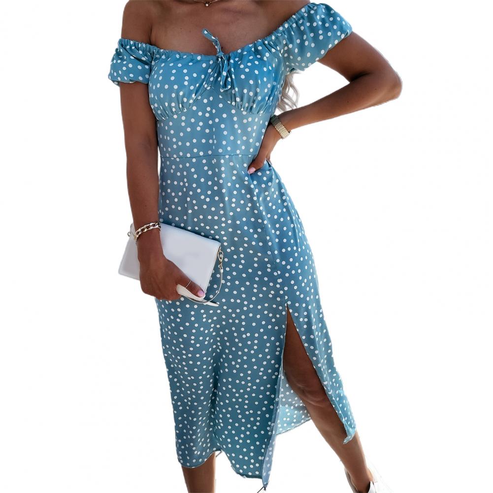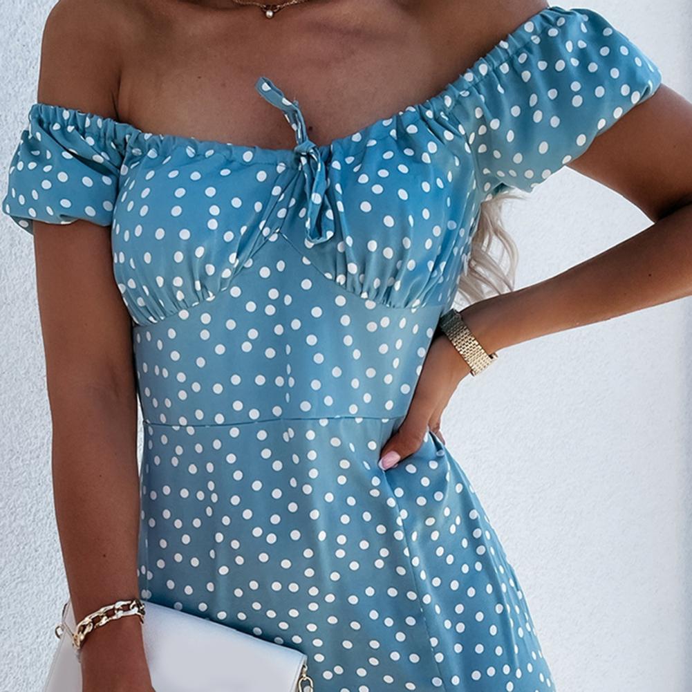 Эластичный вырез позволяет носить платье двумя способами. Печать в горошек и цветочный принт делают это платье очень уникальным.
