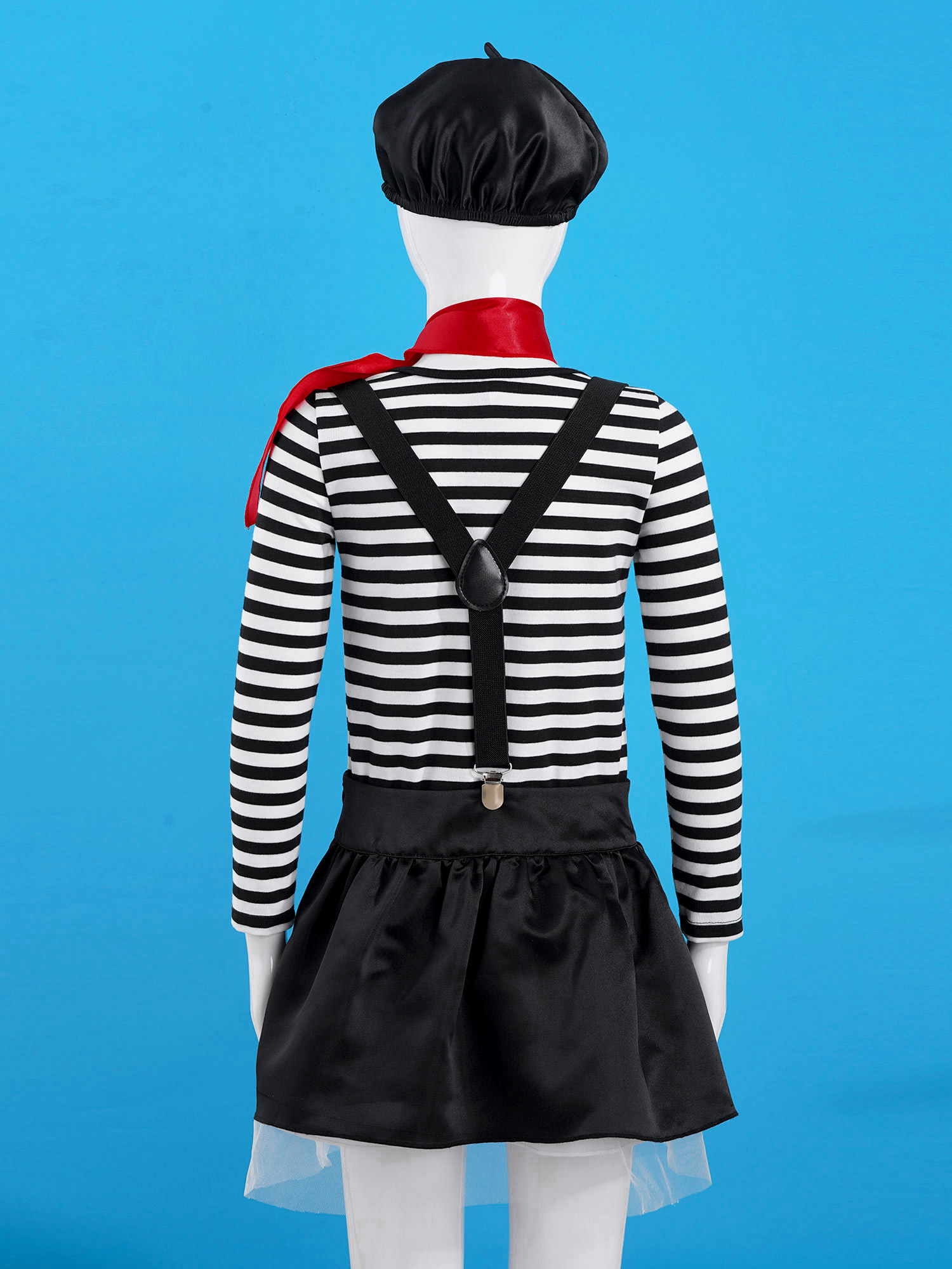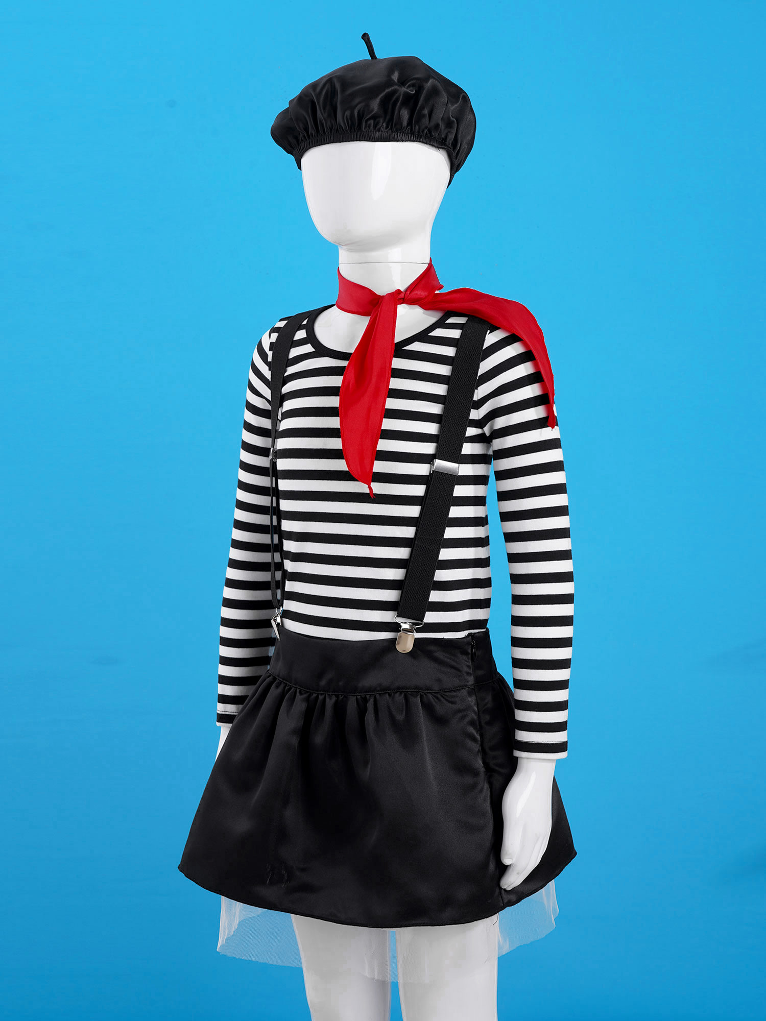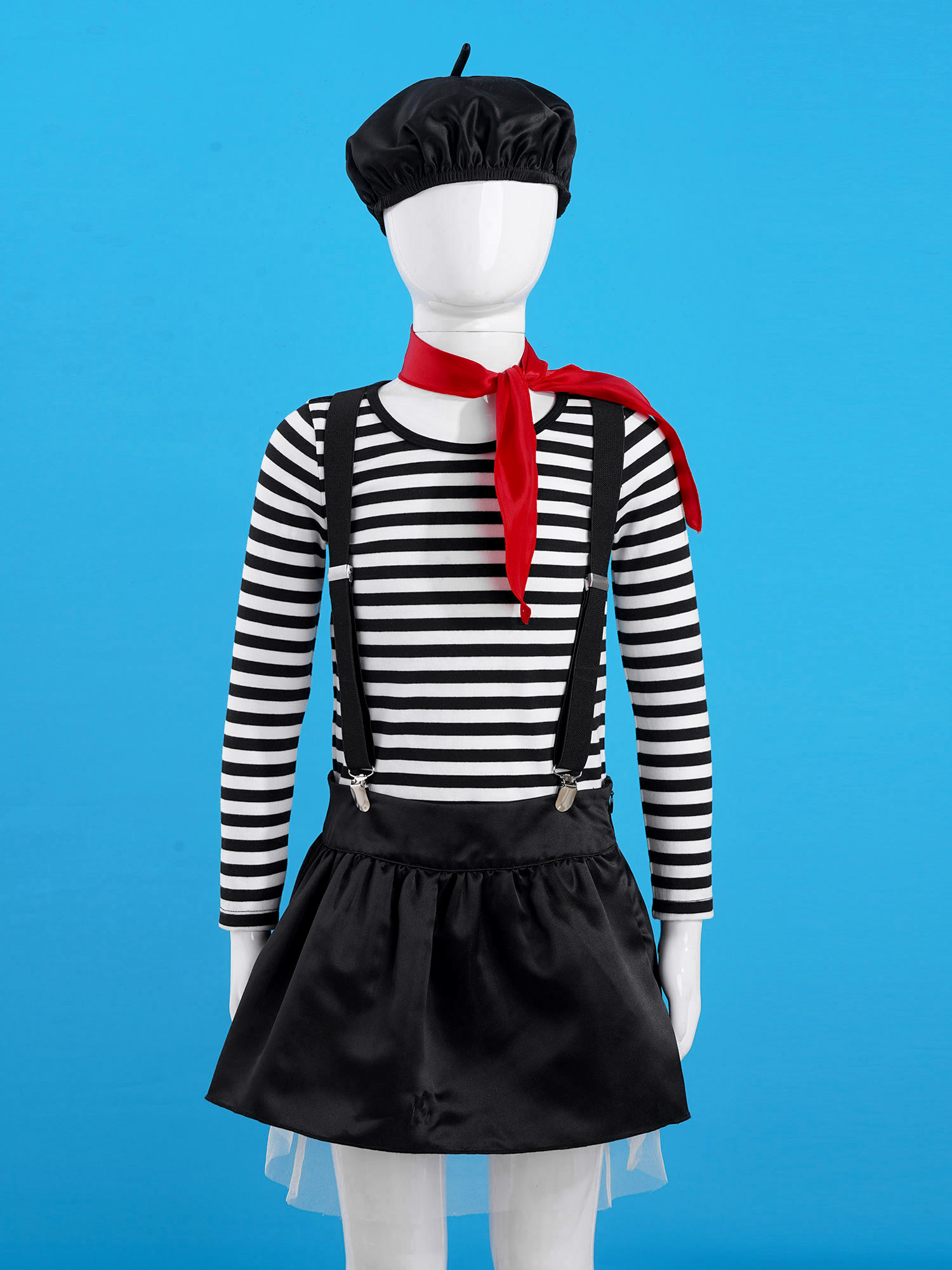 Детский костюм МИМ для девочек; Топы в полоску с принтом; Юбка со съемными Подтяжками; Шарф; Берет; Шапка и перчатки; Комплект.