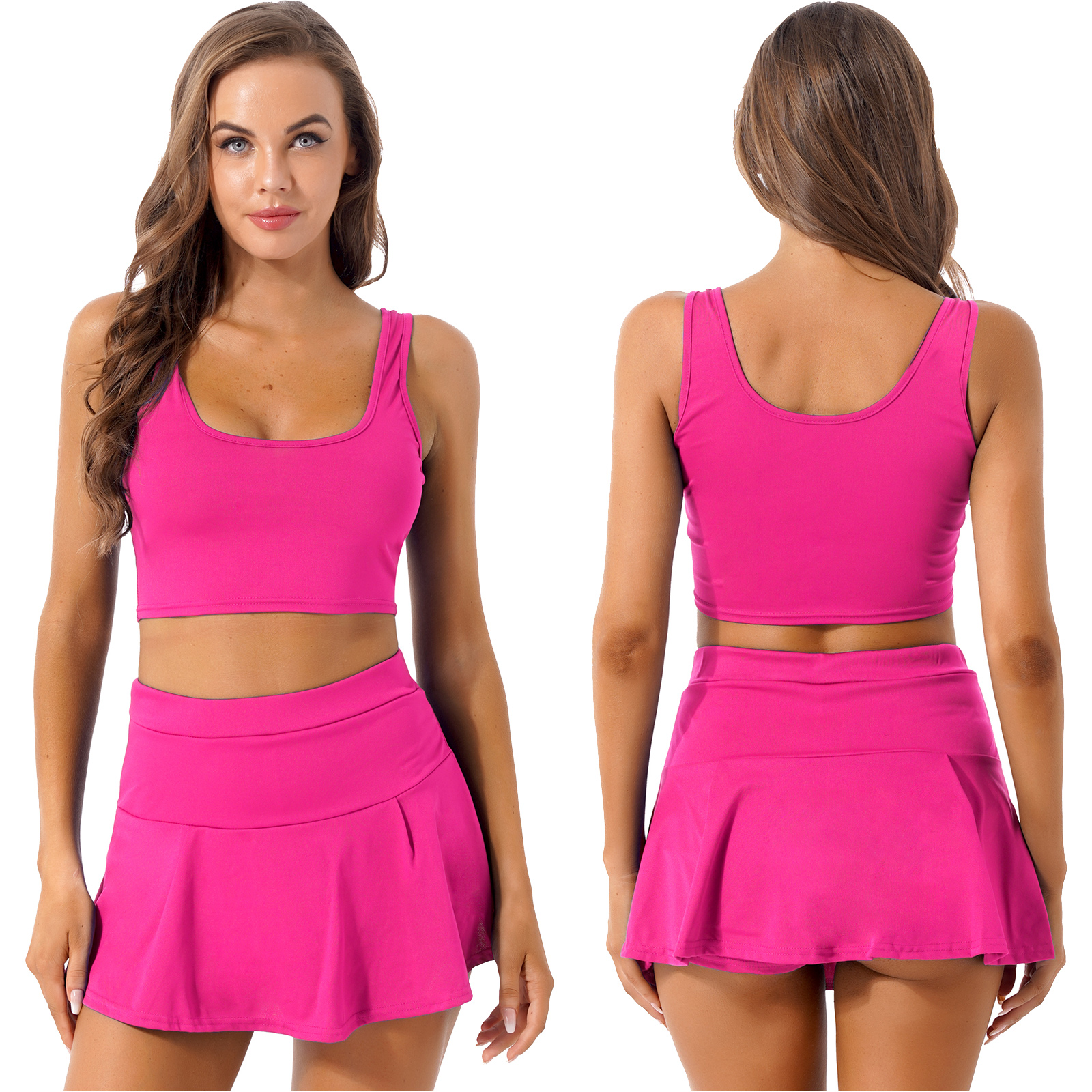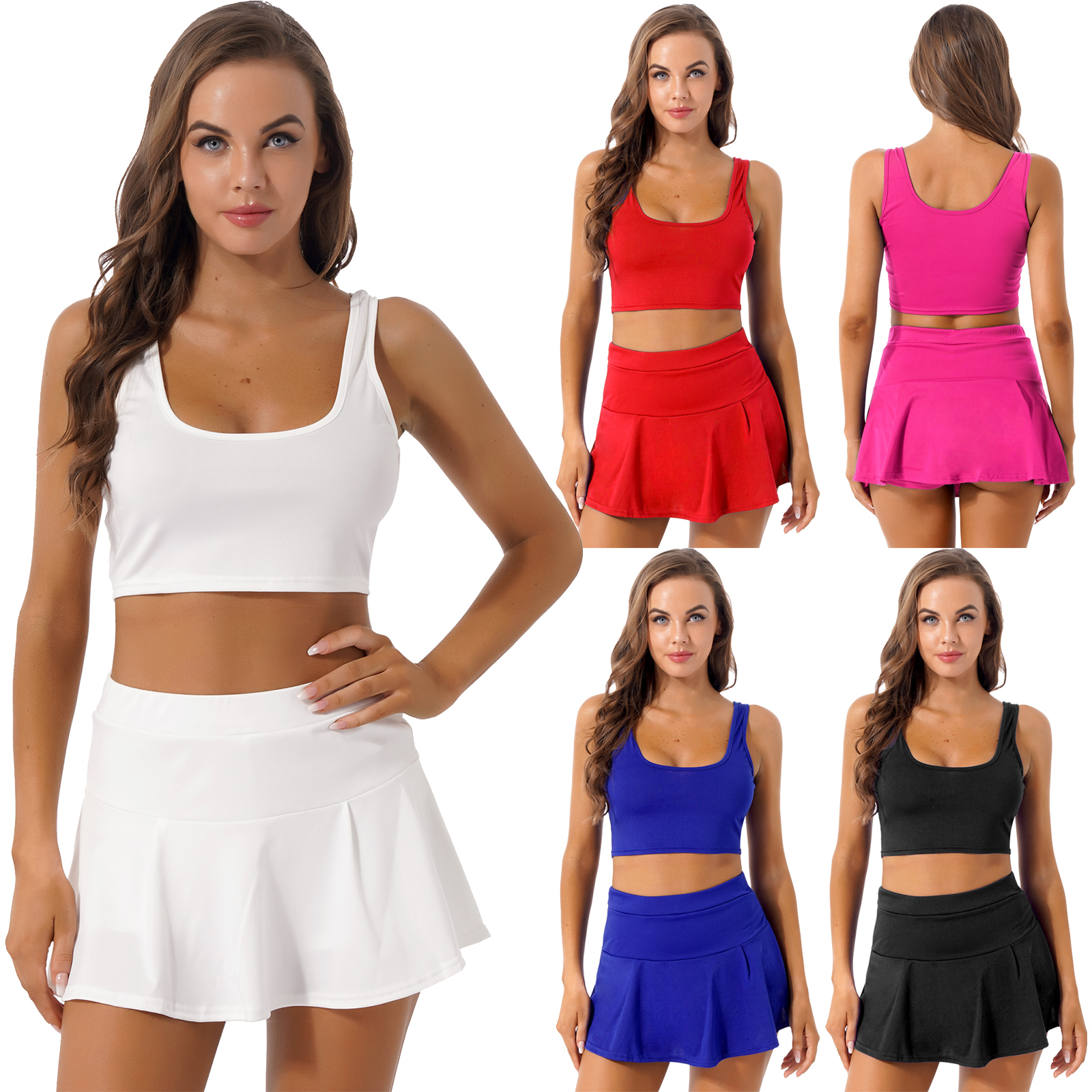 Женские однотонные Цвет Чирлидинг наряд-Униформа U образным вырезом укороченный топ без рукавов плиссированные мини-юбки.