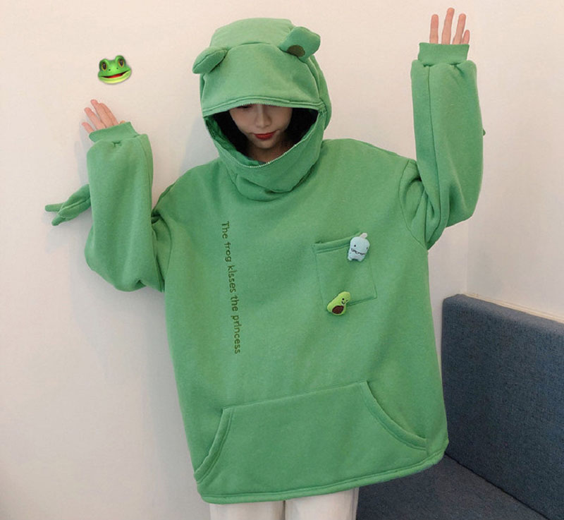 Женские толстовки большого размера, милые свободные топы с длинными рукавами и принтом для влюбленных, повседневные теплые пуловеры с высоким воротником и карманом в виде головы лягушки Y2k