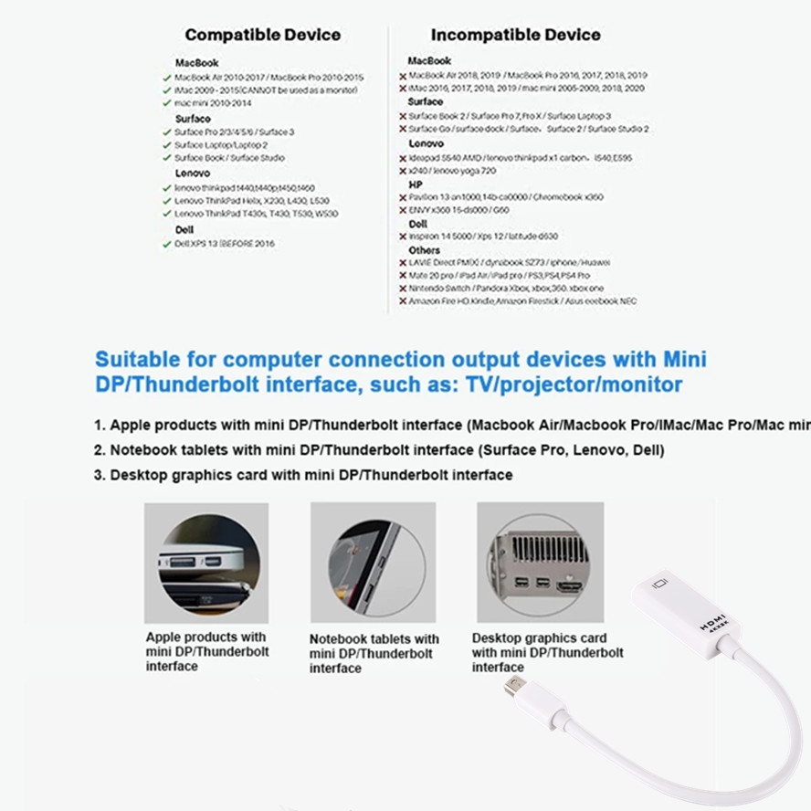 ◆ MacBook / MacBook Pro / MacBook Air / Apple iMac 21,5/27 дюймов, Lenovo X1, Dell XPS, а также оснащен мини-дисплеем интерфейс, другие бренды ноутбуков или видеокарт с hdmi-совместимым разъемом HDTV, монитором, проектором, ЖК-дисплеем, подключенным светодиодным дисплеем!