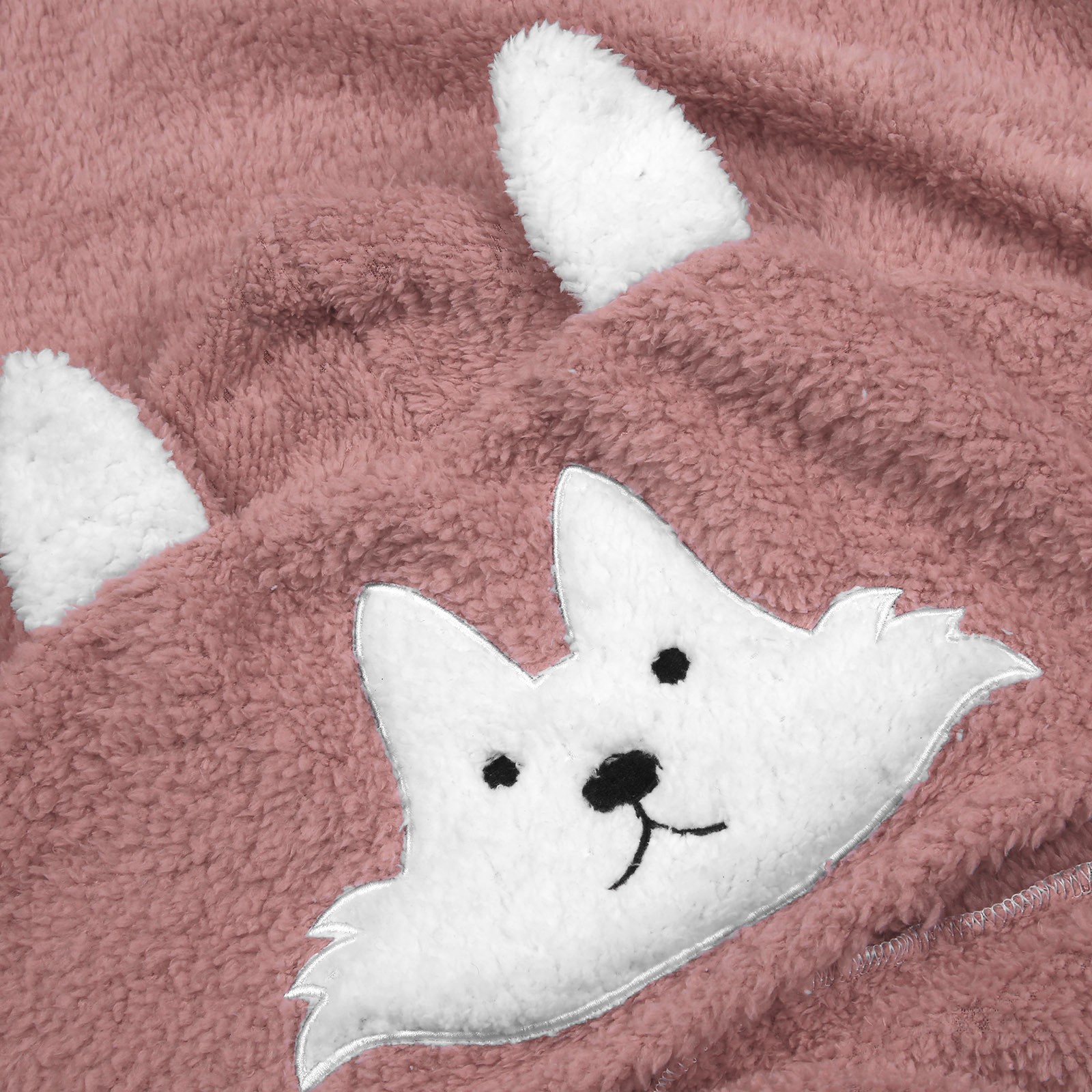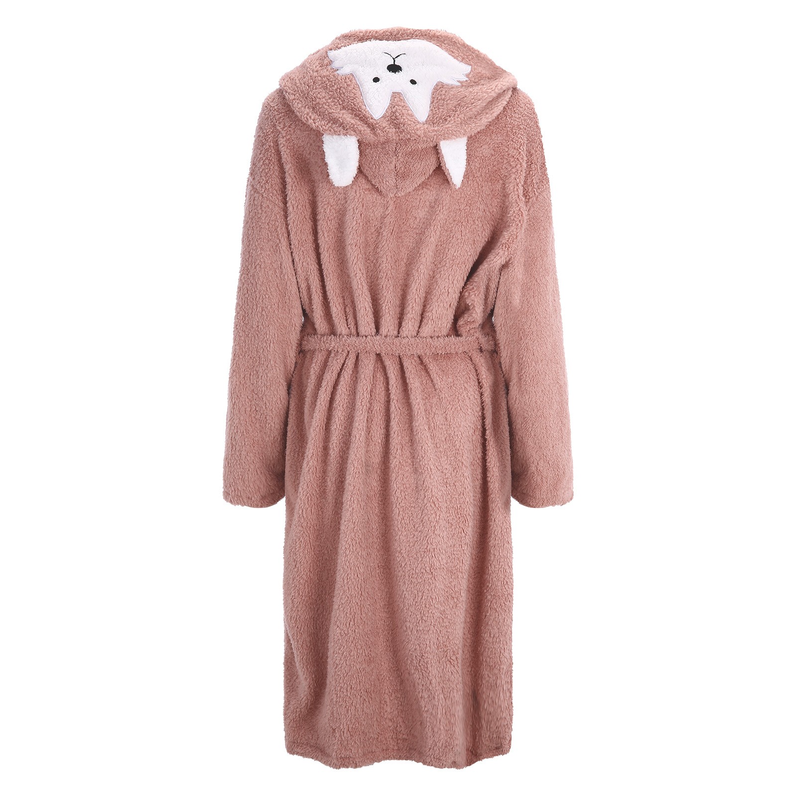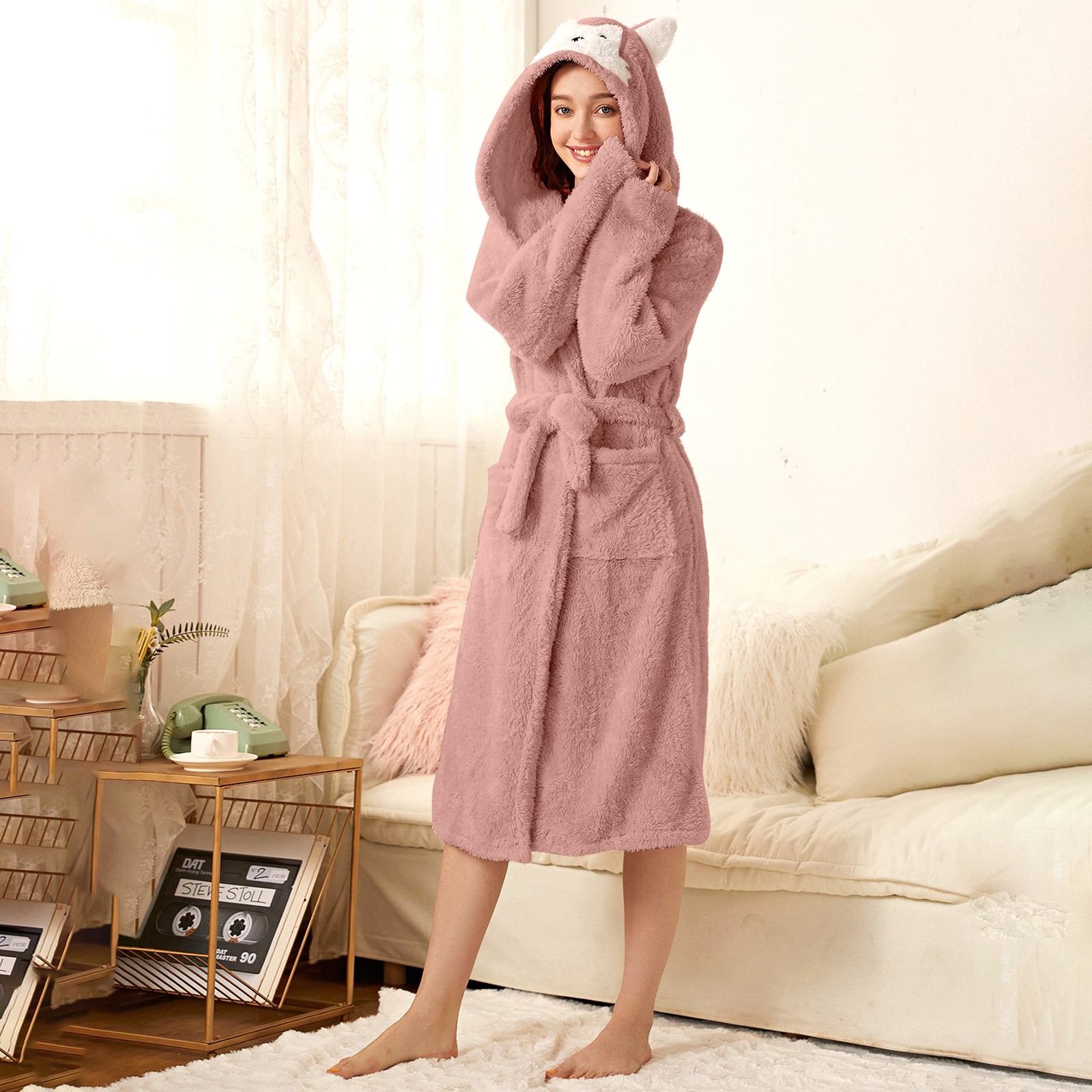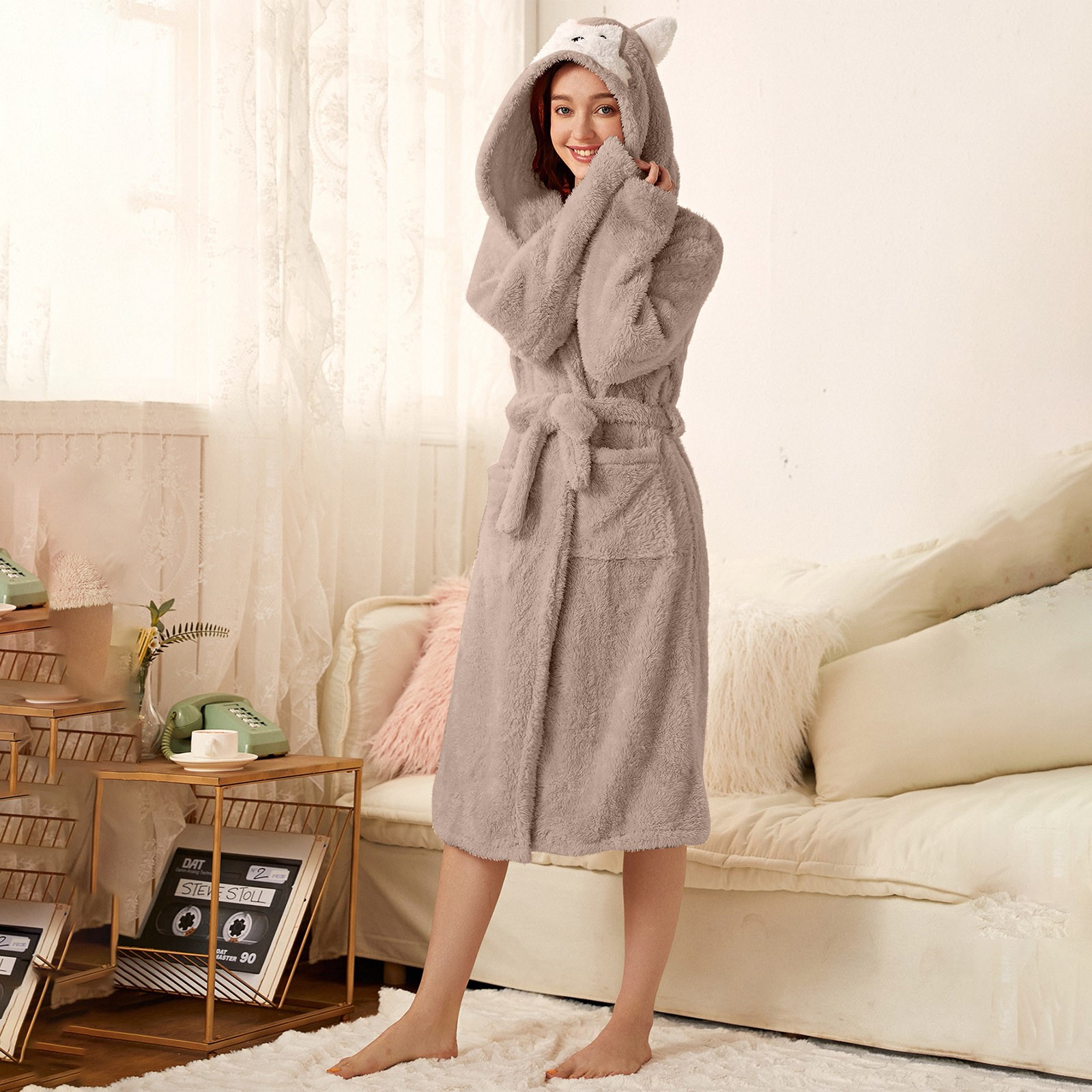 Women'S Double Pocket 3d Ear Hooded Flannel Bathrobe Soft And Warm Double-Faced Velvet Bathrobe Pajamas And Home Wear